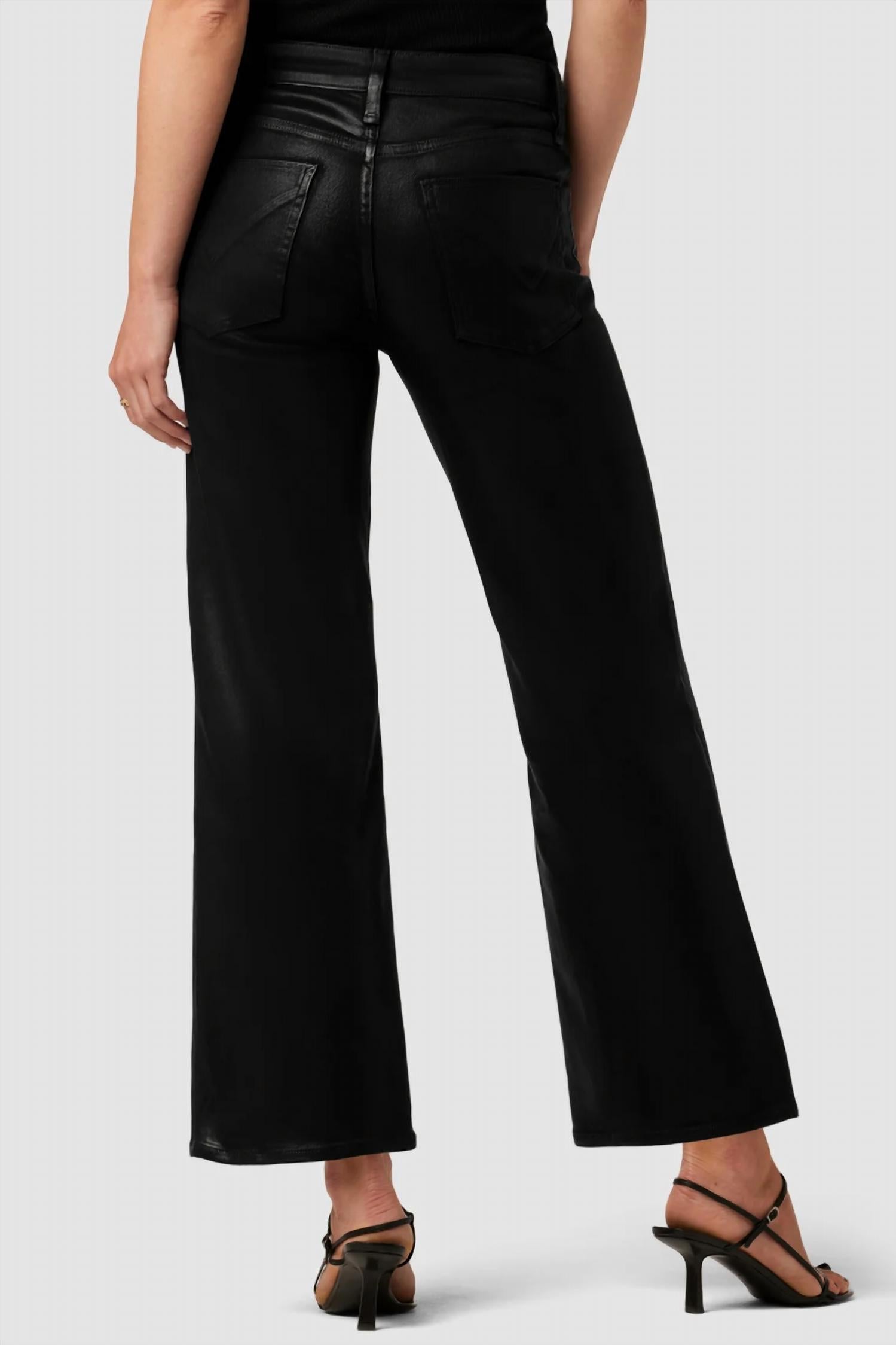 The perfect cropped jean for those transitional seasons. Elevate your style with Hudson's Rosie High Rise Wide Leg Ankle Jeans in a stunning Coated Black finish. These jeans are crafted from a premium cotton blend, featuring a high-rise waist and a relaxed, wide-leg fit that captures a '70s-inspired look. The design includes a 27.5-inch inseam and a sleek button closure, giving a polished silhouette with a solid pattern. Care is easy with machine wash cold instructions, tumble dry low or hang to dry, making them ideal for minimalist, travel-friendly outfits.