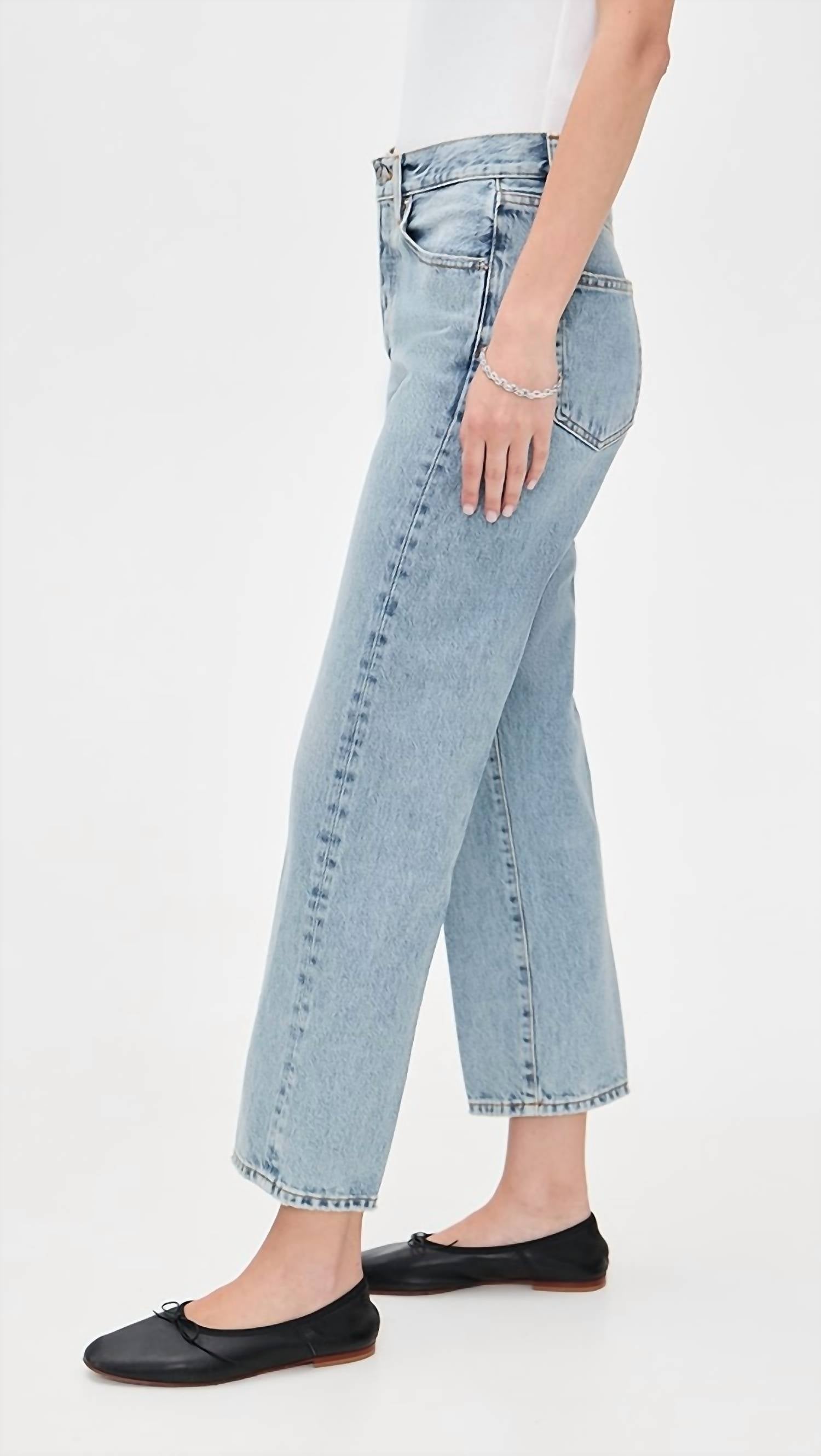 We especially love this cropped jean with a cute pair of slides or sandals. Discover the FRAME Vertical Crop Jean in Scheme, a minimalist addition to your wardrobe with a high-rise waist. Crafted from 100% regenerative cotton, this mid-weight, non-stretch denim ensures both durability and comfort. Featuring a relaxed fit, straight leg, and light wash, it incorporates a button fly and 5-pocket styling for a classic appeal. With an inseam of 26.5 inches and rise of 10.75 inches, these jeans are perfect for spring holiday parties. Care: Machine wash cold.