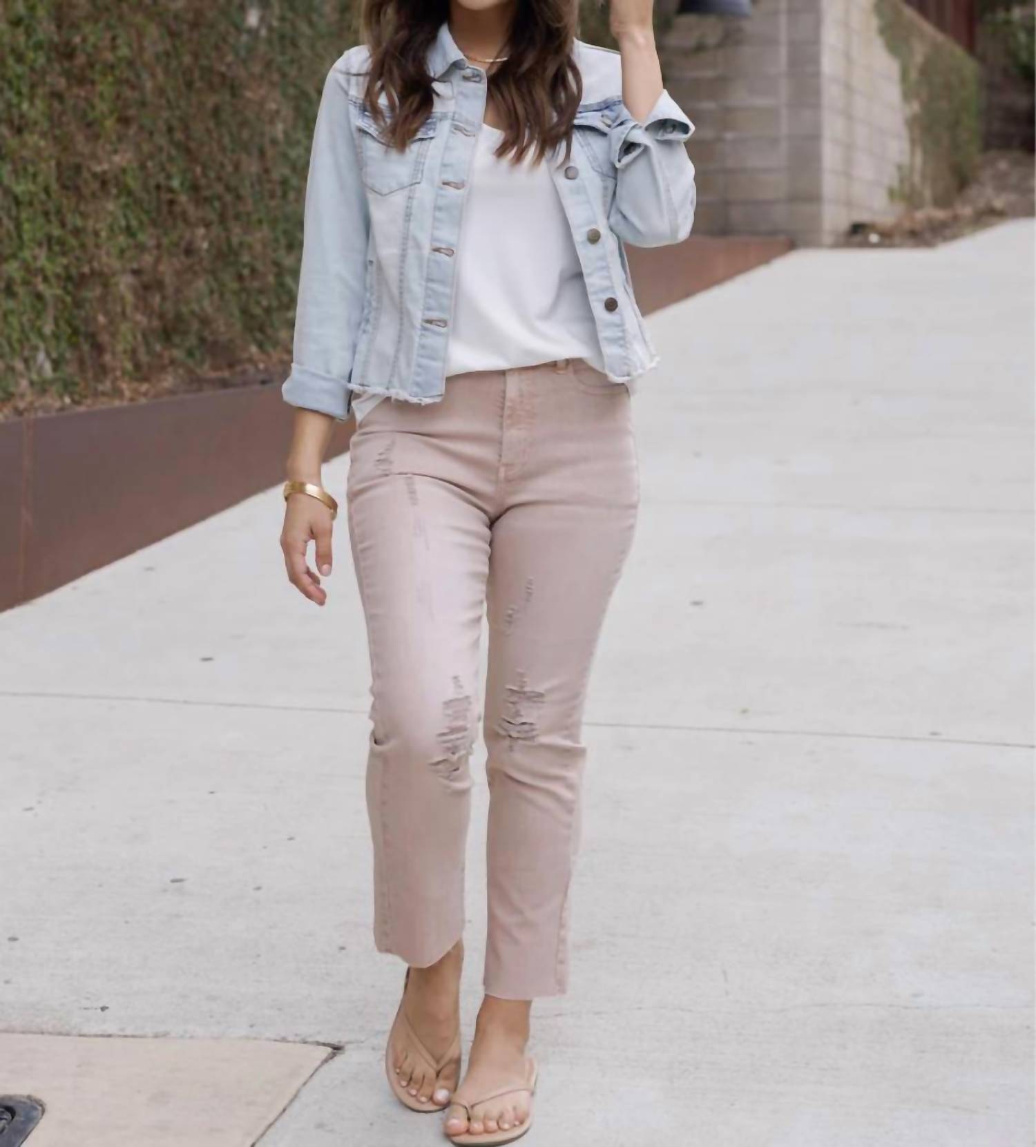 The perfect cropped jean for those transitional seasons. Discover the Distressed Cropped Straight Leg Denim Jeans by Grace and Lace, a perfect addition to your spring wardrobe in a trendy blush shade. These women's jeans offer a comfortable relaxed fit with a higher mid-rise waist, complete with functional front and back pockets. Crafted from a cotton blend (68% Cotton, 27% Polyester, 3% Viscose, 2% Spandex), they feature a stylish raw hem and light distressing for a chic appearance. Closure: Zip closure. Care: Machine wash inside out cold separately, use mild detergent, do not bleach, tumble dry low, warm iron.