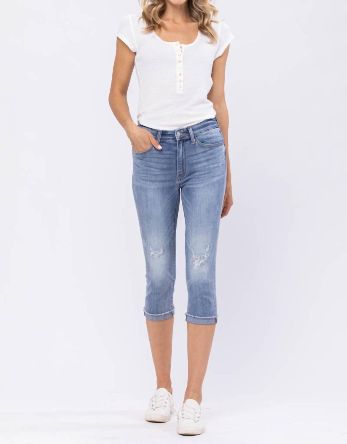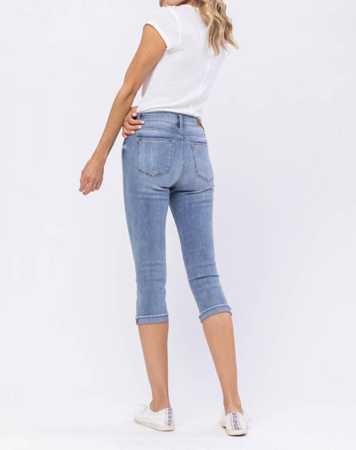 The perfect cropped jean for those transitional seasons. Judy Blue presents the Mid Rise Lite Wash Destroyed Skinny Fit Capri, a summer-ready essential that offers style and comfort. Crafted from a soft and stretchy blend of 66% Cotton, 11% Rayon, 21% Poly, and 2% Spandex, these light blue denim capris feature a distressed finish with a raw cuff hem. The mid-rise fit has a 9.5" rise and a 20" inseam, providing a flattering skinny silhouette. Designed with practical pockets and a zip closure, these pants are ideal for a variety of occasions; machine wash and tumble dry for effortless care.
