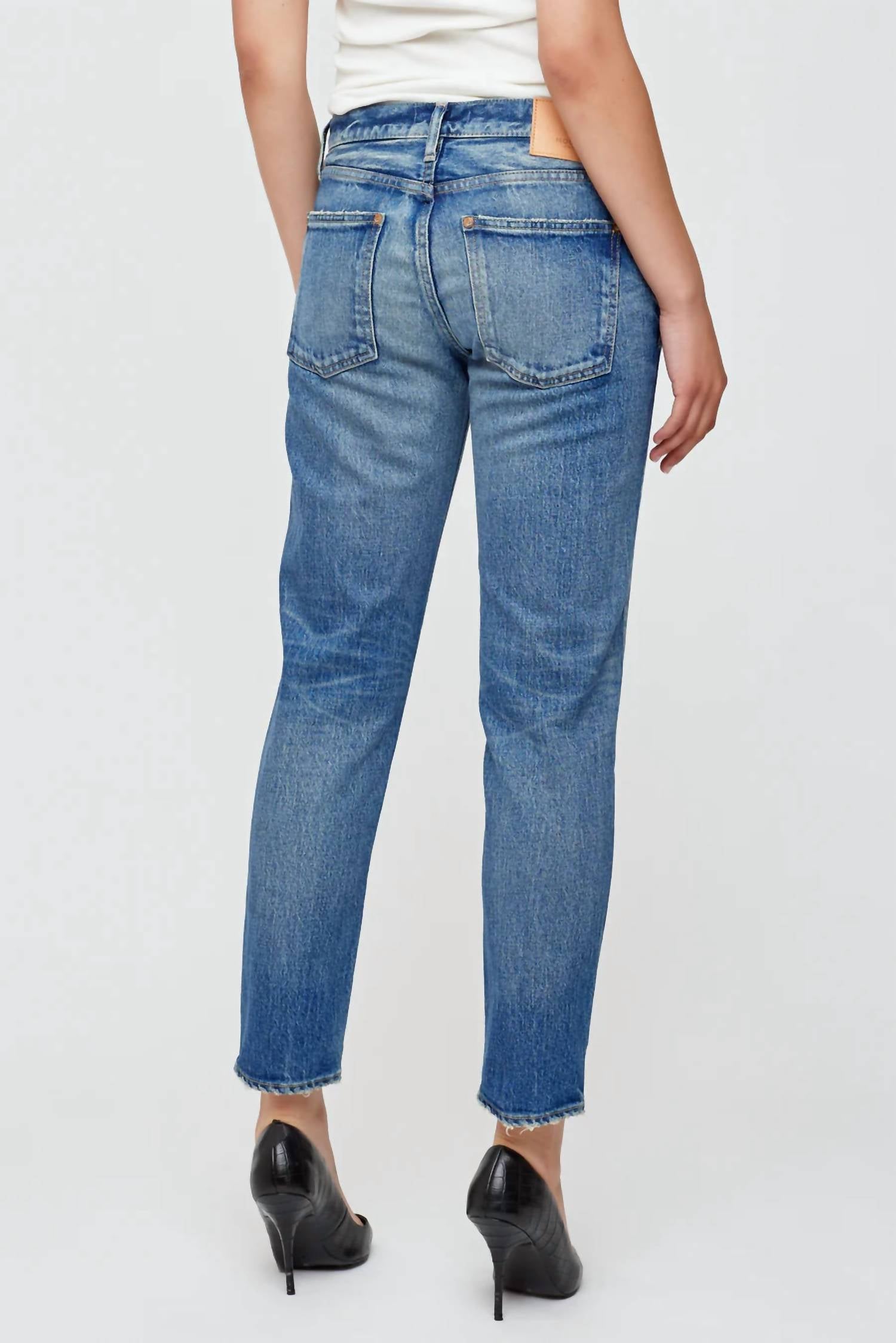 The perfect cropped jean for those transitional seasons. Discover the Eldred Tapered Jeans by Moussy, where style meets comfort with their low-rise fit and ankle-length design. Tailored for women in a light blue textured finish, these jeans are made from a heavy weight, light-stretch fabric. Featuring a practical button fly closure and pockets, they are both functional and chic. For easy maintenance, simply machine wash them.