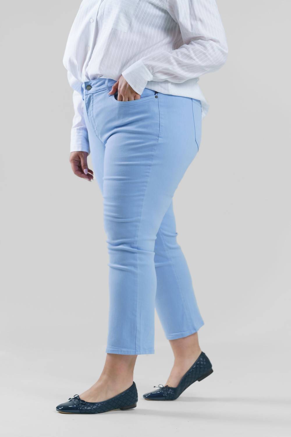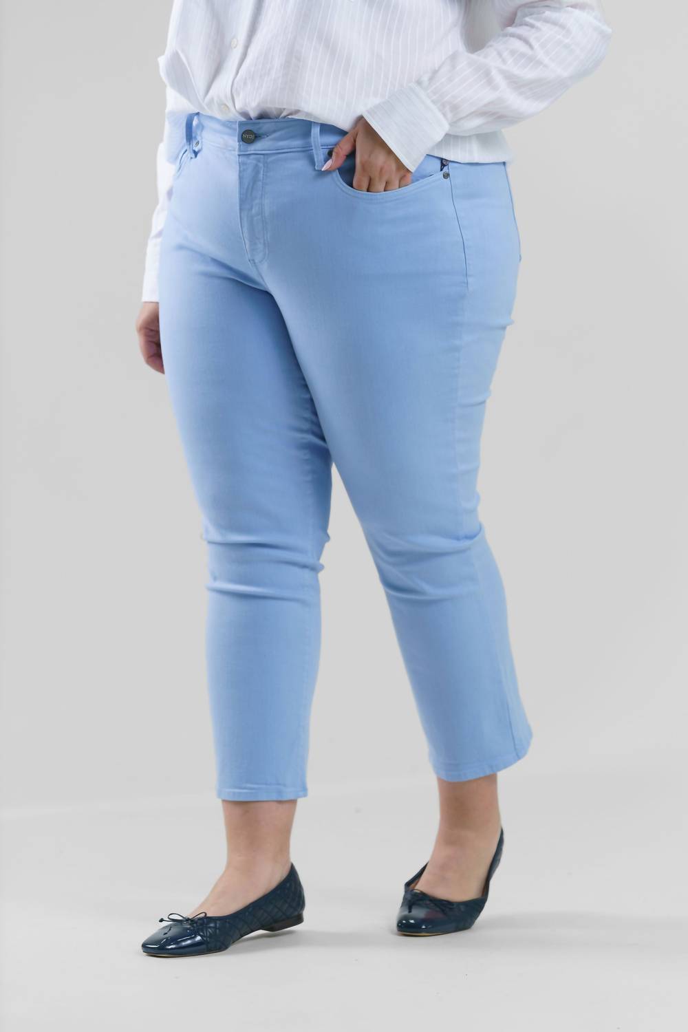 We especially love this cropped jean with a cute pair of slides or sandals. Experience the ultimate in comfort and style with the Marilyn Straight Ankle Jeans by NYDJ, crafted from a Cotton Blend in the shade Clear Sky. These plus-size jeans feature a high-rise, slimming fit with a straight leg and classic five-pocket styling. With a button closure and tailored using eco-friendly methods, these jeans provide a sleek silhouette thanks to NYDJ's signature Lift Tuck® Technology. Ideal for spring occasions, they are machine washable and can be tumble dried.