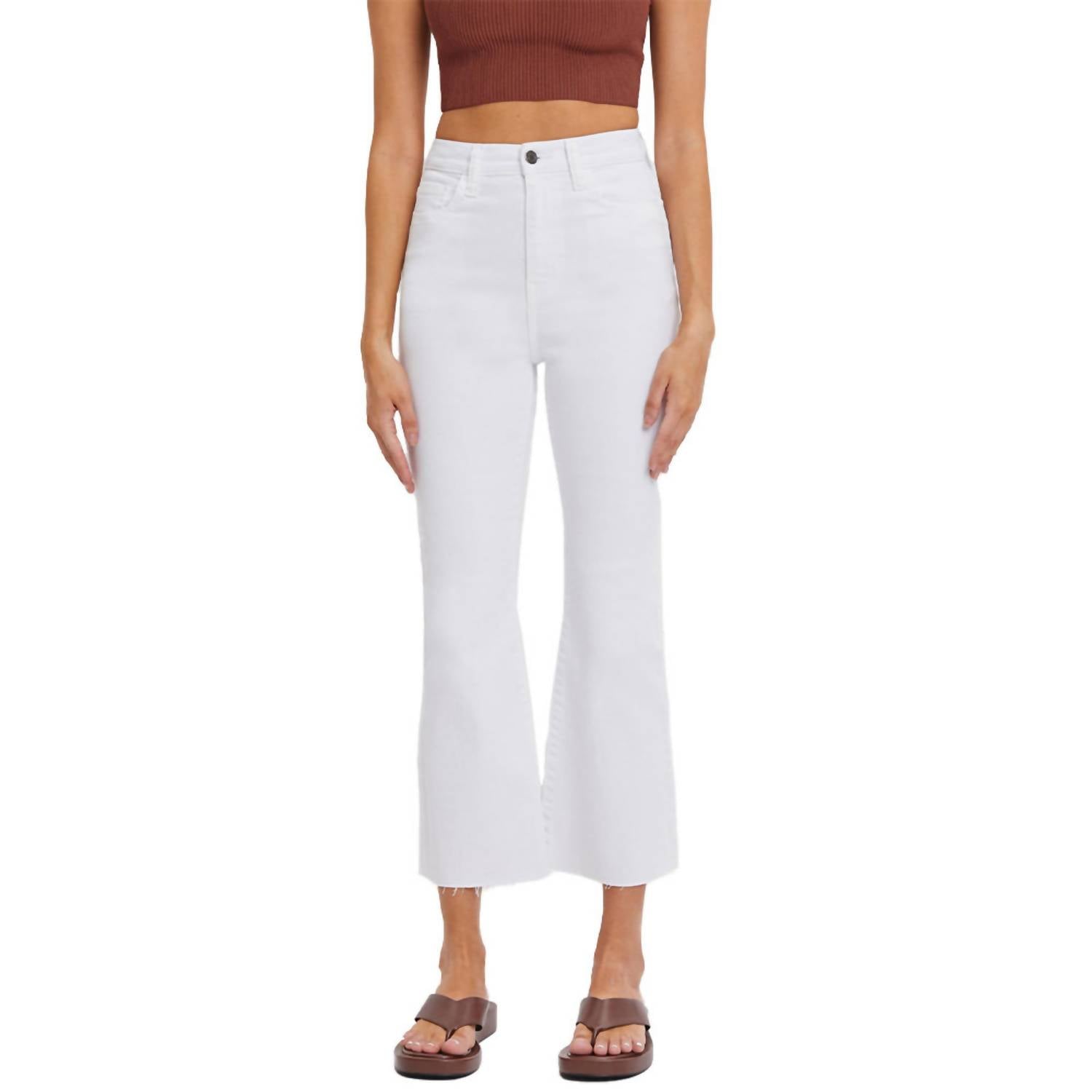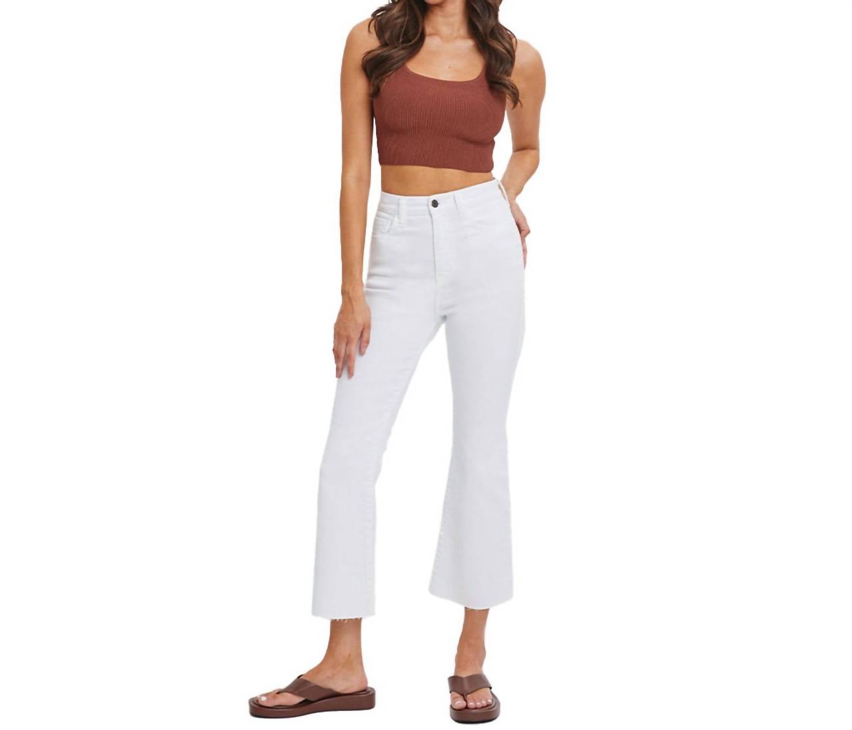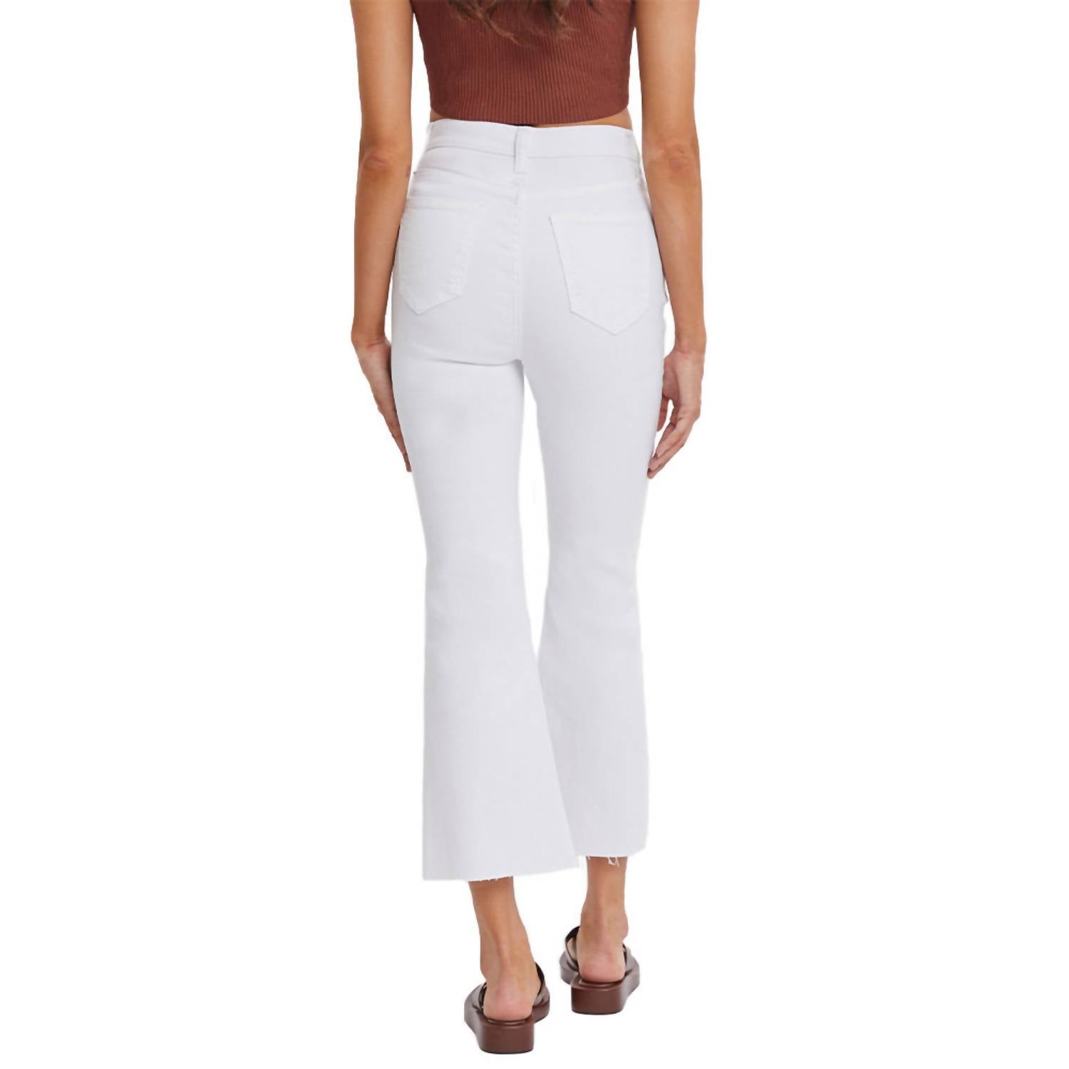 We especially love this cropped jean with a cute pair of slides or sandals. These women's high-rise jeans in classic white boast a solid pattern and a stylish flared leg with a 26-inch inseam and an 11.5-inch front rise. Crafted from a comfortable cotton blend (93% Cotton, 5% Polyester, 2% Spandex), they offer five-pocket styling for added functionality. Zip closure. Machine wash.