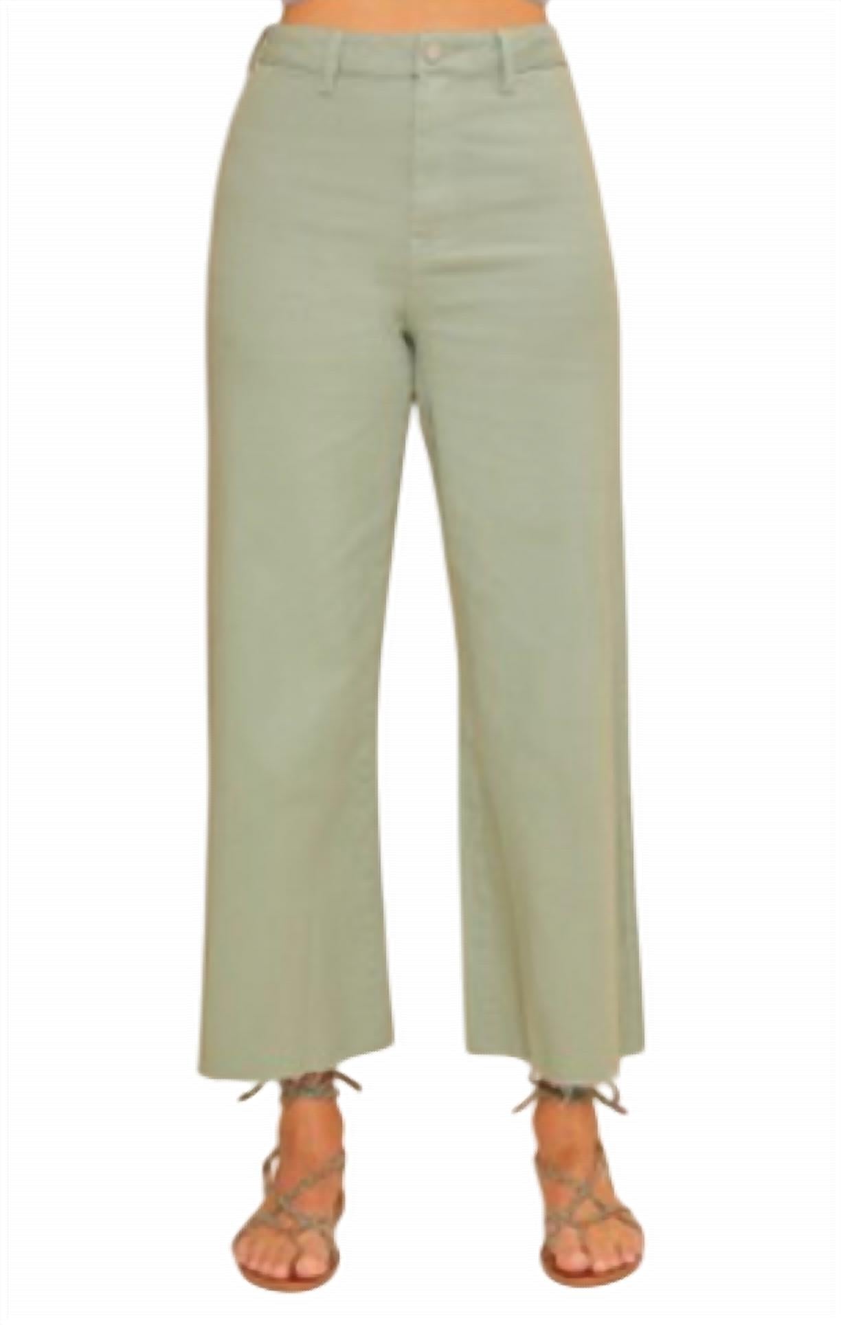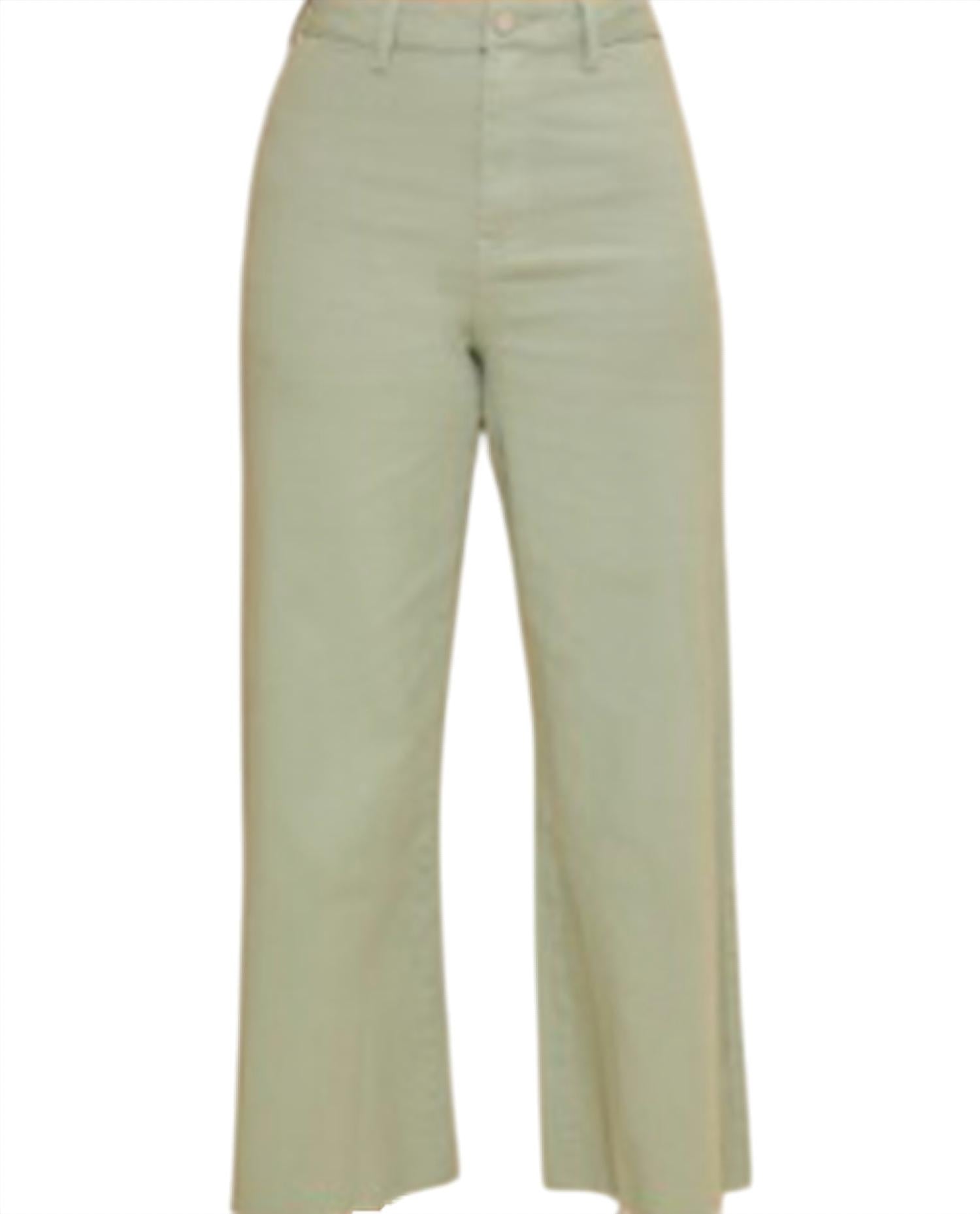 The perfect cropped jean for those transitional seasons. AnnieWear presents The Jane Jeans, perfect for stylish summer travels with their playful and comfy design. These women's high-rise, wide-leg jeans in Sage Green are crafted from a stretchy cotton blend, featuring a relaxed fit with only a back pocket for a streamlined look. The cropped length adds a touch of quirkiness, while a button closure ensures easy wear. These jeans are machine washable and suitable for tumble drying, making them a practical choice for any streetwear enthusiast. Fabric content:  97% Cotton 3% Spandex; Metallic Silver: 80% Rayon 15% Nylon. 5% Spandex