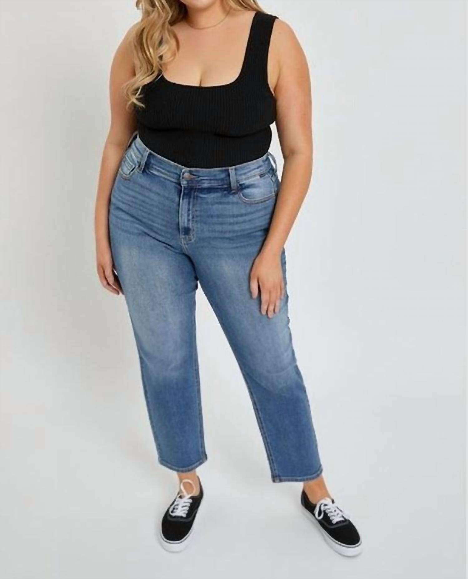 Comfortable and stylish, we love this cropped jean for all of the obvious reasons. Stretchy fabric. High rise jeans. Medium wash. 5 pocket body. Relaxed fit. Inseam 28.5" Rise 12.5". 93% Cotton 5% Polyester 2% Spandex. Imported. Style WV18977MP.