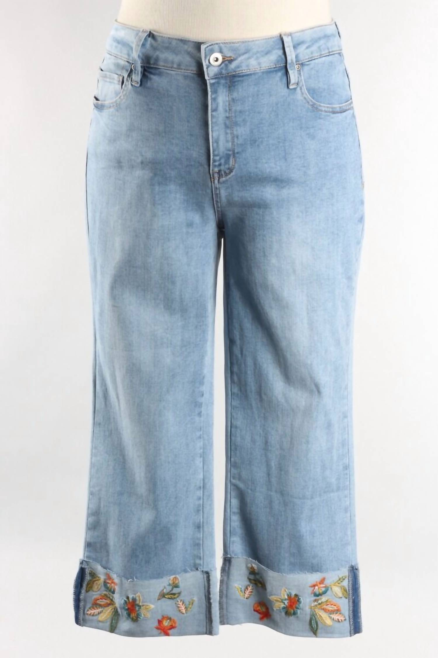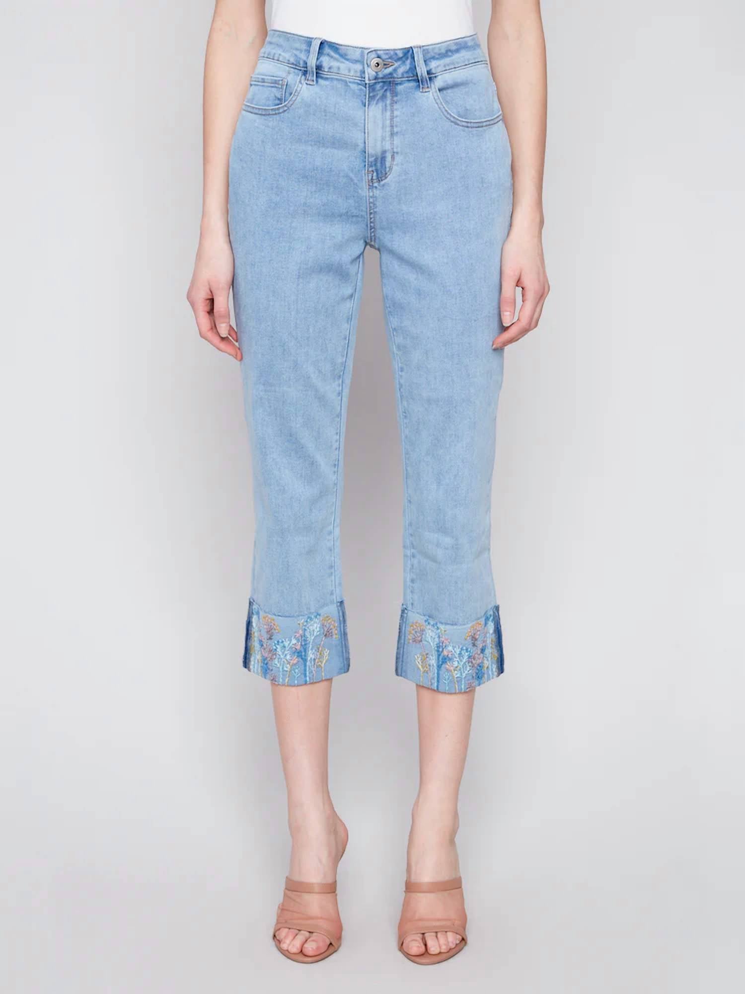 We especially love this cropped jean with a cute pair of slides or sandals. Elevate your wardrobe with the Charlie B Embroidered Cuff Cropped Jean in a stylish light blue. These high-rise, straight-leg denim jeans feature a unique floral embroidery on the cuffs and a cropped 34" garment length with a 23" inseam for a trendy fit. Made from a comfortable blend of 73% cotton, 23% polyester, 3% viscose, and 1% spandex, these jeans offer both fashion and flexibility. Closure type is a zip closure, and they come with five convenient pockets. Care is easy with machine wash cold on delicate and line dry instructions, perfect for an effortless spring and travel style.