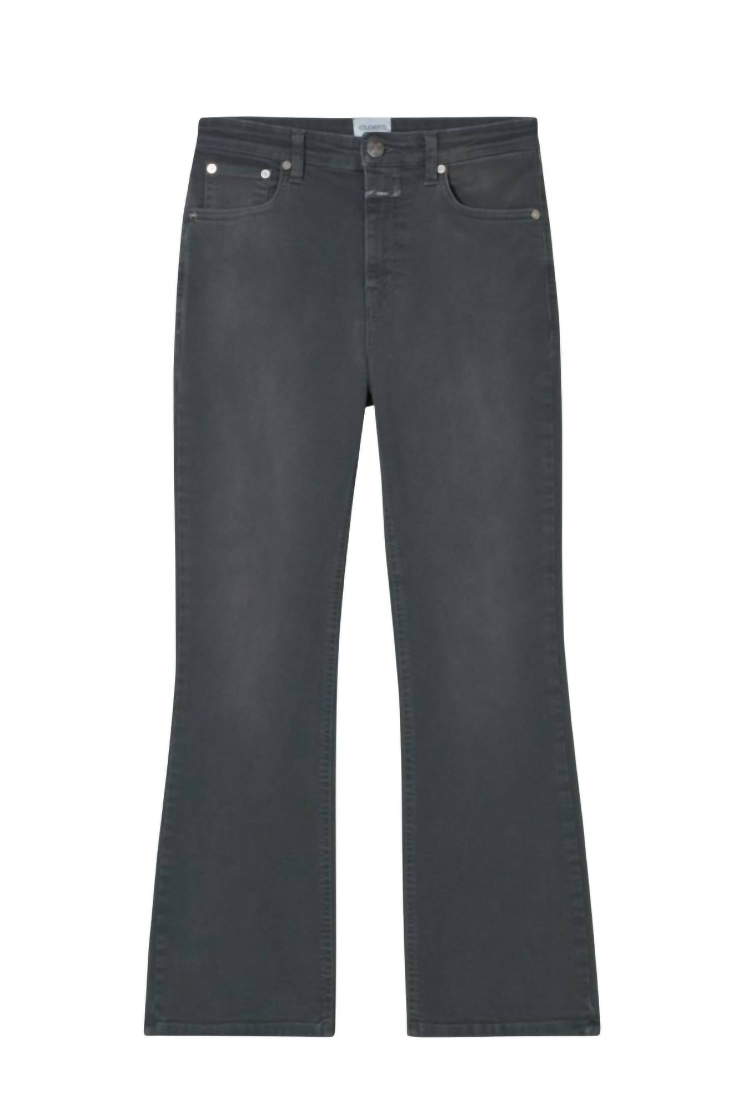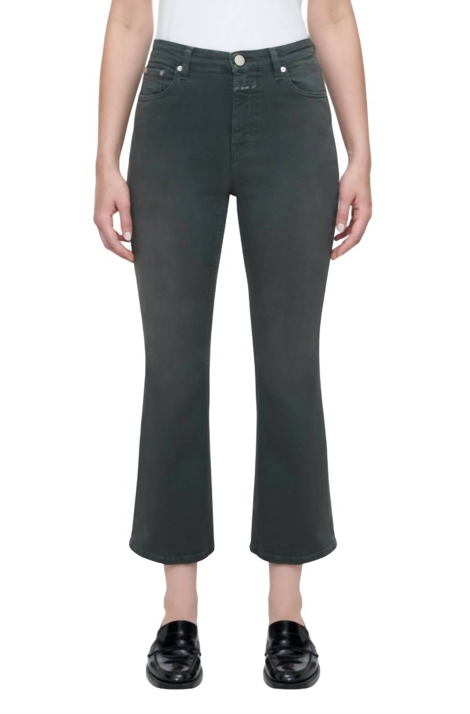Introducing the Hi-sun Cropped Flare Jeans by CLOSED, embodying stylish luxury for the modern woman. These Italian-crafted, Pini Green jeans feature a flattering high-rise and slim fit with a flared leg, perfect for adding a touch of elegance to any ensemble. Composition: 92% Cotton, 6% Elastomultiester, 2% Elastane. Closure: Button closure. Care: Machine wash for easy maintenance. Ideal for 90s fashion lovers, these dark wash jeans elevate your spring wardrobe and are perfect for travel adventures or New Year's Eve celebrations.
