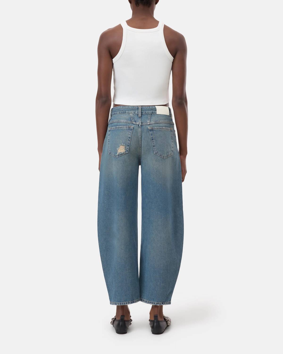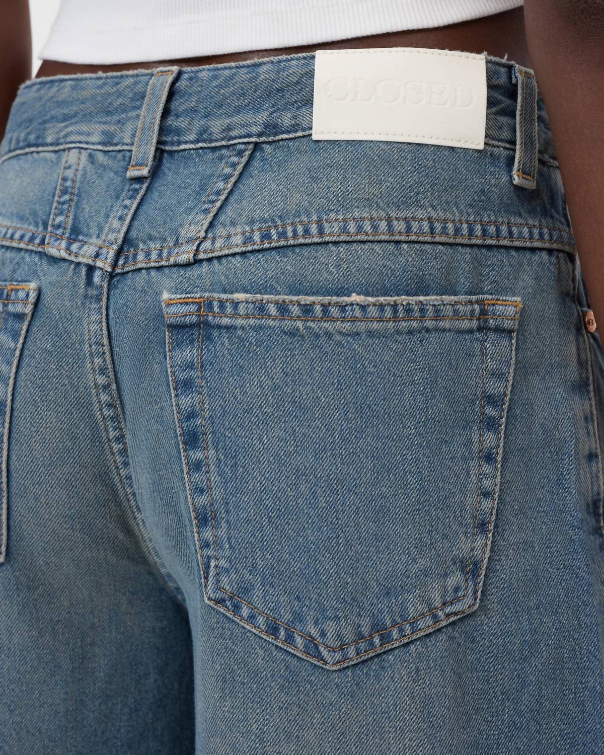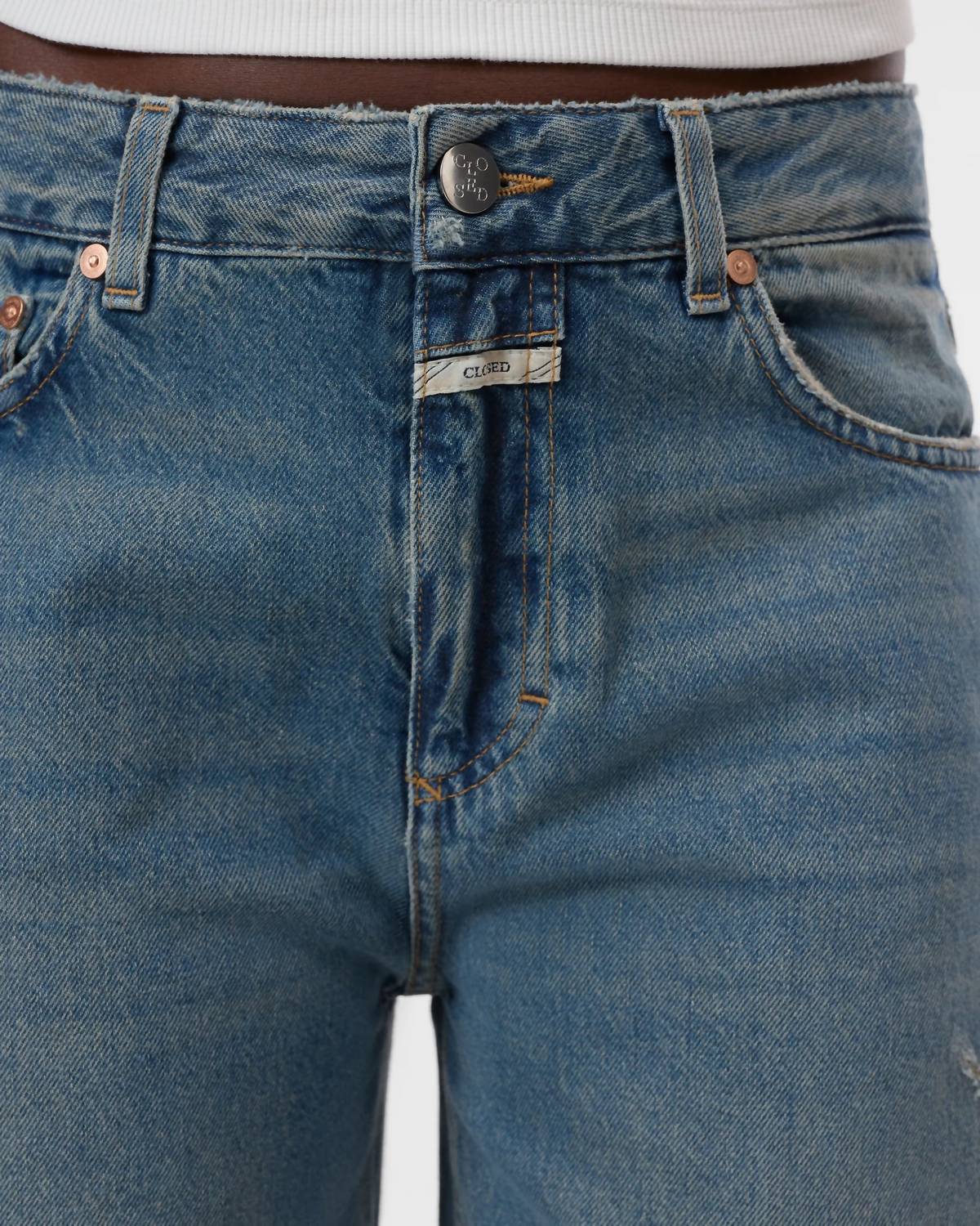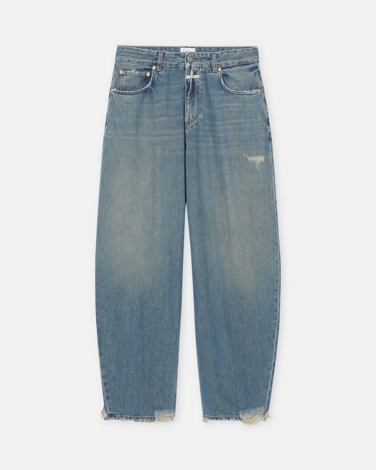 The perfect cropped jean for those transitional seasons. Introducing the Jazzie Barrel Jeans by CLOSED, a stylish choice for those seeking a vintage flair in mid blue. These jeans feature a mid-rise waist with a relaxed fit and a tapered, cropped leg. Crafted from a cotton blend, the 12 oz. denim incorporates BCI and recycled cotton with eco-friendly dyes. Closure: Button closure. Care: Dry clean. Designed with textured distressed details and patched holes, alongside classic five pockets for functionality. Perfect for a vacation or a springtime celebration, these jeans offer sustainable style with a salt 'n pepper finish.