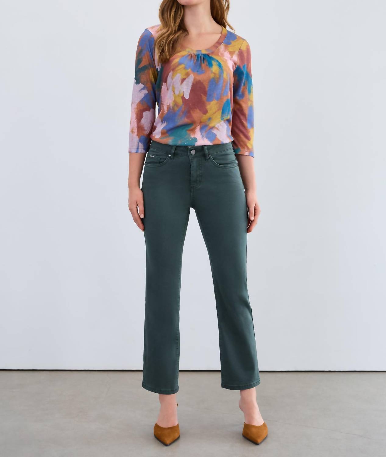 The perfect cropped jean for those transitional seasons. Introducing the Olivia Ankle Boot Cut Denim Jeans by FDJ, crafted for a sleek and modern look in striking Spruce. These jeans feature a high-rise fit with a slim silhouette and straight leg style, perfect for travel or any spring outing. Constructed from a comfortable cotton blend, they boast a 28" inseam and dark wash for added elegance. With button and zip closure, along with front and back pockets, they are machine washable with a simple line dry recommendation. 89% Cotton, 10% Polyester, 1% Elastane.