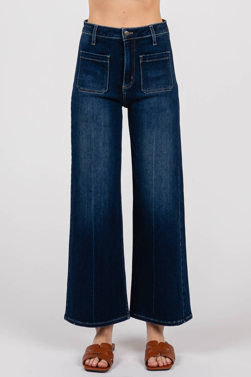 The perfect cropped jean for those transitional seasons. Introducing the High Rise Front Patch Pocket Jeans by Letter to Juliet in a chic Dark Sailor hue. These jeans feature a high-rise waist of 12 inches and a cropped wide leg with a 27-inch inseam, offering a flattering, leg-lengthening silhouette. Crafted from a comfort-stretch denim blend of 92.6% cotton, 5.5% polyester, and 1.9% spandex, these jeans are tailored in the USA with button closure for versatile day-to-night styling. Care instructions: machine wash and tumble dry.