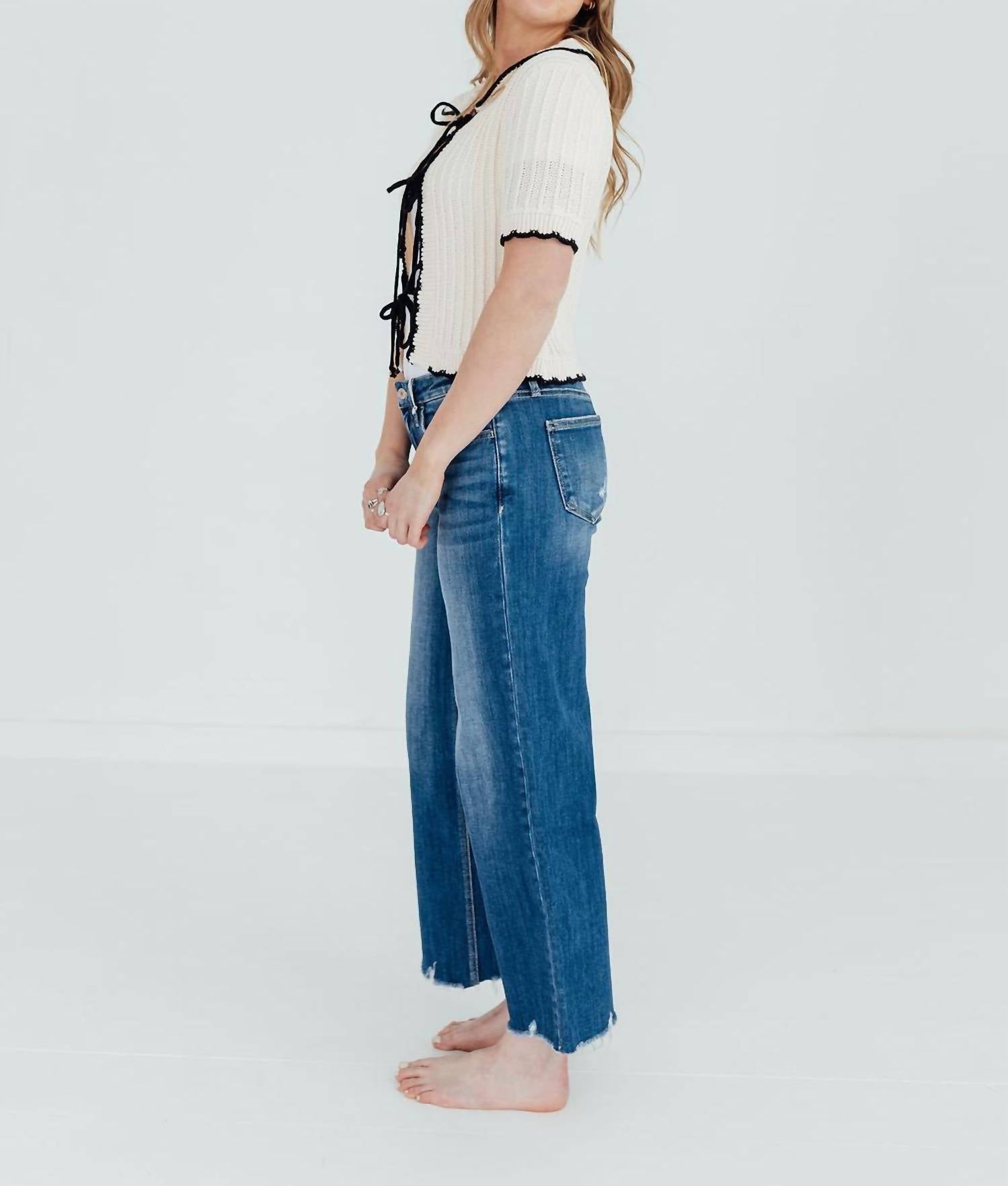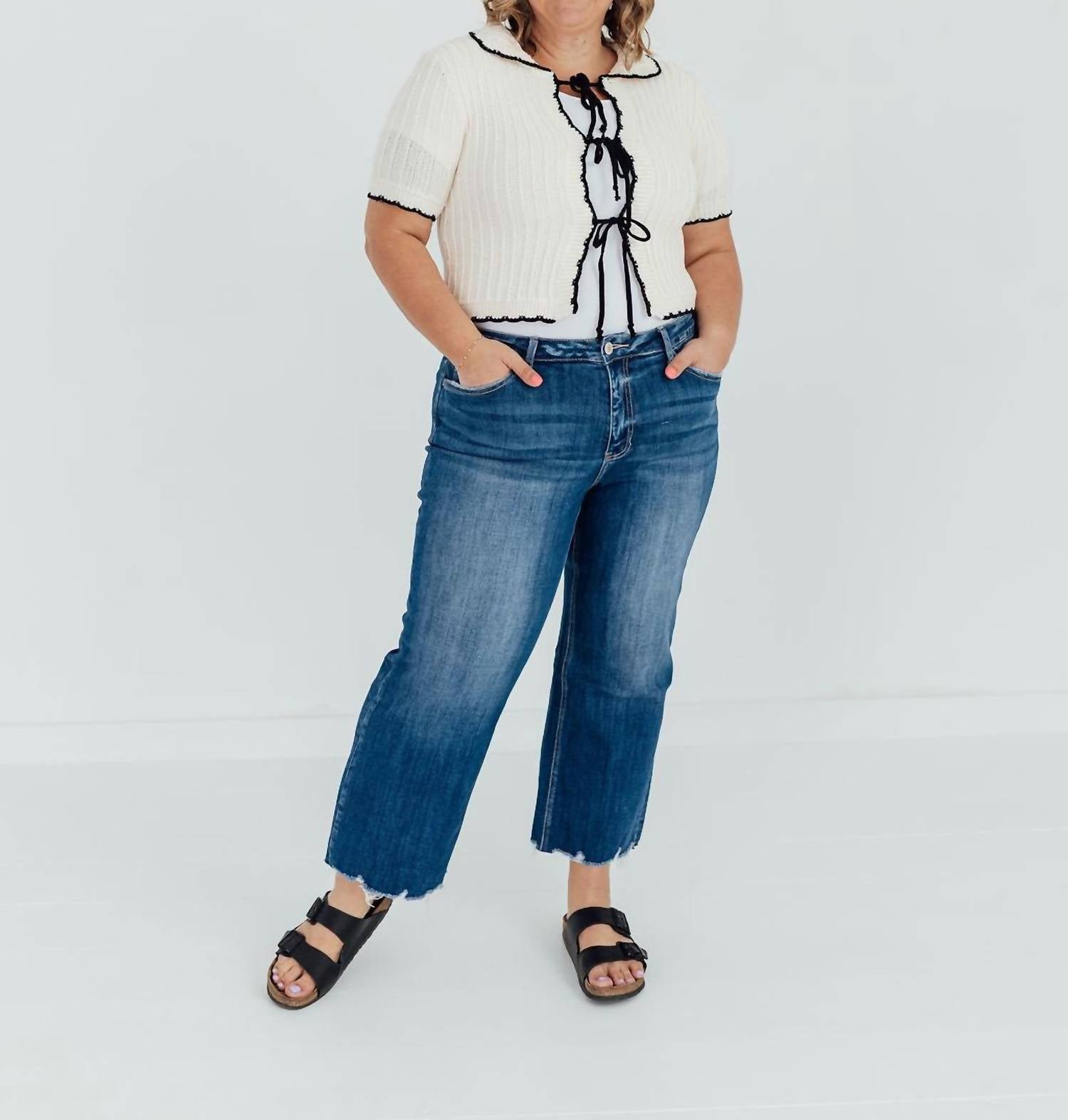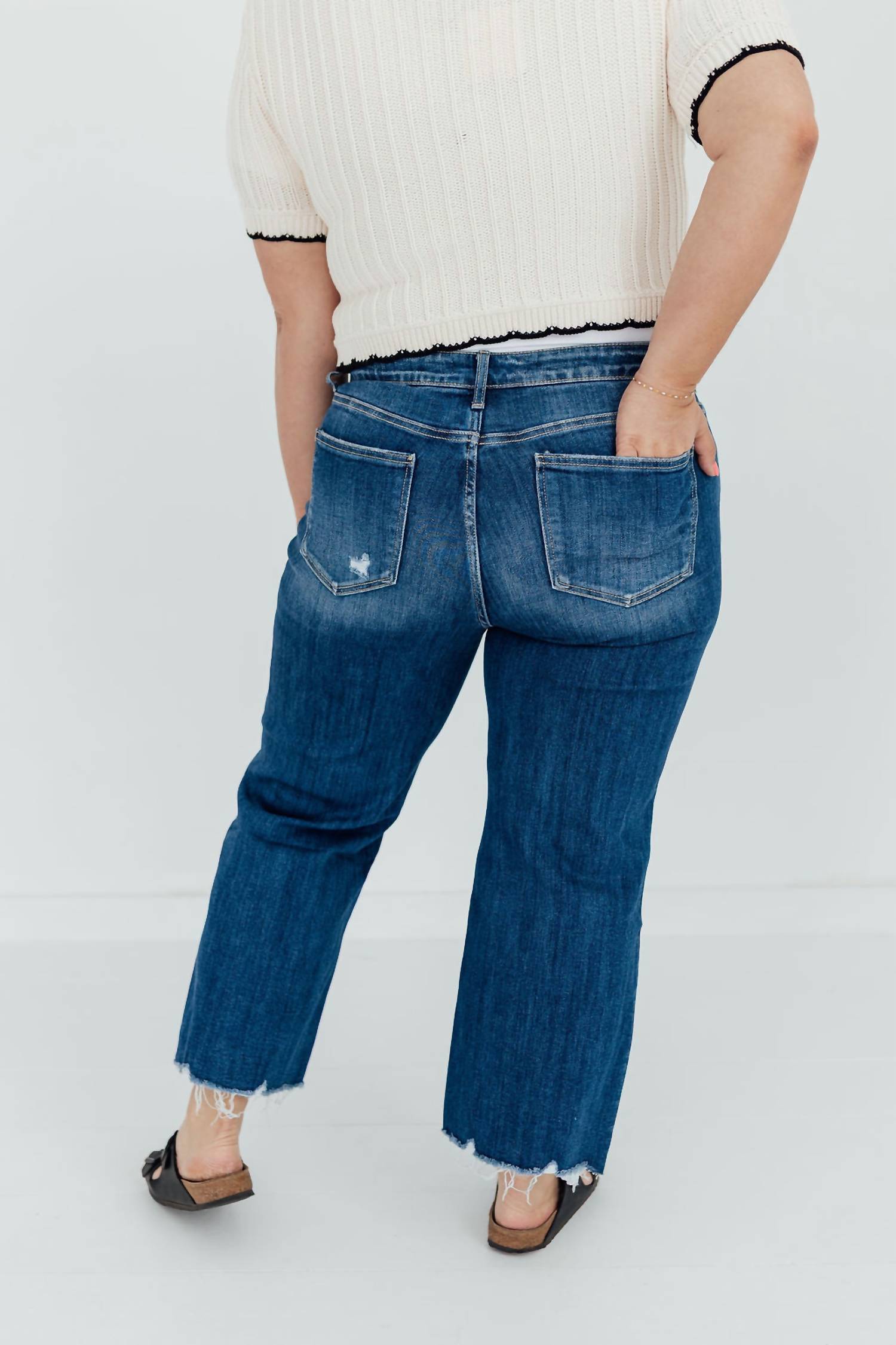 We especially love this cropped jean with a cute pair of slides or sandals. Embrace your style with the Bay Head Jeans by Lovervet, featuring a trendy cropped length and medium wash that exudes modern elegance. Crafted from a cotton blend of 92% cotton, 6% polyester, and 2% spandex, these jeans are perfect for comfortable, everyday wear. The distressed details and raw hem add a touch of edge, while the zip closure ensures a secure fit. For best care, wash inside out, machine wash cold, tumble dry low, and iron on low. Available in various sizes, with inseam measurements ranging from 27" to 28".