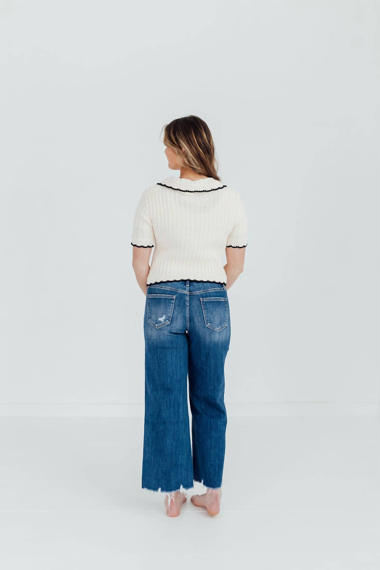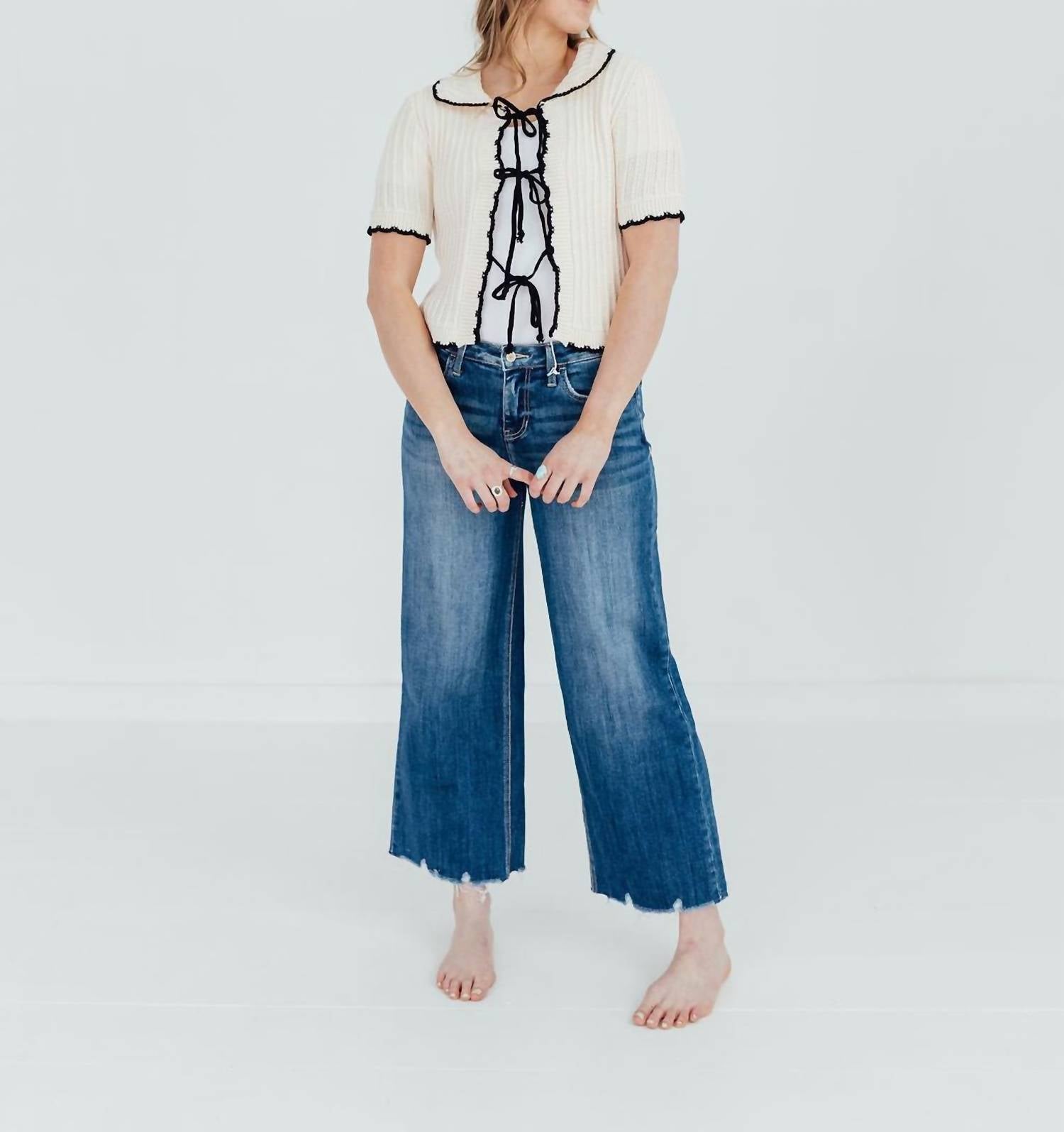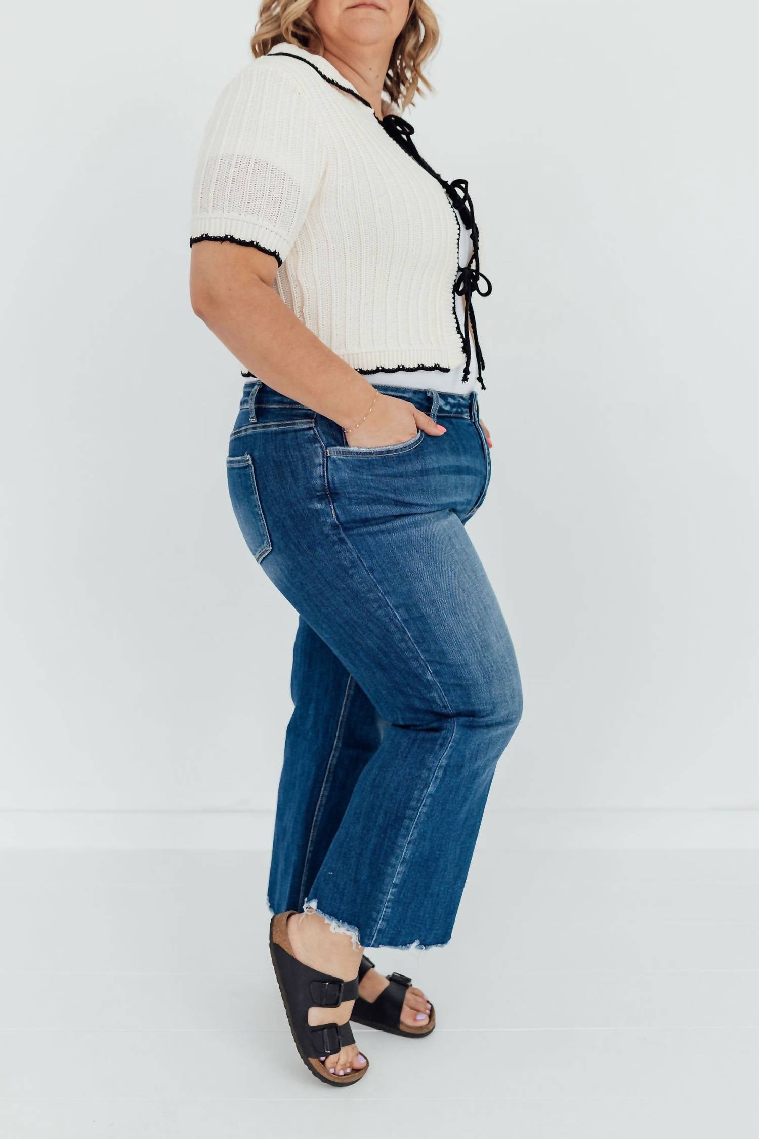 We especially love this cropped jean with a cute pair of slides or sandals. Embrace your style with the Bay Head Jeans by Lovervet, featuring a trendy cropped length and medium wash that exudes modern elegance. Crafted from a cotton blend of 92% cotton, 6% polyester, and 2% spandex, these jeans are perfect for comfortable, everyday wear. The distressed details and raw hem add a touch of edge, while the zip closure ensures a secure fit. For best care, wash inside out, machine wash cold, tumble dry low, and iron on low. Available in various sizes, with inseam measurements ranging from 27" to 28".