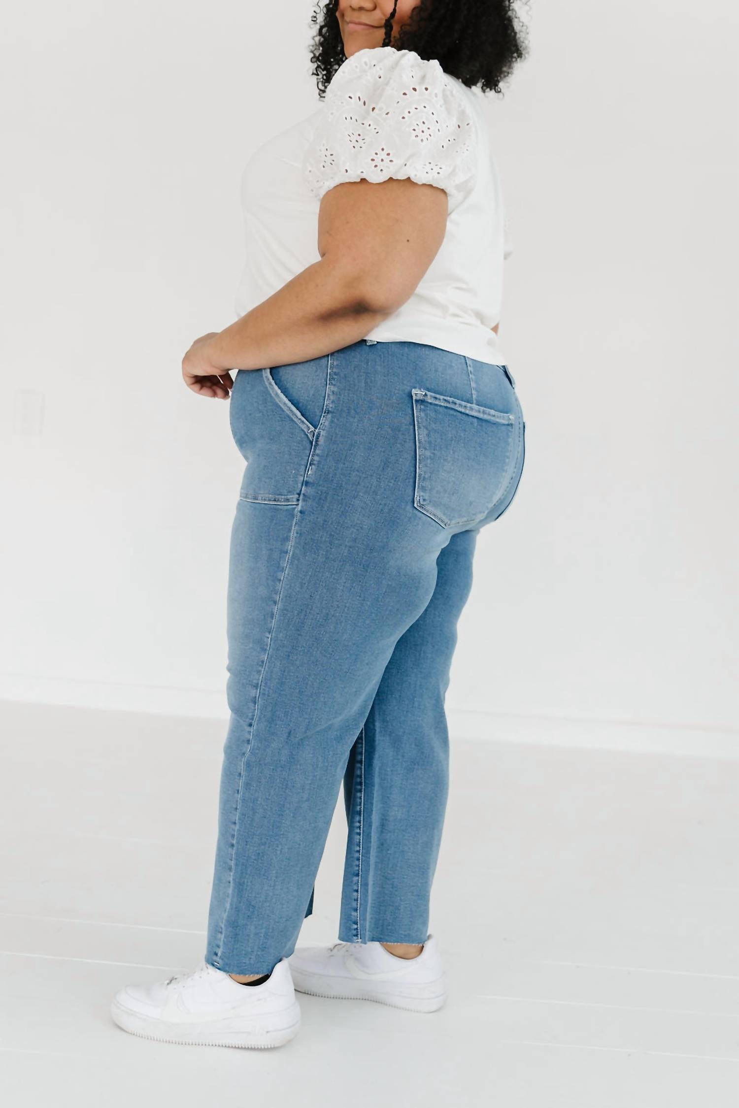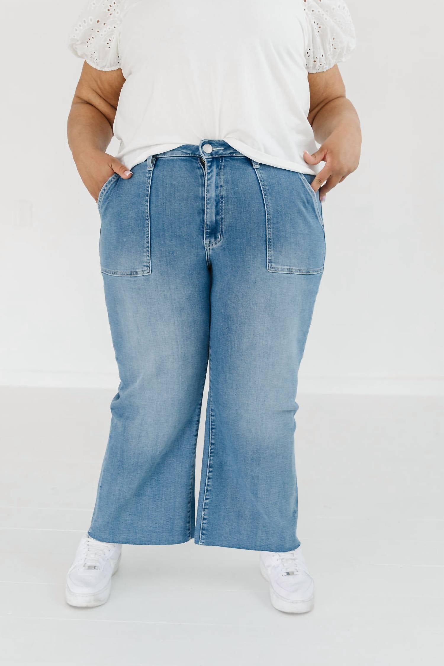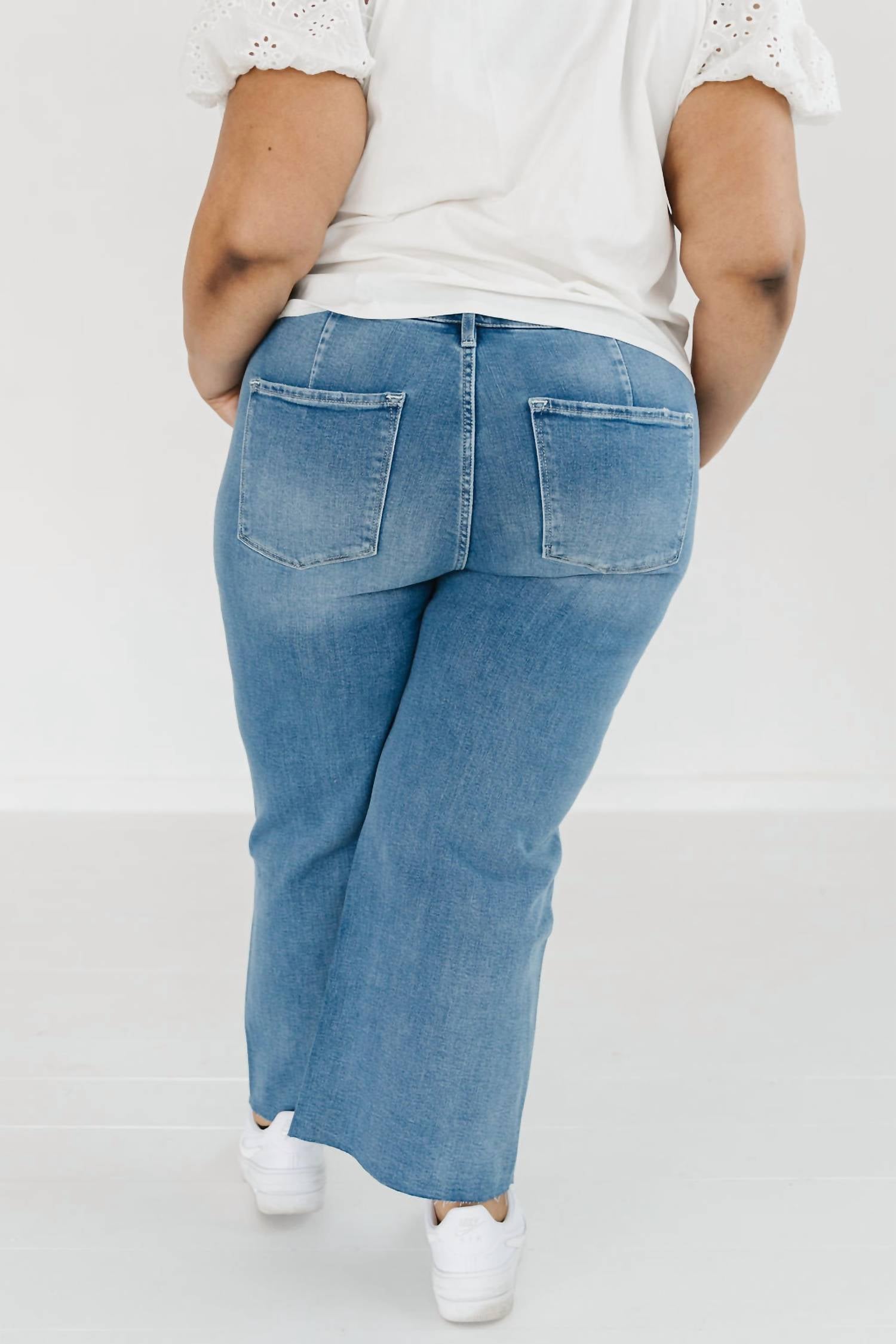 We especially love this cropped jean with a cute pair of slides or sandals. Step out in style with the Bradley Beach Jeans by Lovervet, featuring a light wash and high-rise fit for a flattering silhouette. These cropped jeans boast a wide leg and raw hem, exuding a relaxed, vintage charm perfect for casual outings. Crafted from a 94.5% cotton, 4.5% polyester, and 1% spandex blend, they offer comfort and flexibility. Closure type: Zip closure. Care instructions: Wash inside out, machine wash cold, do not bleach, tumble dry low, iron low. Model is wearing a size 25 (5'4"), plus model is size 18W (5'8").