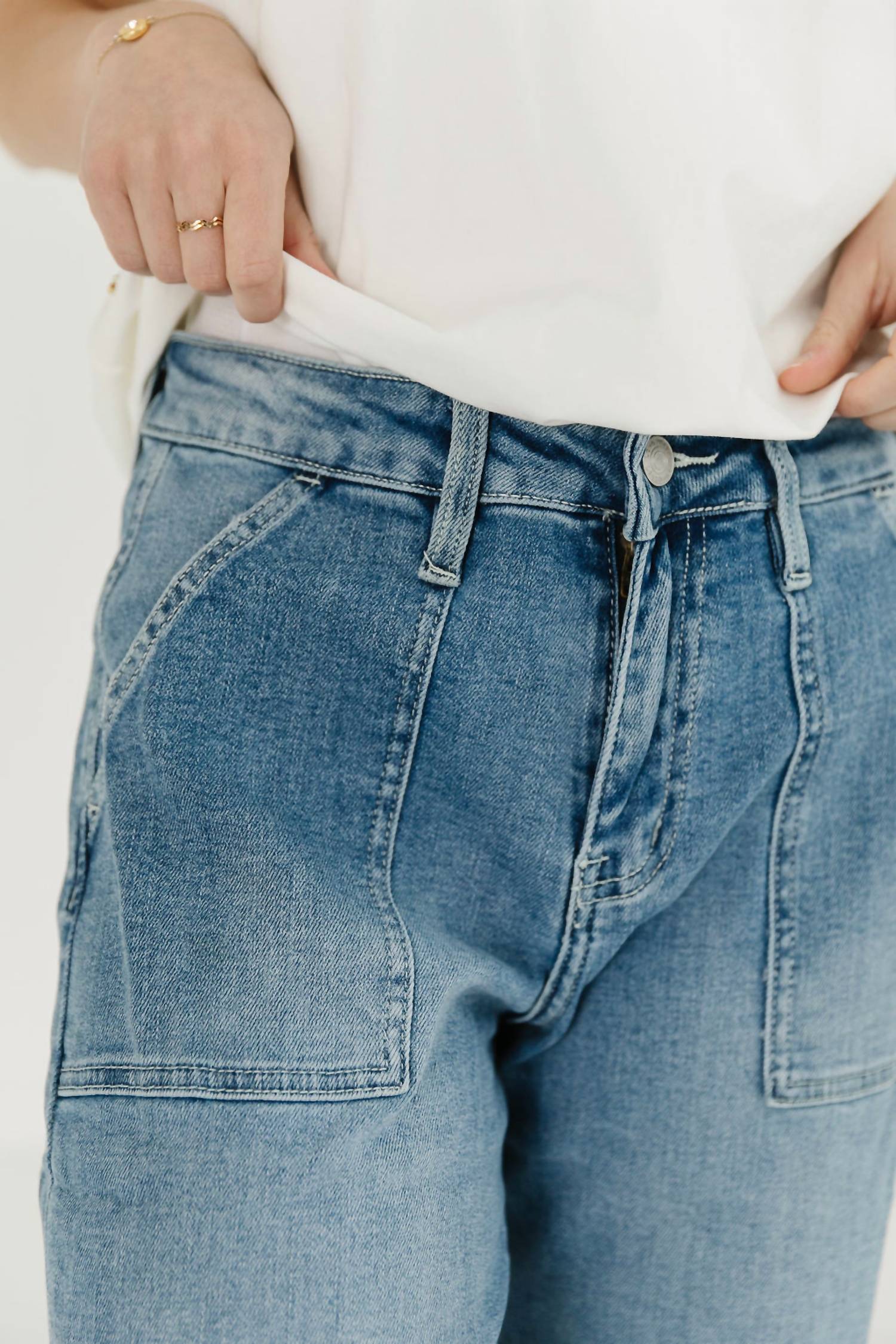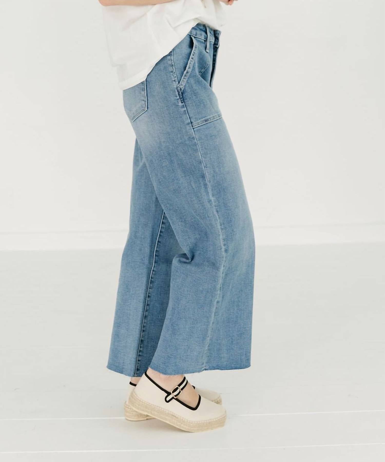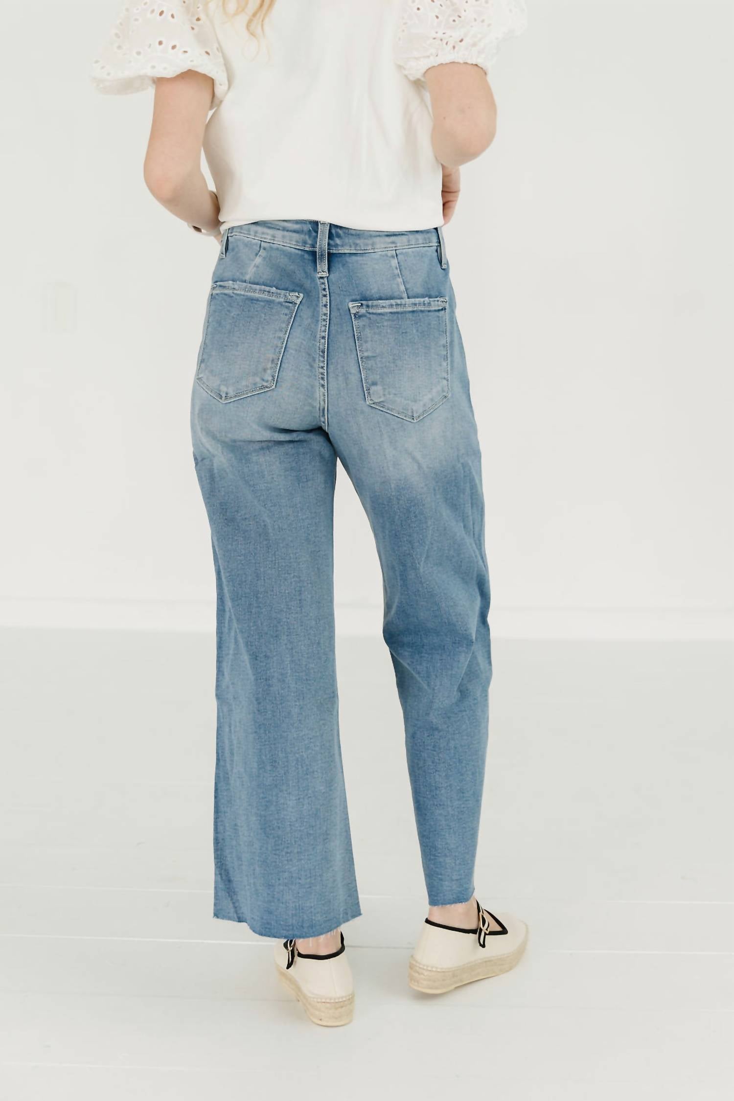 We especially love this cropped jean with a cute pair of slides or sandals. Step out in style with the Bradley Beach Jeans by Lovervet, featuring a light wash and high-rise fit for a flattering silhouette. These cropped jeans boast a wide leg and raw hem, exuding a relaxed, vintage charm perfect for casual outings. Crafted from a 94.5% cotton, 4.5% polyester, and 1% spandex blend, they offer comfort and flexibility. Closure type: Zip closure. Care instructions: Wash inside out, machine wash cold, do not bleach, tumble dry low, iron low. Model is wearing a size 25 (5'4"), plus model is size 18W (5'8").