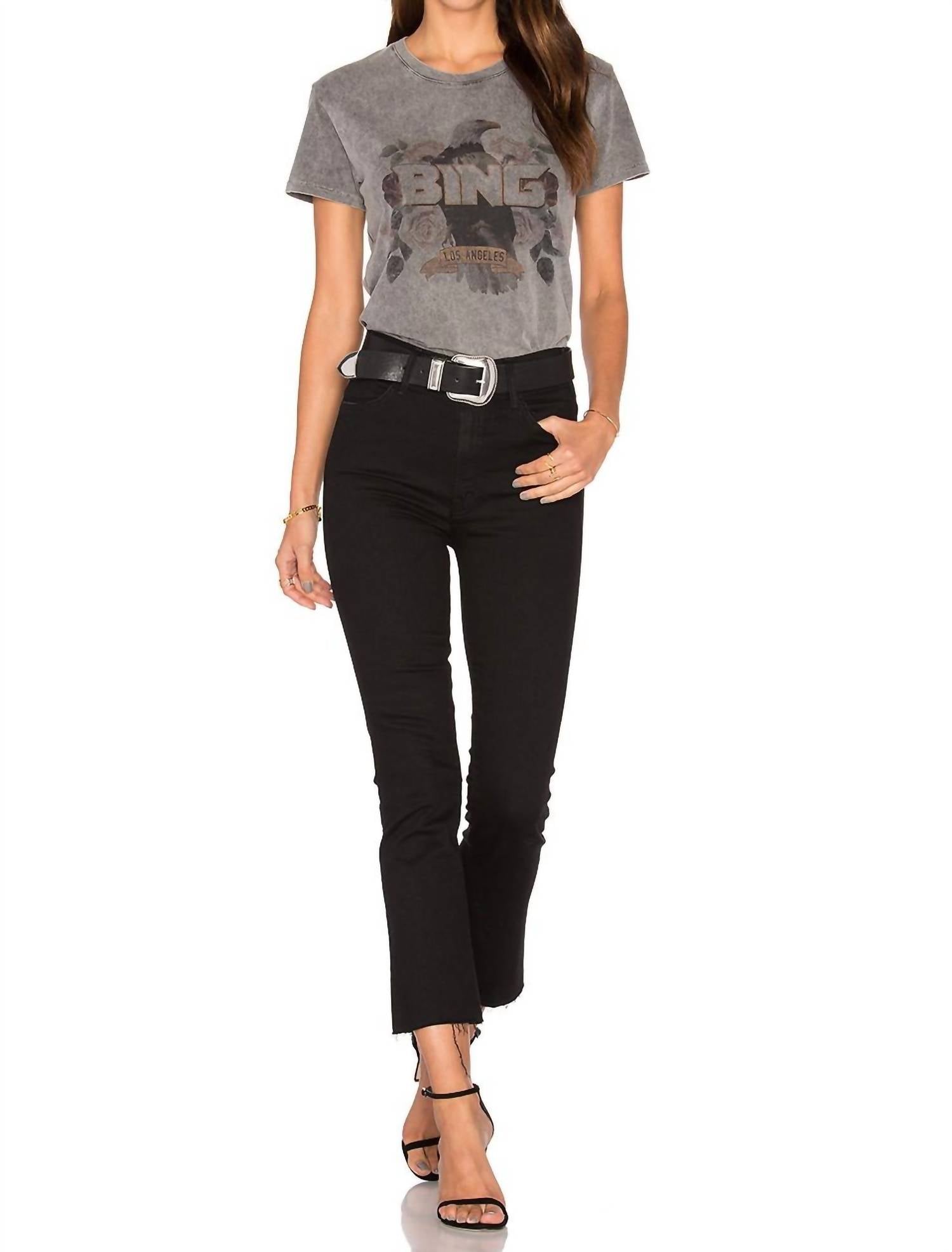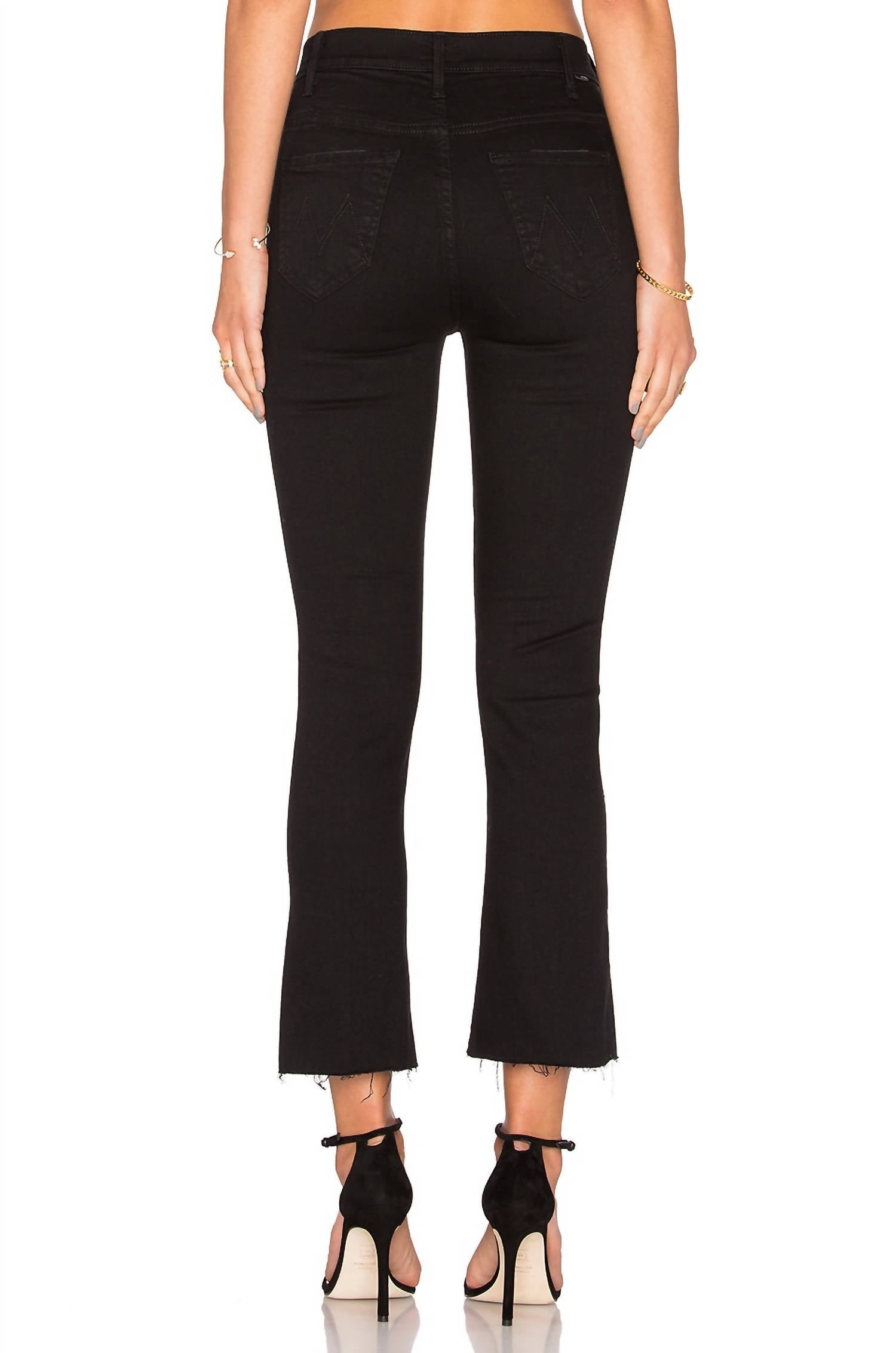 The perfect cropped jean for those transitional seasons. Meet the Hustler Ankle Fray Jeans by Mother, a must-have for those who embrace vintage flair. Crafted with 92.5% cotton, 5% polyester, and 5% elastane, these black denim jeans offer a slim fit with a flattering high rise. Made in the U.S.A, they feature a zip closure and practical front and back pockets, with raw cut flared leg openings that add an edgy touch. Inseam measures 27", and rise stands at 11". Care instructions include machine wash cold and lay flat to dry for lasting quality.