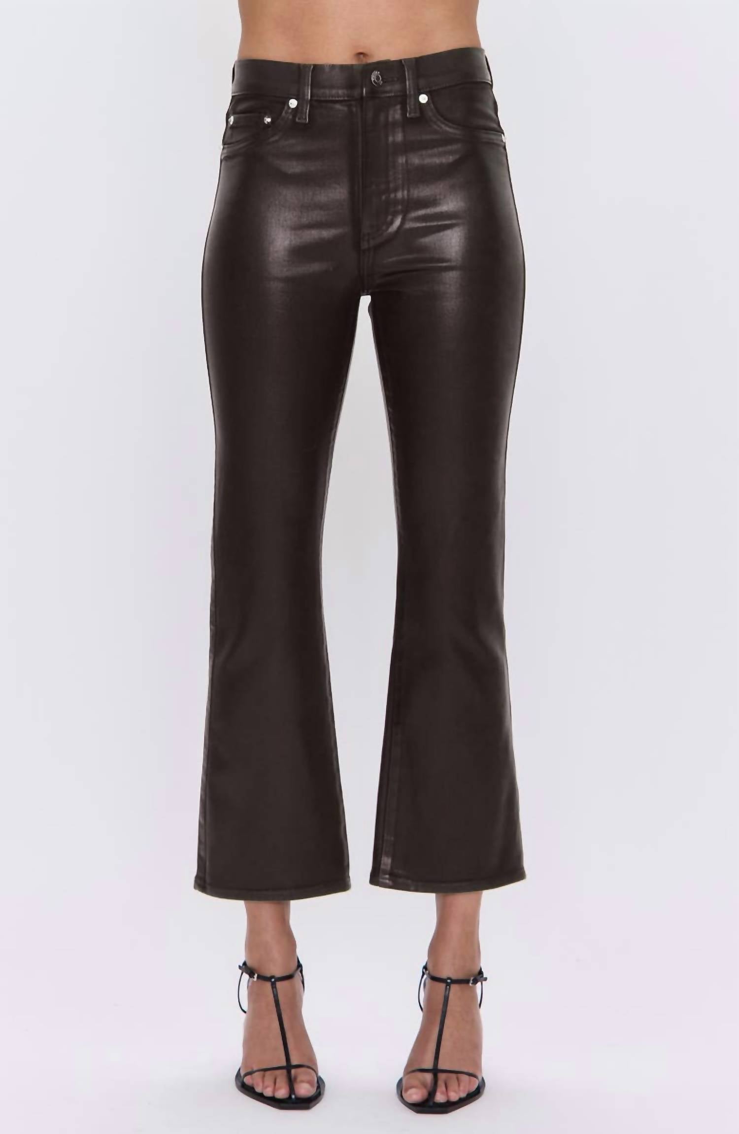 We especially love this cropped jean with a cute pair of slides or sandals. Elevate your style with the High Rise Coated Boot Jean in Coated Mocha by PISTOLA, designed for trendsetting women. These flared jeans have a sleek, leather-like finish with a comfortable stretch, making them perfect for any occasion. Crafted from a blend of 71% cotton, 20% rayon, 7% elastomultiester, and 2% spandex, they feature a high rise with a 27" inseam and an 11" front rise for a flattering fit. Closure is secured by a zip fly with a button, and they are easy to care for with machine wash and tumble dry instructions. Made in an imported design, these jeans are sure to become a staple in your wardrobe.
