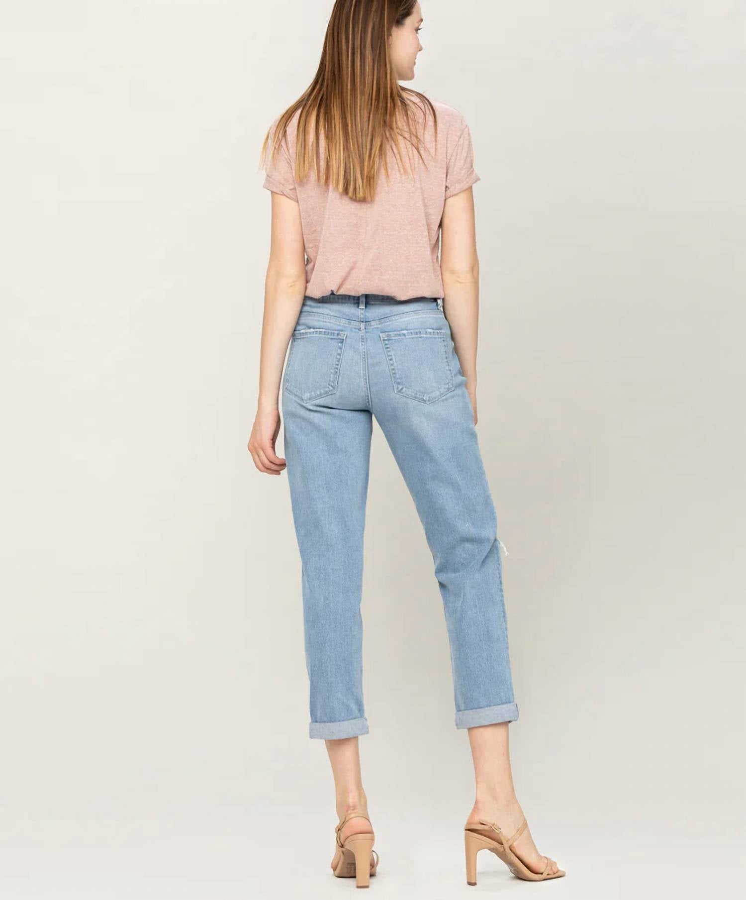 Comfortable and stylish, we love this cropped jean for all of the obvious reasons. Experience ultimate comfort and style with the Erika Stretch Mom Jeans by VERVET BY FLYING MONKEY. Crafted from 99% cotton and 1% spandex, these denim jeans feature a relaxed fit and a high-rise waist for a flattering silhouette. The straight leg design and distressed double-cuffed styling add a touch of vintage charm, perfect for spring travel. With a zip closure for convenience, these jeans are made in Vietnam and are easy to care for with machine washing and tumble drying recommended.