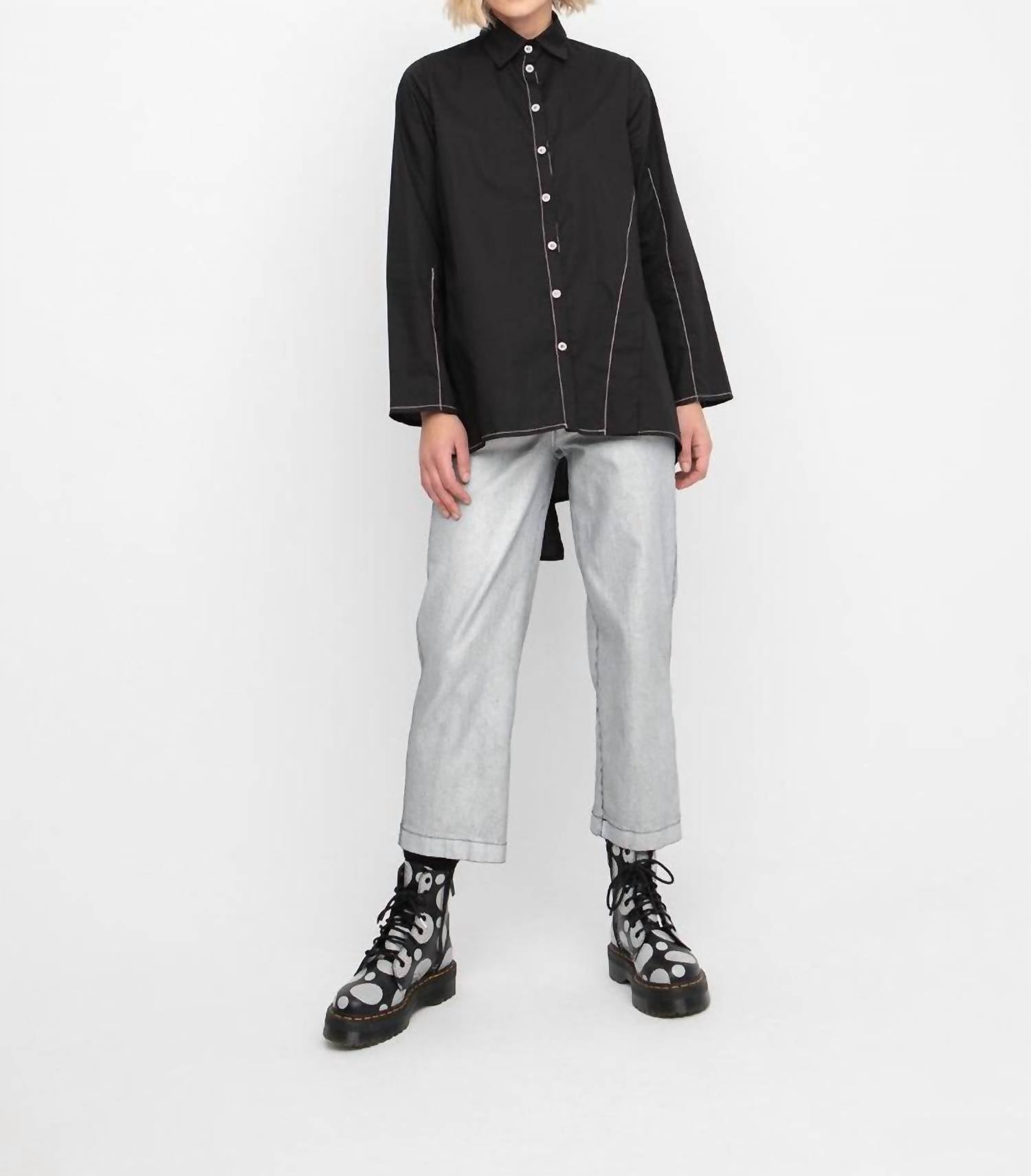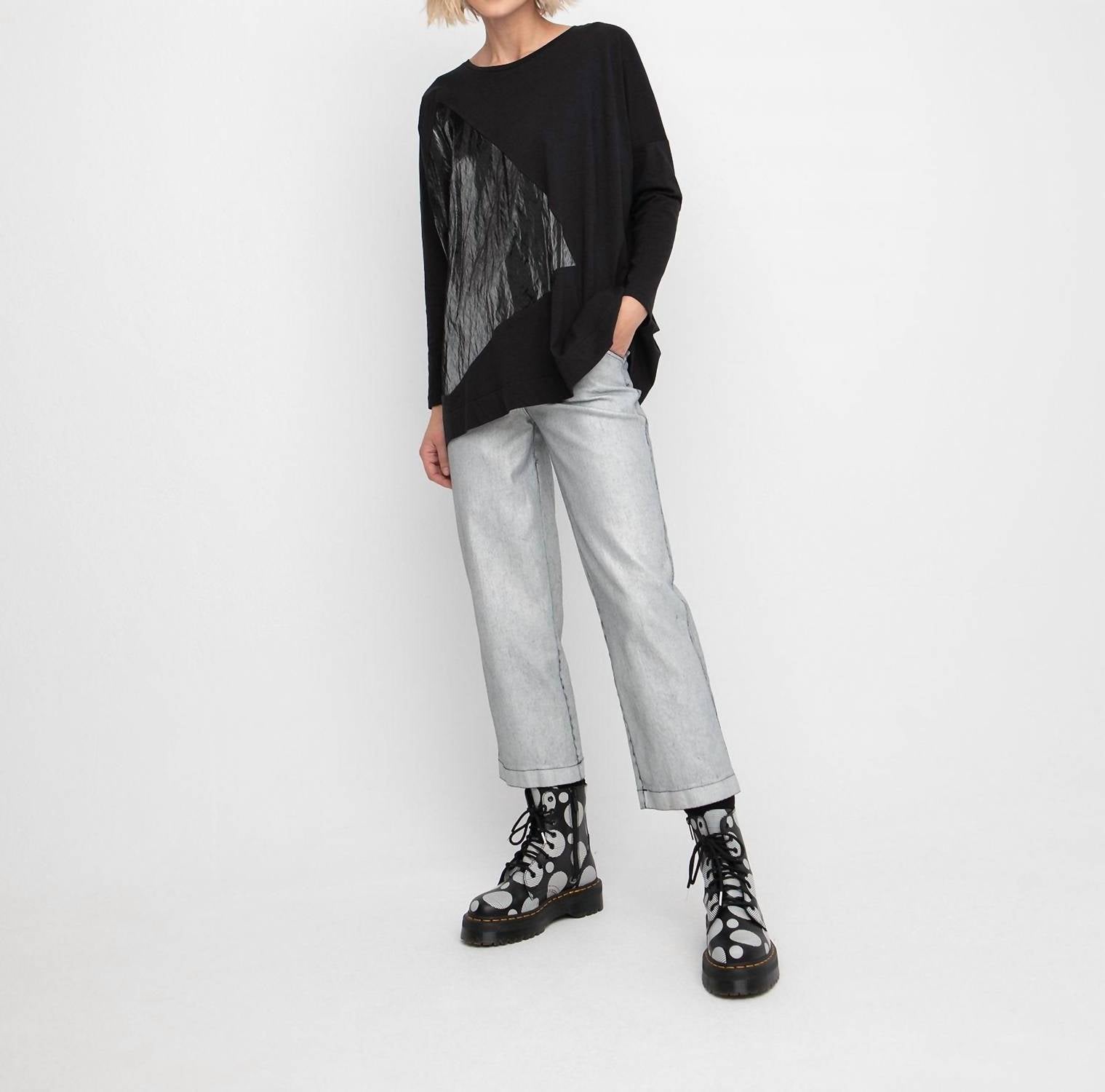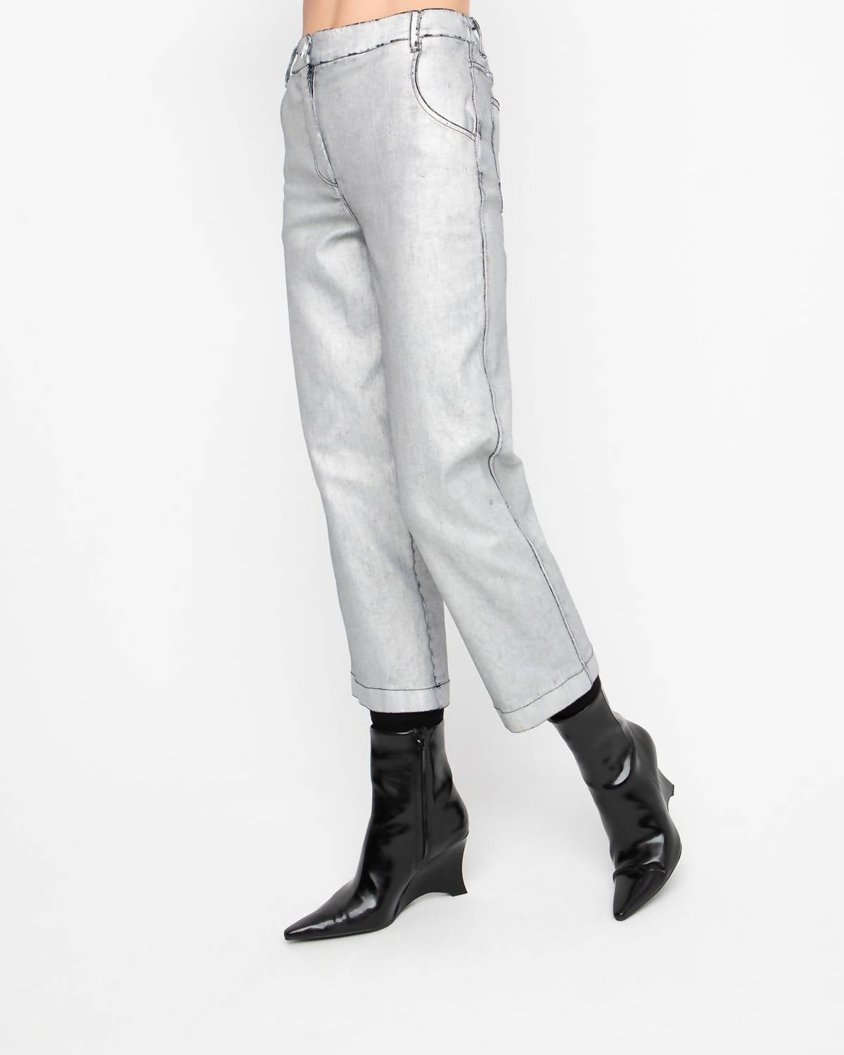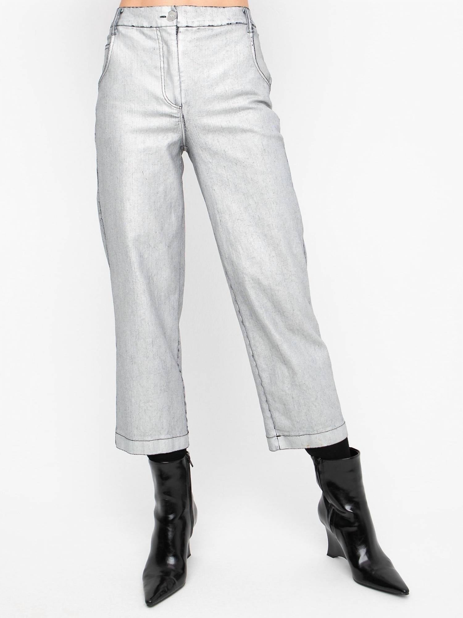 Introducing the Silver Denim Cropped Pants by Ozai N Ku, the perfect blend of contemporary style and functional design. These women’s cropped pants feature contrasting black stitching and both front and back pockets, adding a modern edge while ensuring practicality. Crafted from a durable blend of 70% cotton, 28% polyester, and 2% elastane, they offer the ultimate in comfort, durability, and stretch. Closure type: Button closure. Fit: Comfort fit with a flattering bootcut leg style.