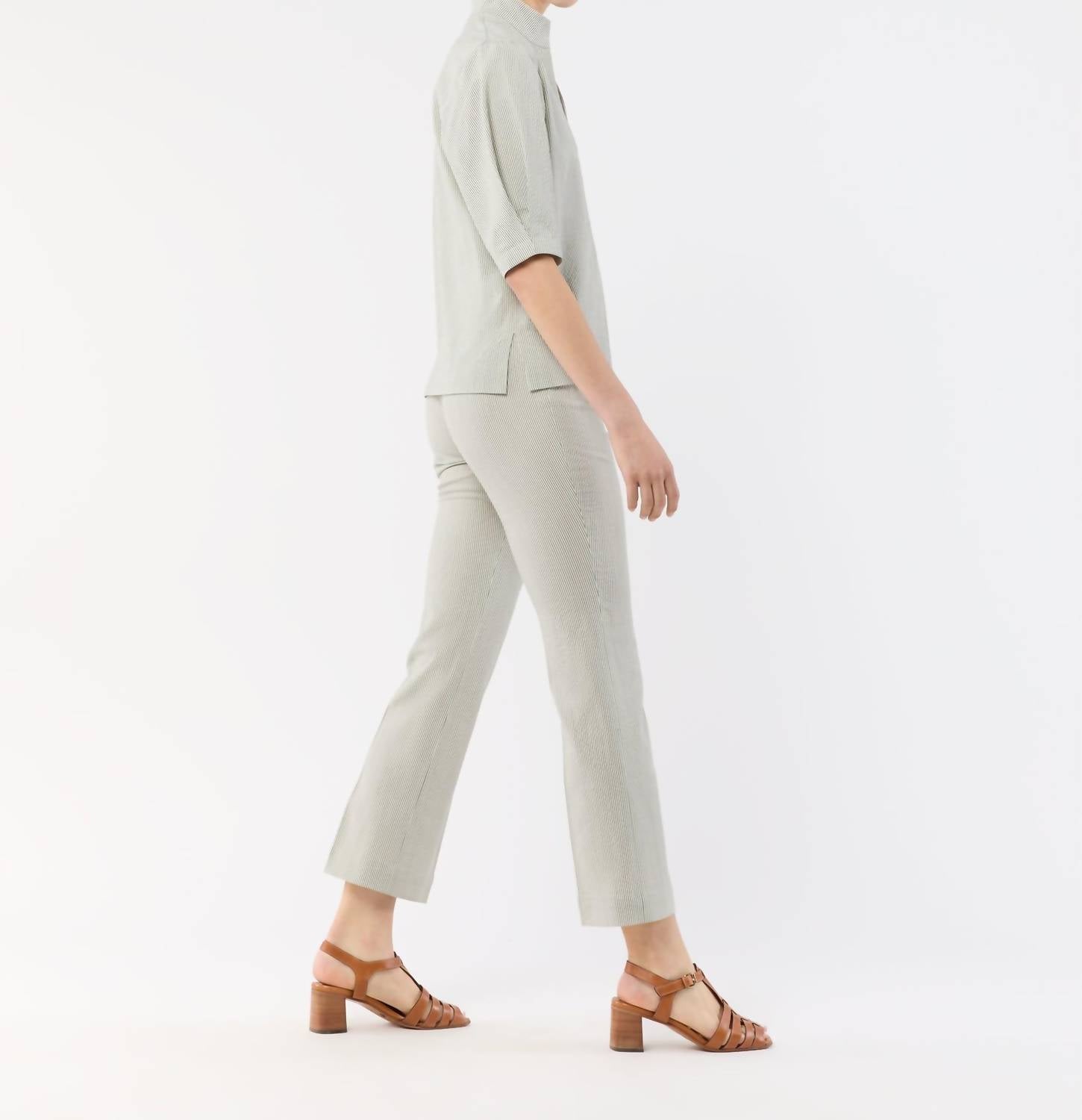 Upgrade your wardrobe with these cropped pants, designed to merge sophistication and wearability. The tailored fit ensures ultimate comfort during long days or nights out. Introducing the Fayette Flare Cropped Pant by Ann Mashburn in Olive Small Bengal Stripe, a stylish addition perfect for your workwear and travel needs. These cropped pants feature a flattering flared leg and a discreet zip closure at the back, complemented by a comfortable covered elastic waist. Made from Italian stretch seersucker, this wool blend fabric ensures both elegance and ease. Crafted in China, these pants require dry cleaning to maintain their chic silhouette. With a 28-inch inseam and 16.25-inch leg opening, the fit is designed for a sophisticated finish.