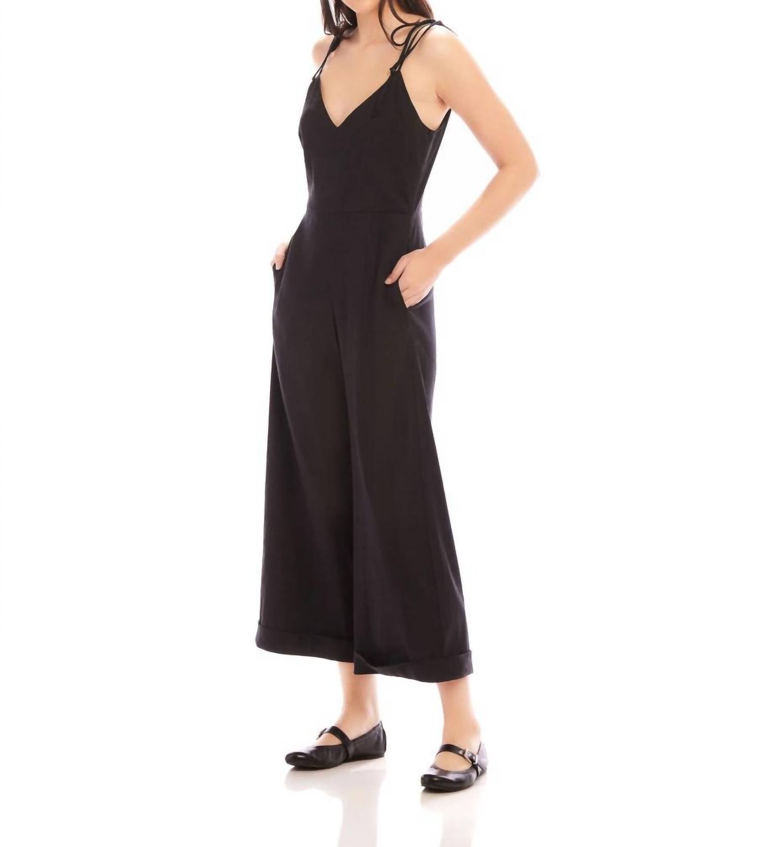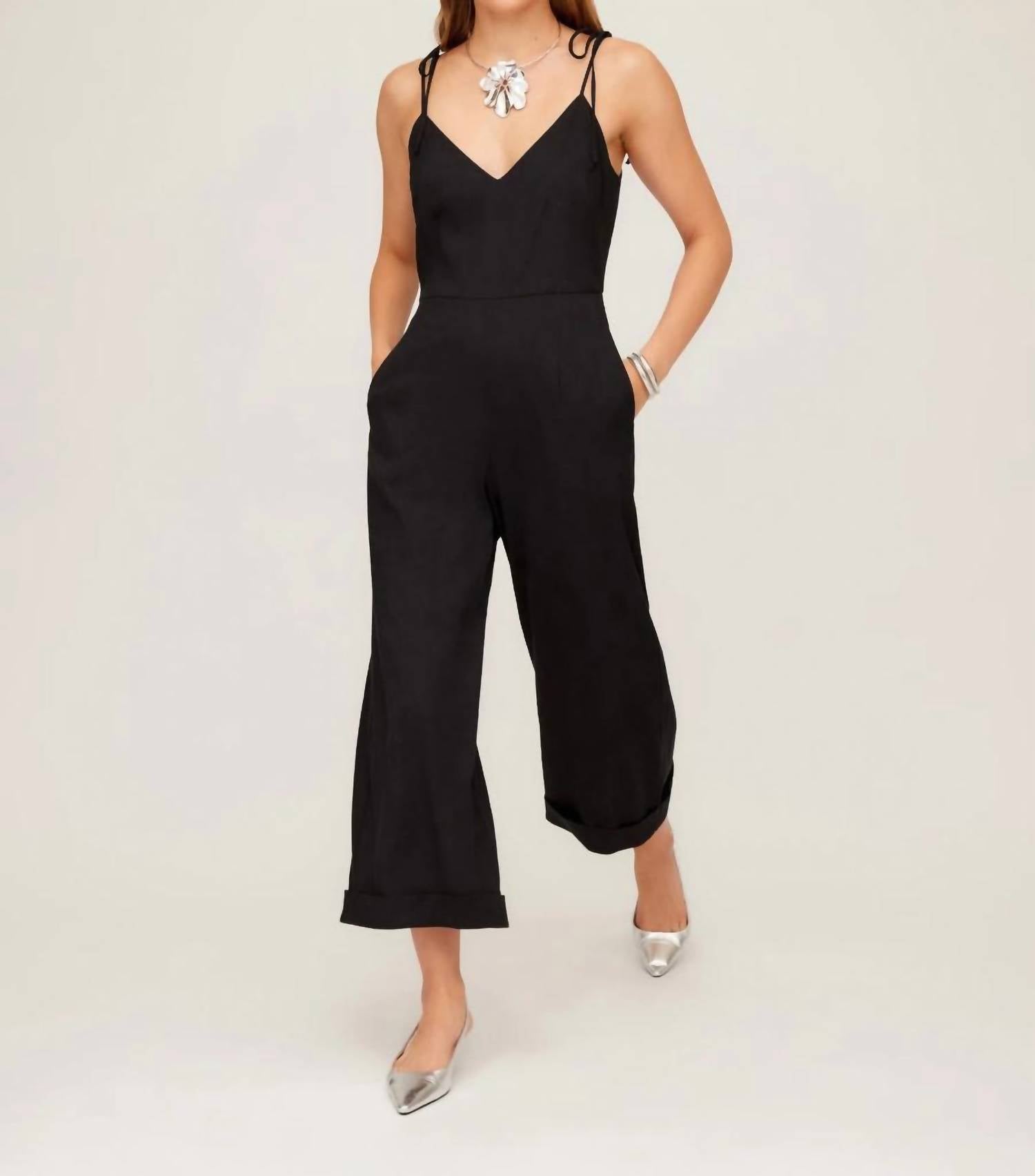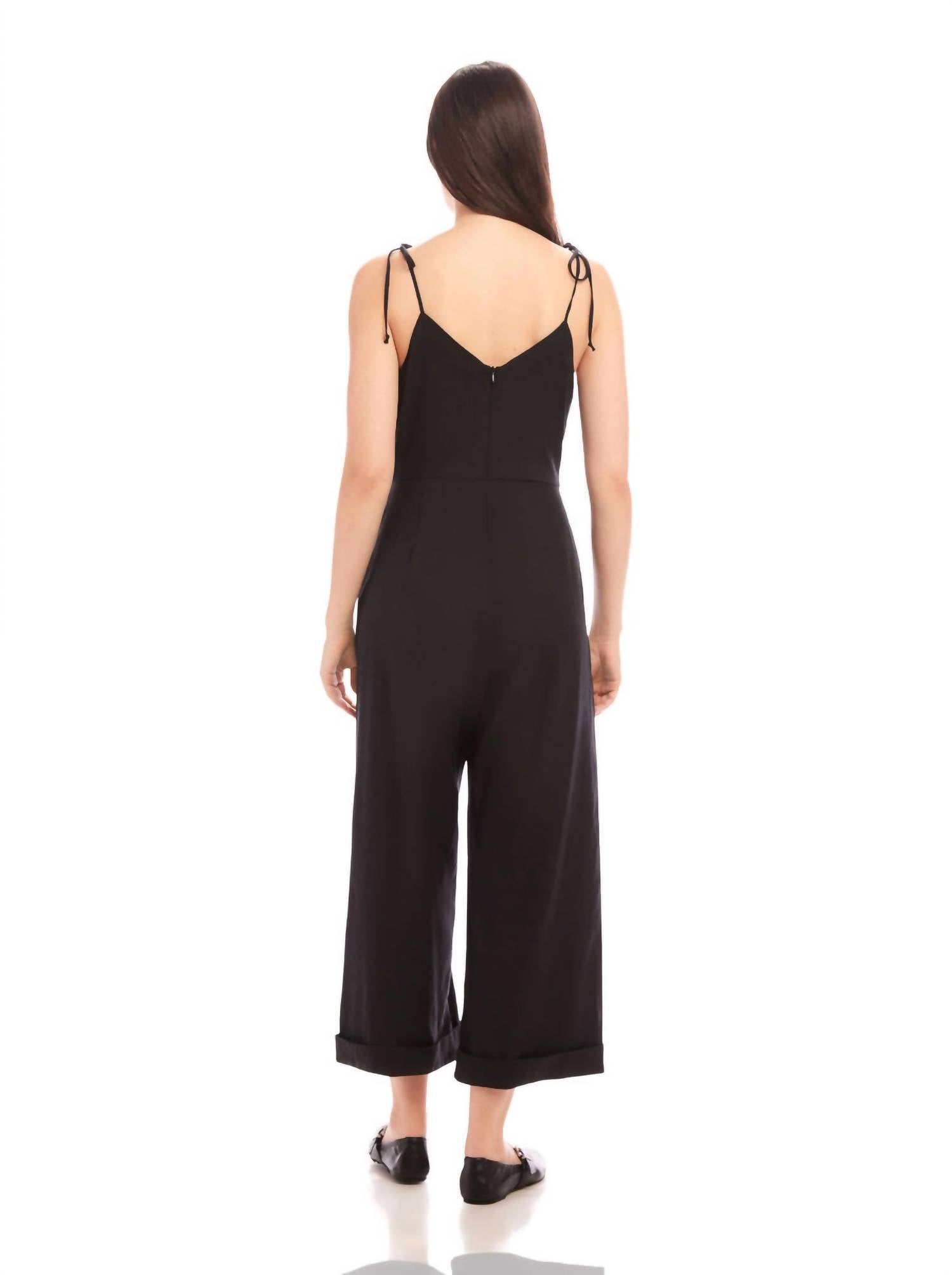 Introducing the Dana Cropped Jumpsuit by Fifteen Twenty, a blend of style and comfort crafted for diverse occasions. This jumpsuit features adjustable tie sleeves and a V-neck, made from a 60% Linen, 38% Rayon, and 2% Elastane composition. It boasts a cropped wide-leg silhouette with a cuffed hem, convenient side pockets, and an invisible back zip closure, designed to fit true to size. Made in the USA, it is 16 inches in top length with a 13-inch front rise, 24 1/2-inch inseam, and 25 1/2-inch leg opening for size S. Care: Dry clean only.