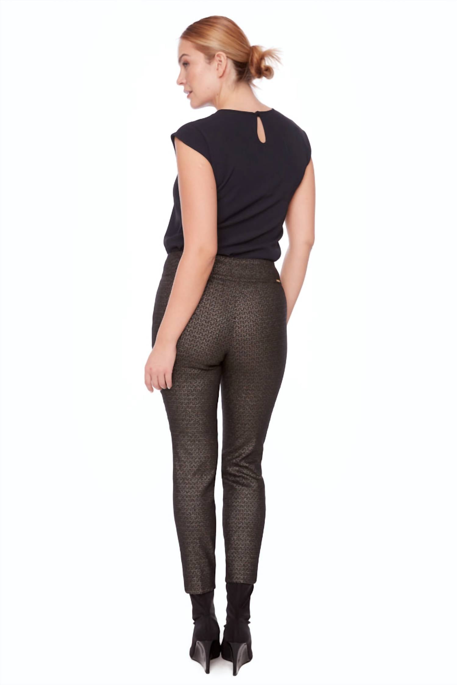 Enhance your wardrobe with this trendy cropped number, designed to blend style and practicality. The comfortable fit allows for easy all-day wear. The perfect length to pair with your favorite mules. Introducing the Petal Slit Techno Ankle Pant by UP!, a chic addition to your wardrobe with its elegant Grey Goldy Plaid pattern. These ankle-length pants, crafted with an elastic waistband for a slim fit, feature built-in tummy control and petal vents, offering a stylish and comfortable wear. Made in Canada, these pants ensure quality and precision in every stitch. With a pull-on closure type, they demand minimal effort in styling, and they are easy to care for with machine wash convenience and tumble dry instructions. Front Rise: 9 ¾”. Inseam: 28”.