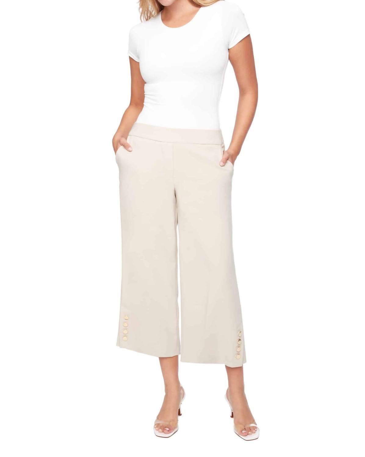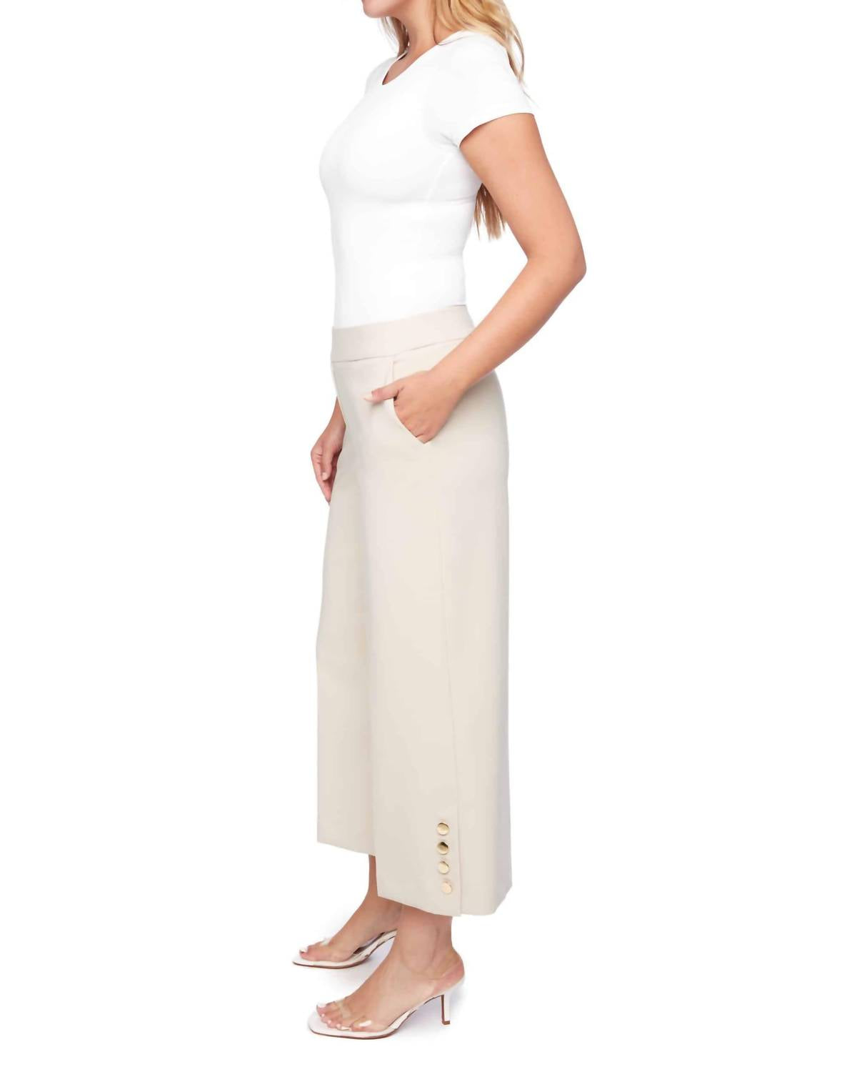 Enhance your wardrobe with this trendy cropped number, designed to blend style and practicality. The comfortable fit allows for easy all-day wear. The perfect length to pair with your favorite mules. Embrace effortless elegance with the Solid Amalfi Wide Leg Crop by UP!, crafted to make a standout addition to any wardrobe in a sophisticated fawn shade. Featuring a pull-on elastic waistband and mid-rise fit, these cropped wide-leg pants offer both comfort and a chic appearance with their marine-inspired side buttons and built-in tummy control. Made from a blend of 90% Polyester and 10% Elastane, they measure a 25" inseam with practical angled side pockets. Care is a breeze with machine washable fabric; simply turn inside out, wash cold on a gentle cycle, and lay flat to dry, iron low on reverse if needed.