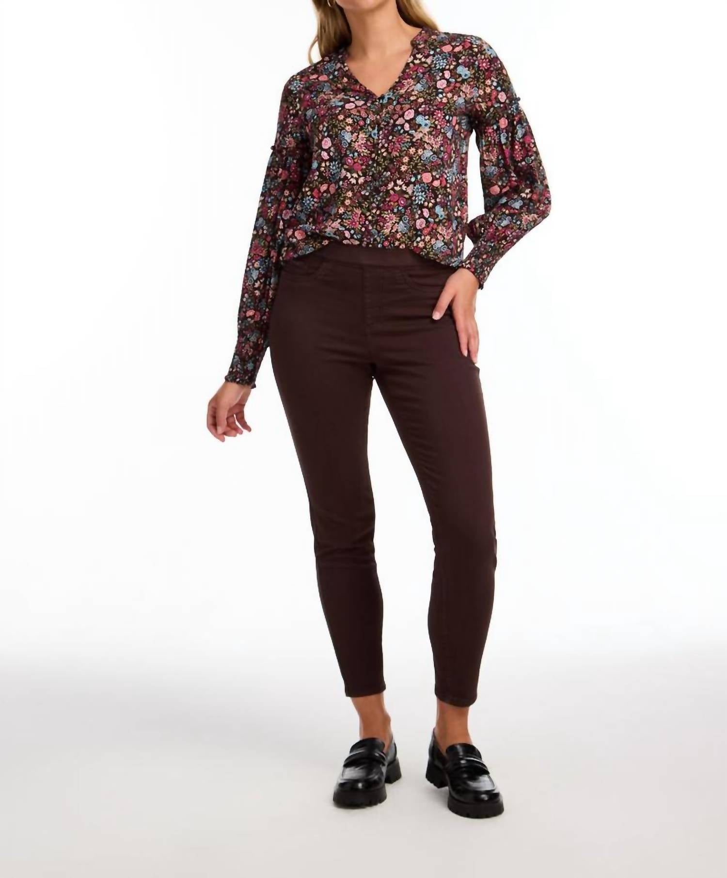 Upgrade your wardrobe with these cropped pants, designed to merge sophistication and wearability. The tailored fit ensures ultimate comfort during long days or nights out. Experience effortless style with the FDJ Pull-on Slim Ankle Pants in a rich brown hue, perfect for your next vacation ensemble. Crafted from 89% cotton, 10% polyester, and 1% elastane, these pants are designed for a high-rise fit with a sleek, slim silhouette. Featuring pockets and a pull-on closure, they blend comfort with functionality. Care instructions recommend machine wash and line dry.