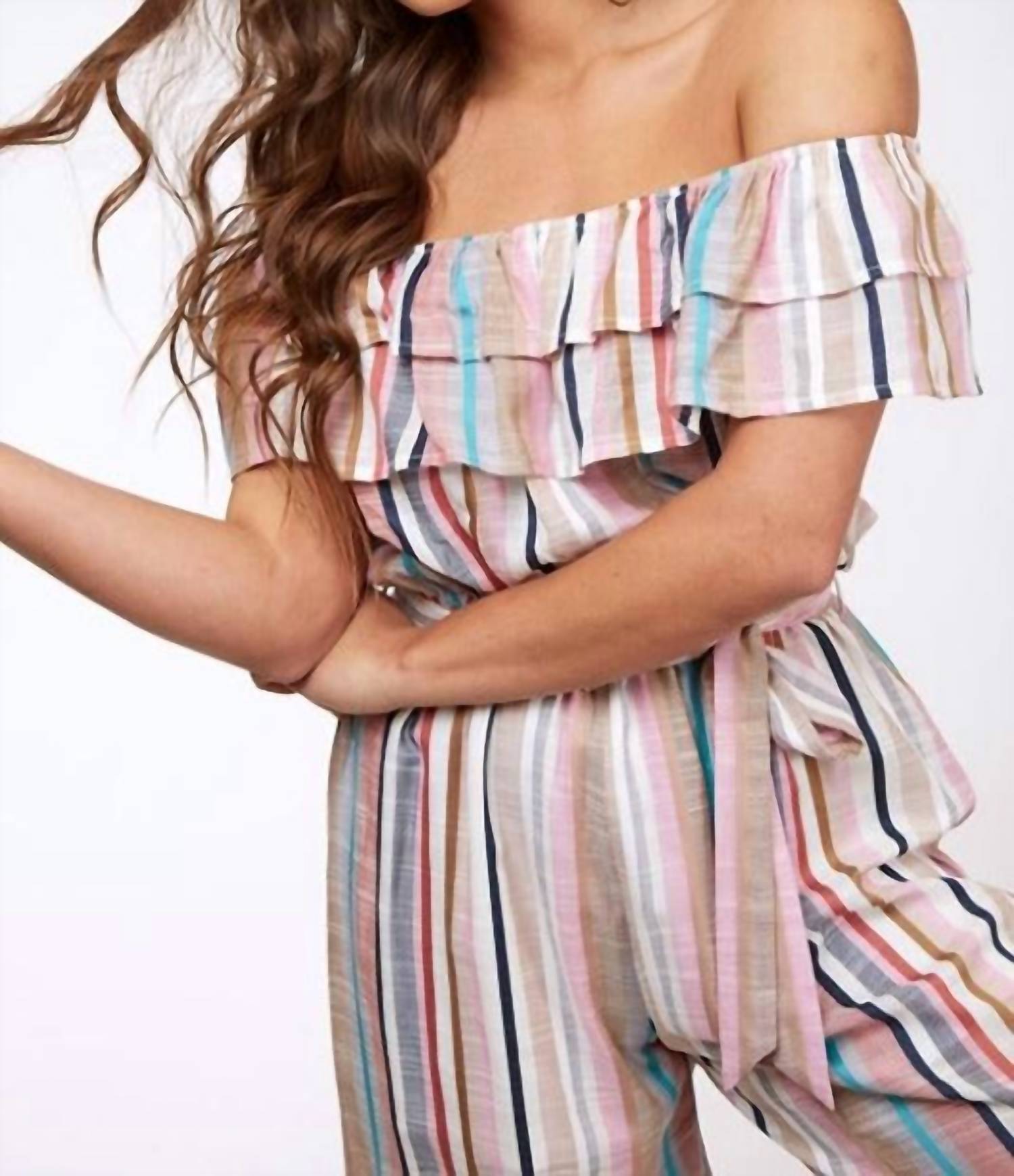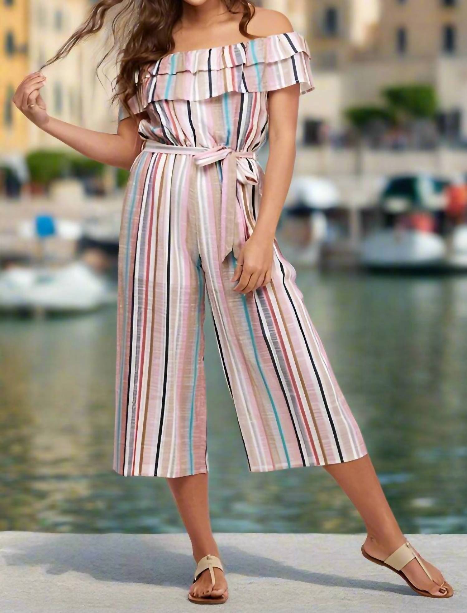 Stay on-trend and showcase your impeccable taste with these adaptable and stylish cropped pants. The perfect length to wear with your favorite mules. You'll love the fit! Show off your warm-weather style with this super cute Peach Love CA Striped Ruffle Capri Jumpsuit, featuring a flirty ruffle off-shoulder neckline and a flattering waist self-tie belt. This semi-sheer piece is crafted from a breezy blend of 51% Rayon and 49% Cotton, with a soft 100% Rayon lining, and hits at a comfortable, below-the-knee capri length. The all-over stripe pattern beautifully incorporates a multi-color palette, including shades like ivory, navy, and dusty pinks. To best maintain this imported statement piece, hand wash cold and lay flat to dry.