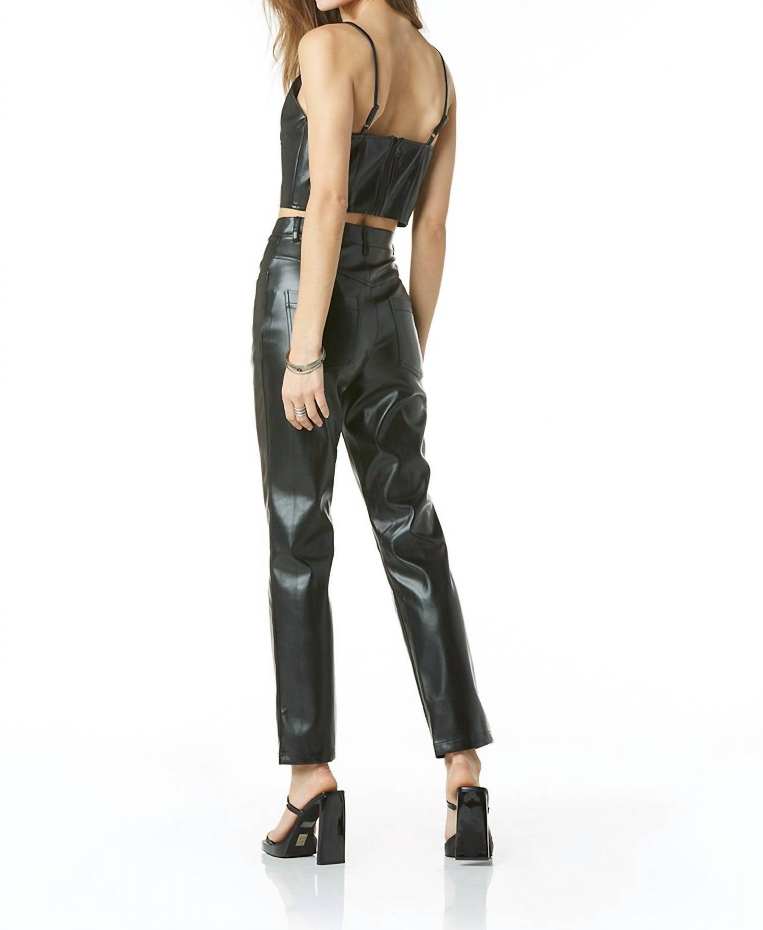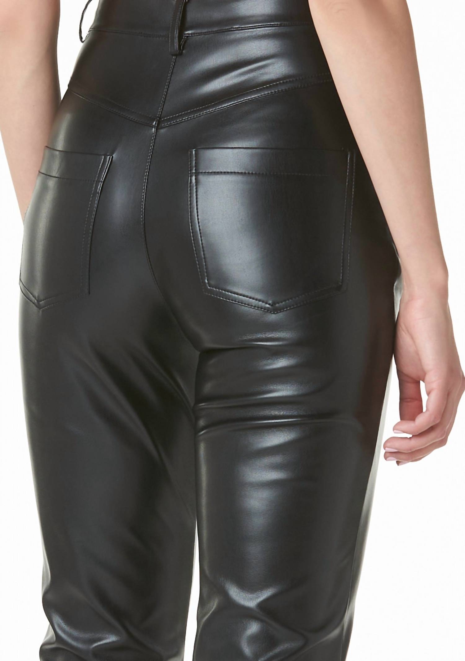 Introducing the Morgan Vegan Leather Pants by Tart Collections, a chic addition to any wardrobe. These high-waisted, slim-fit pants in sleek black feature a straight leg design with a 28-inch inseam and 10.5-inch rise. Crafted from polyurethane, they include practical pockets and a convenient zip closure. For optimal care, dry clean only.
