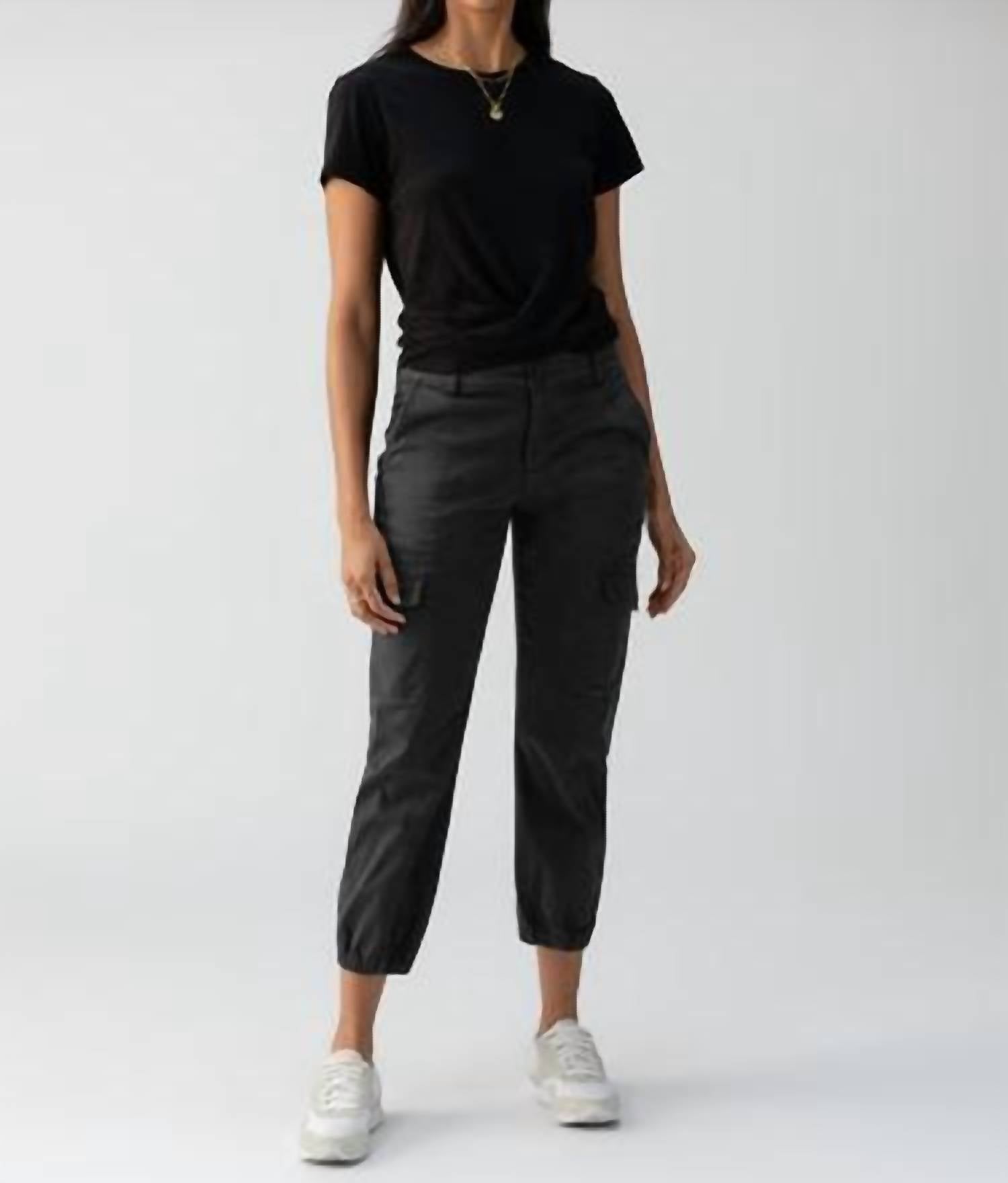 Stay on-trend and showcase your impeccable taste with these adaptable and stylish cropped pants. The perfect length to wear with your favorite mules. You'll love the fit! Elevate your casual wardrobe with the Sanctuary Rebel Cargo Pant in a solid Obsidian shade, designed for the fashion-forward woman. These mid-rise, relaxed fit pants are crafted from a 97% Cotton, 3% Spandex blend with a tapered leg and a 27-inch inseam. Featuring practical pockets and elasticized cuffs, they are secured with a button closure for effortless wear. Care instructions: Machine wash and line dry, making them perfect for Spring streetwear and vacation outings.