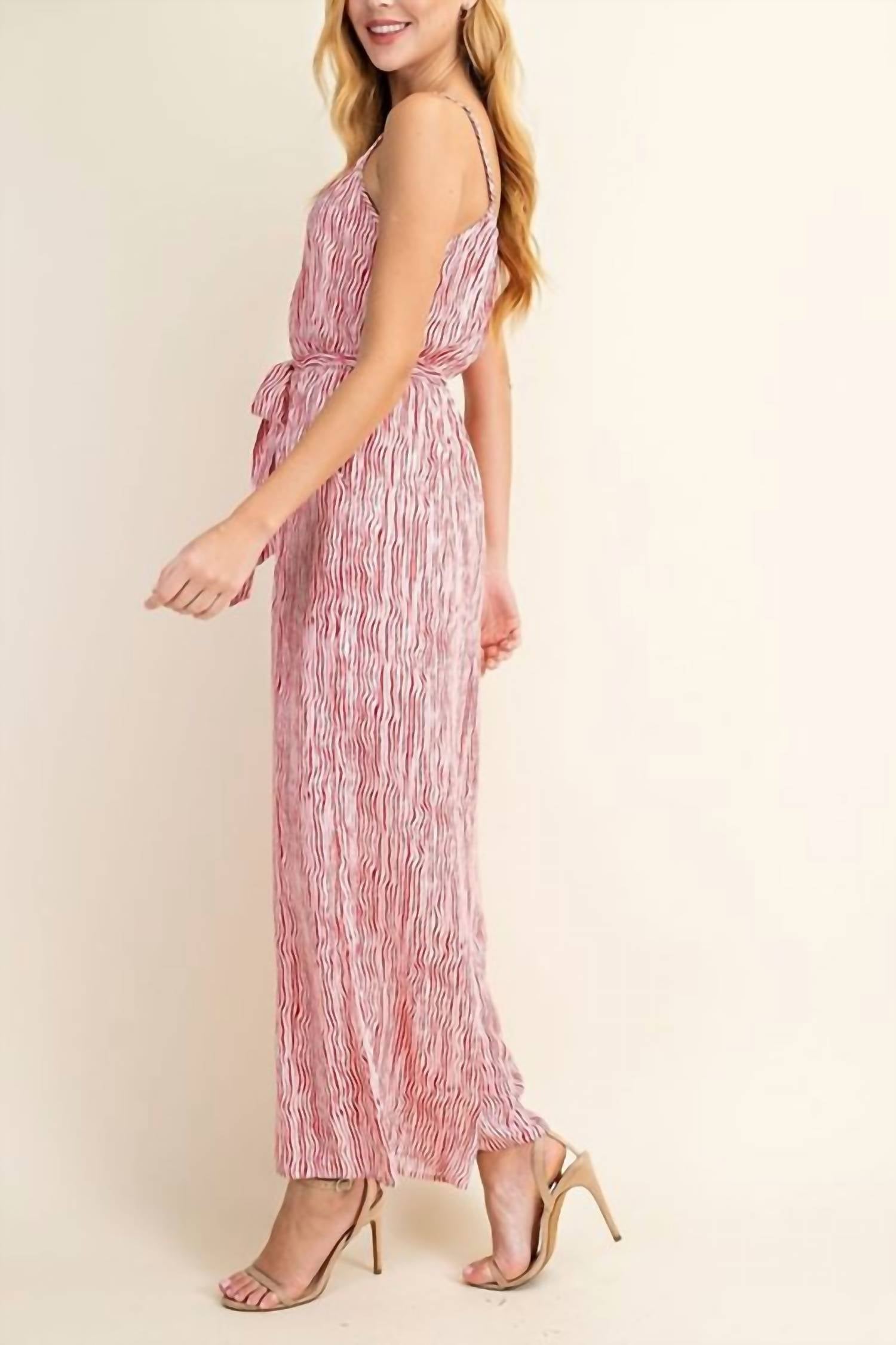 Enhance your wardrobe with this trendy cropped number, designed to blend style and practicality. The comfortable fit allows for easy all-day wear. The perfect length to pair with your favorite mules. Step into summer bliss with our wavy striped jumpsuit! Crafted from 100% Rayon for elegance. Featuring adjustable straps, a comfy elastic waistband, and handy side pockets, it's perfect for beach days or garden parties. Soft, stylish, and cute, this red/pink piece is your go-to for effortless charm. Machine wash cold for maintenance.