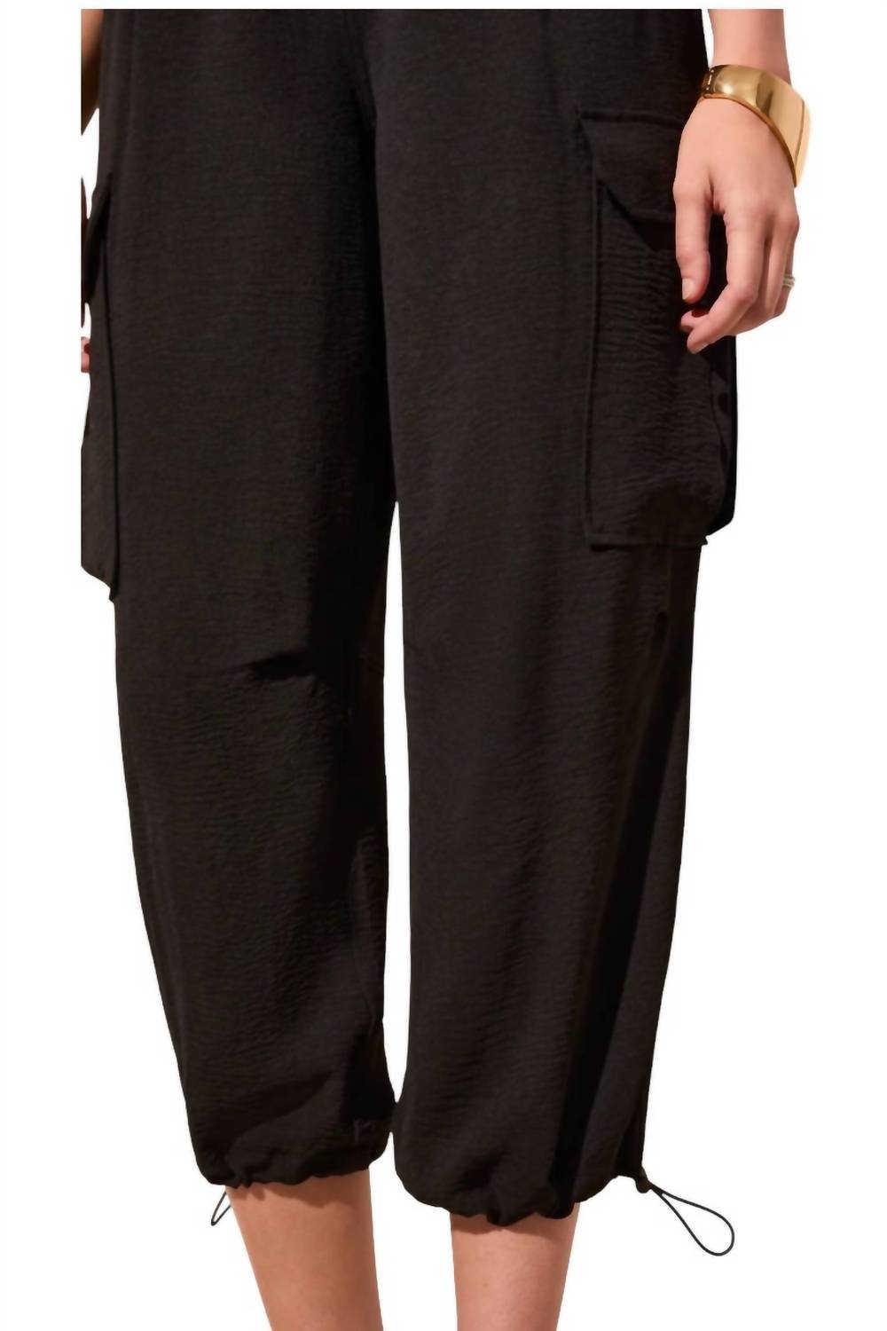Enhance your wardrobe with this trendy cropped number, designed to blend style and practicality. The comfortable fit allows for easy all-day wear. The perfect length to pair with your favorite mules. Embrace the rugged charm of the Flowy Pull-on Cargo Pant with Bungee Cord by TRIBAL, designed for versatile streetwear style. These solid black pants feature a flowy fit and tapered leg with bungee cord accents, enhancing both comfort and aesthetic appeal. Made from 100% Polyester airflow woven stretch fabric, they include practical cargo pockets and a mid-rise, pull-on waist for convenience. Care for these pants with a machine wash and line dry to keep them looking fresh for your spring travel adventures.