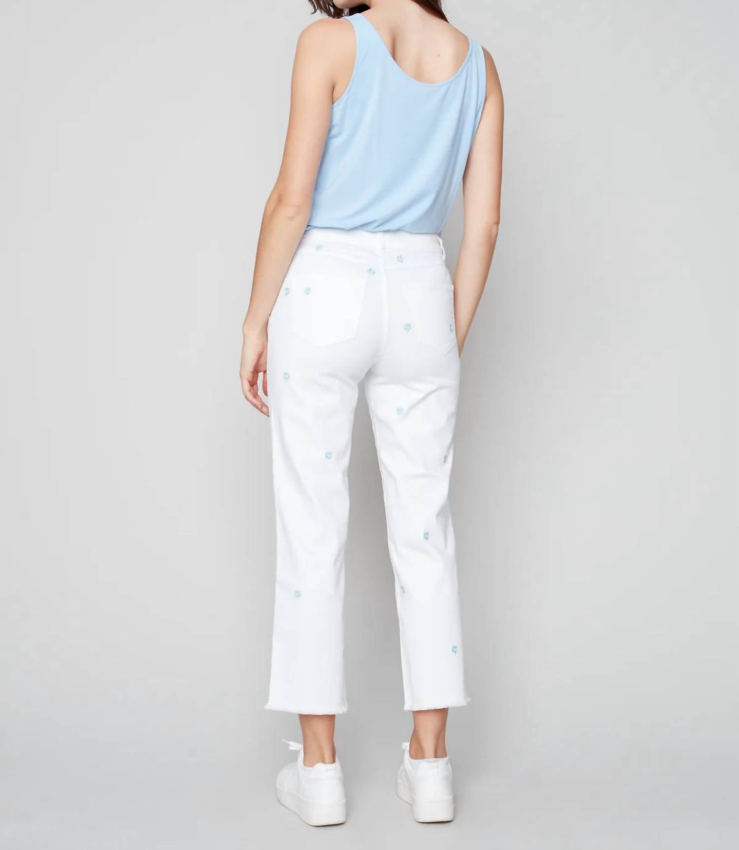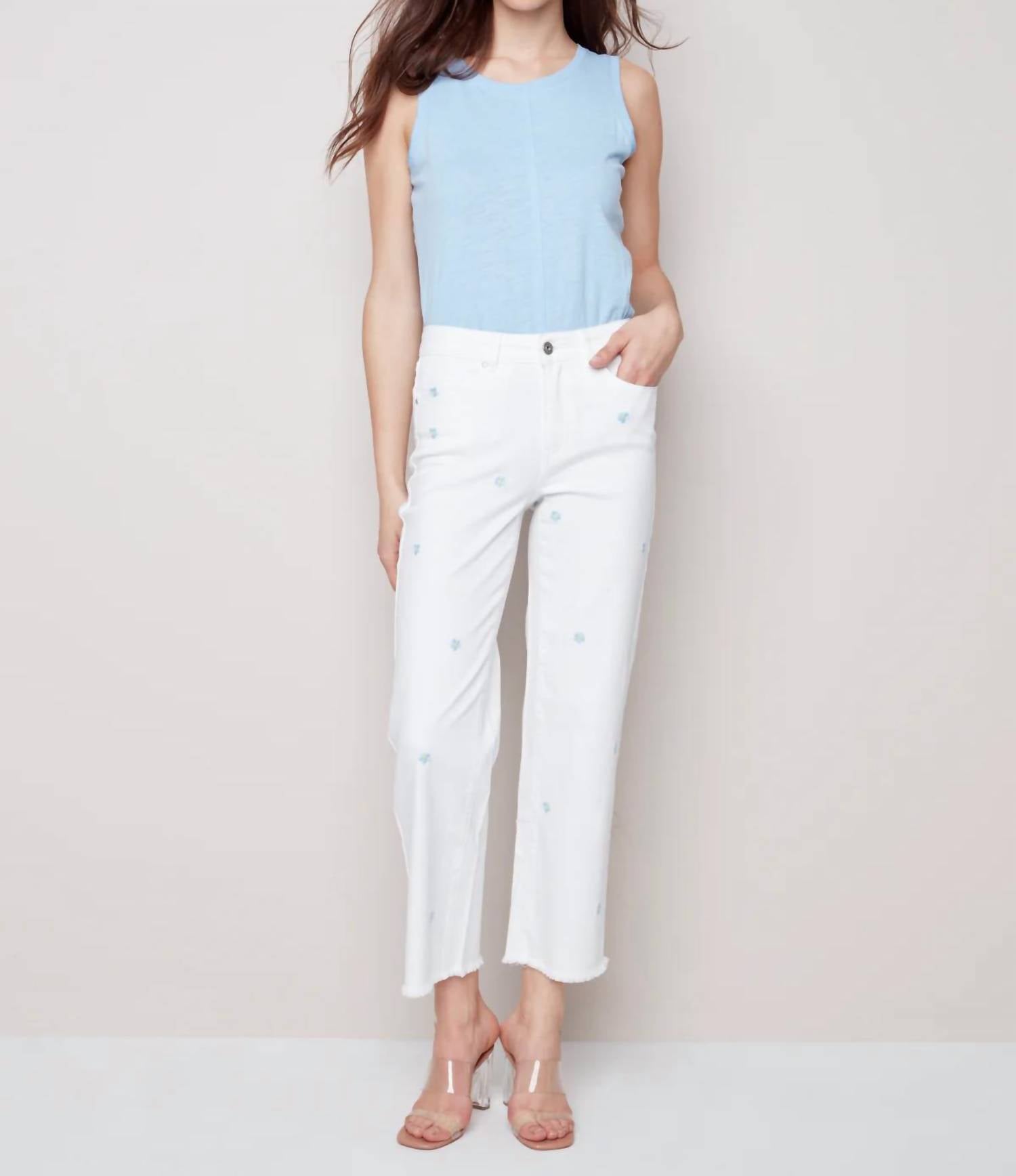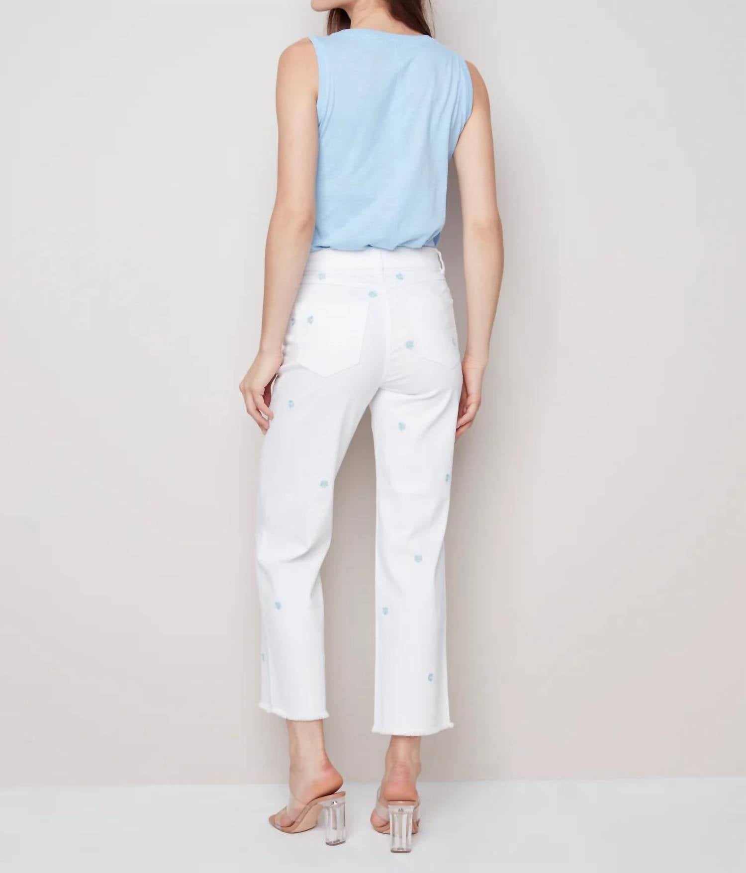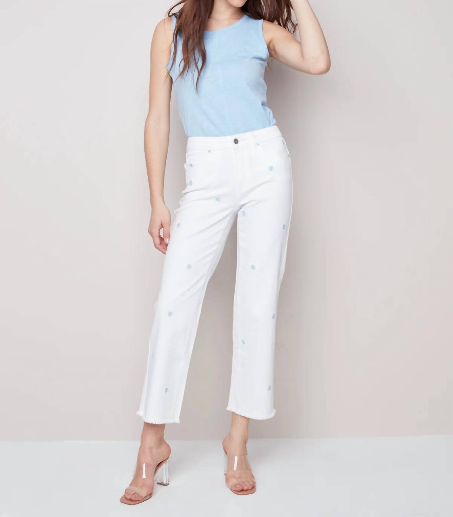 Upgrade your wardrobe with these cropped pants, designed to merge sophistication and wearability. The tailored fit ensures ultimate comfort during long days or nights out. Introducing the Embroidered Flower Pants by CHARLIE B, designed to elevate your summer wardrobe with a playful embroidered daisy motif. These ankle-grazing pants in straight-leg style are crafted from 97% Cotton and 3% Spandex for comfort and flexibility, complemented by convenient side pockets. Made from Denim, they feature a zip closure for ease and style. For care, machine wash and lay flat to dry. Model is 5'9"/175 cm and wears a size 6, with an approximate inseam of 28" (71 cm) for size 12.