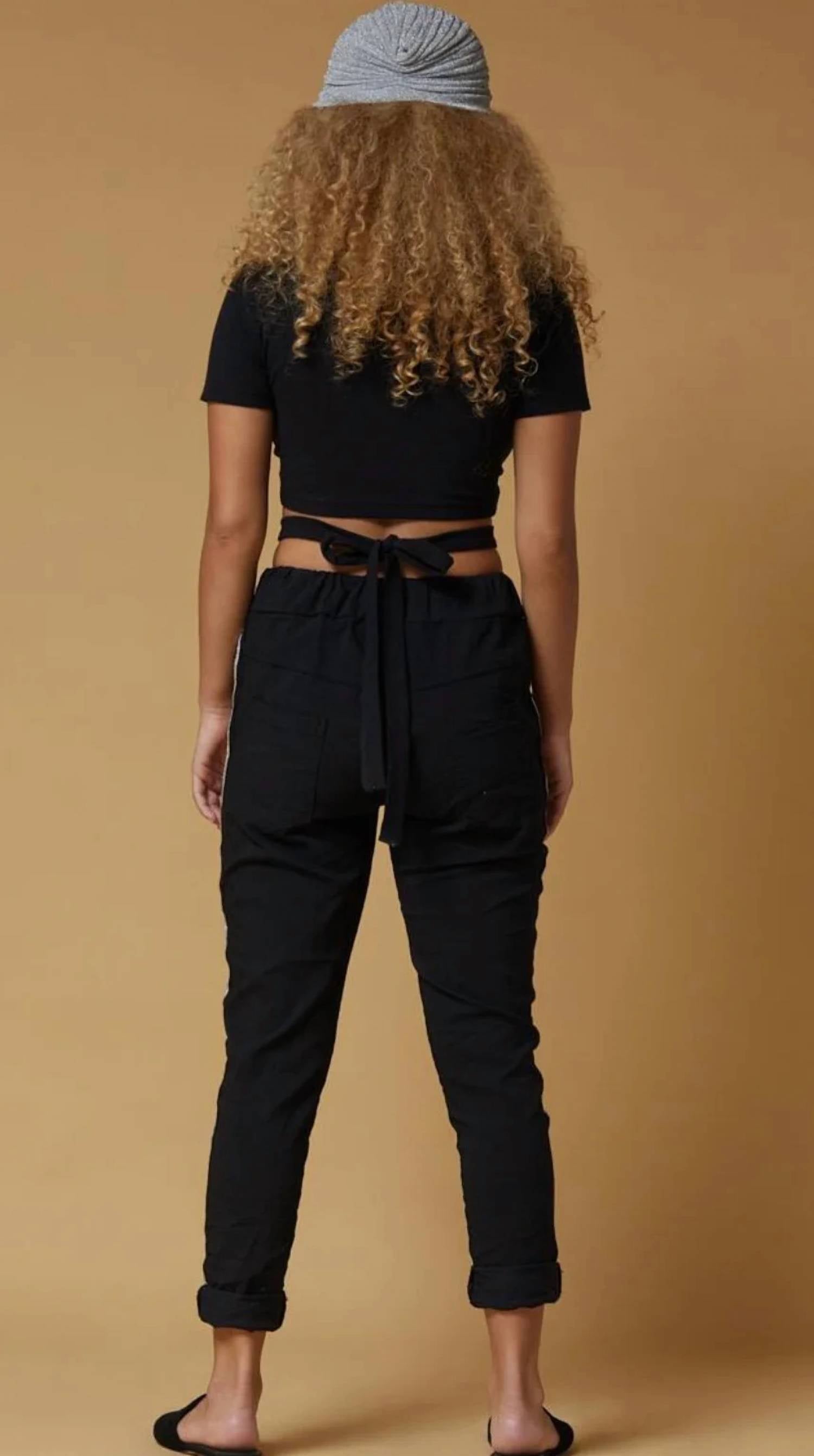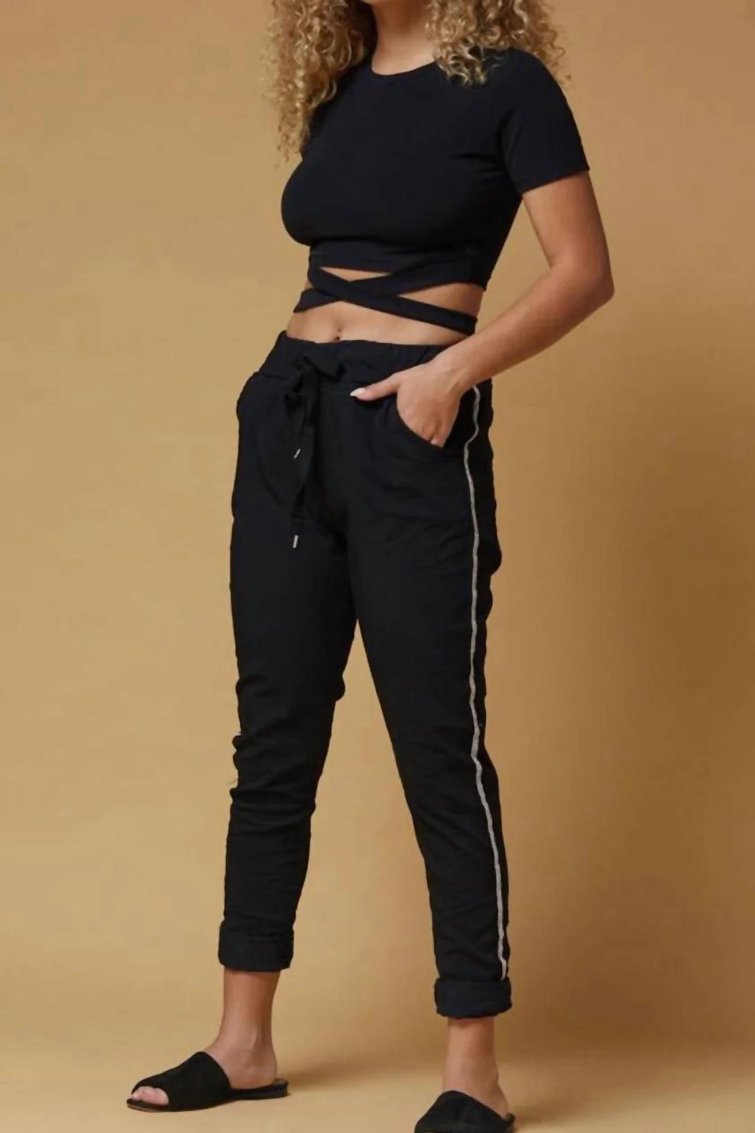 Enhance your wardrobe with this trendy cropped number, designed to blend style and practicality. The comfortable fit allows for easy all-day wear. The perfect length to pair with your favorite mules. The Malika Pants by Scandal Italy blend a vintage aesthetic with modern comfort, perfect for off-duty style. These black, high-rise pants feature cargo side pockets and an embellished stripe down the leg, adding a touch of flair to your wardrobe. Crafted in Italy from a blend of 70% rayon, 27% nylon, and 3% spandex, they have a tapered leg and slim fit for a flattering silhouette. Enjoy the convenience of a pull-on closure with an adjustable drawstring waistband, and keep them looking their best with hand wash care.