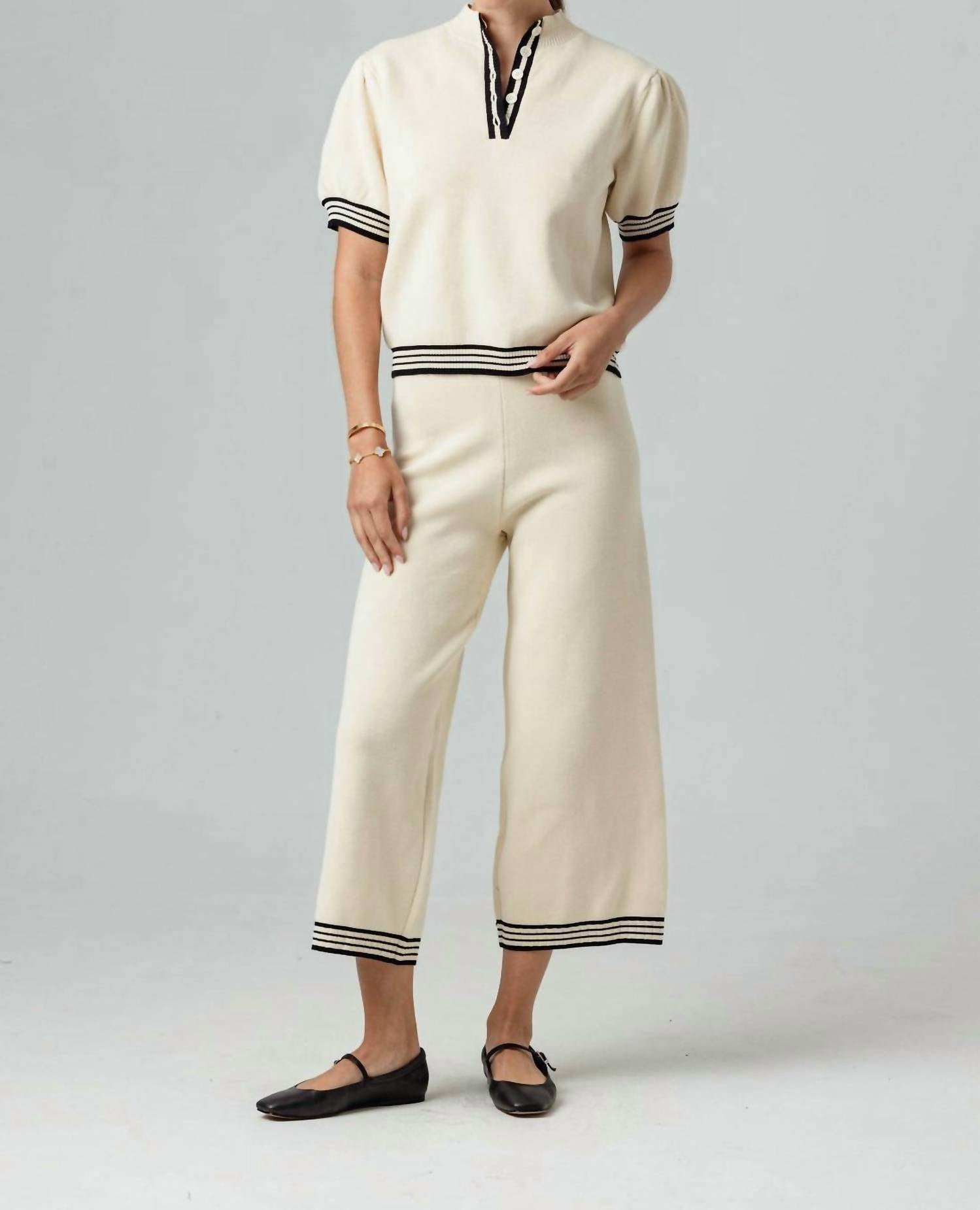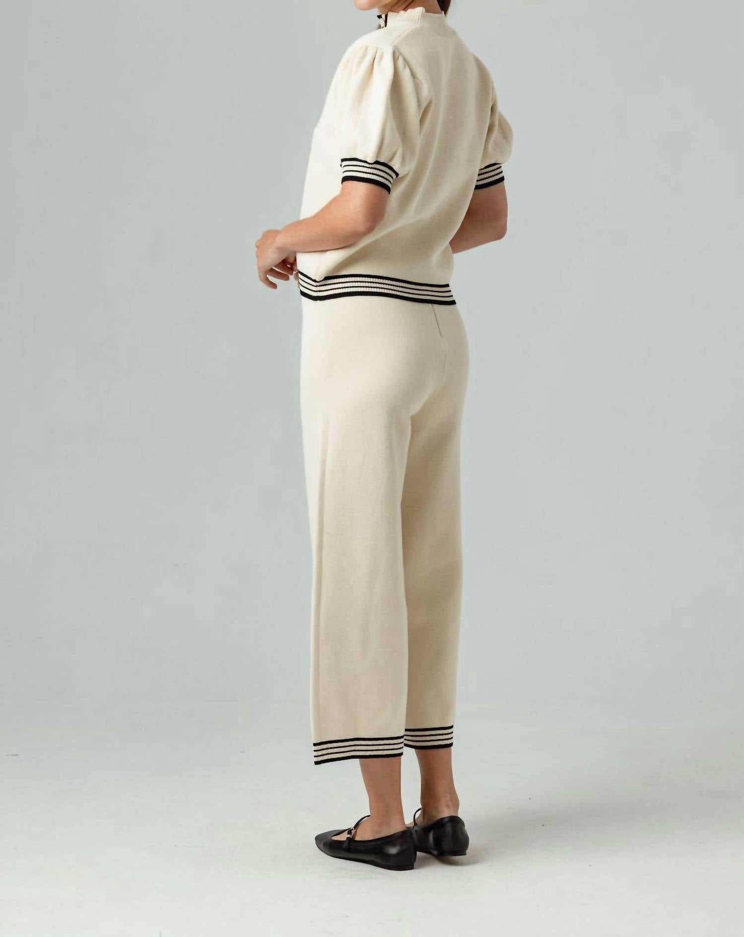 Stay on-trend and showcase your impeccable taste with these adaptable and stylish cropped pants. The perfect length to wear with your favorite mules. You'll love the fit! Experience effortless elegance with the Quinn Pant by Sundays, crafted with 100% cotton for a luxe feel. These high-rise pants feature a crop-wide leg design and a contrasting black stripe, seamlessly blending style and comfort. The pull-on closure complements their relaxed fit, ideal for travel or chic casual wear. Care is simple with machine wash and tumble dry instructions, making the Quinn Pant a versatile addition to any wardrobe.