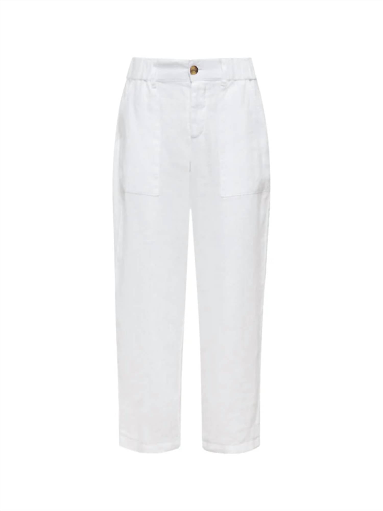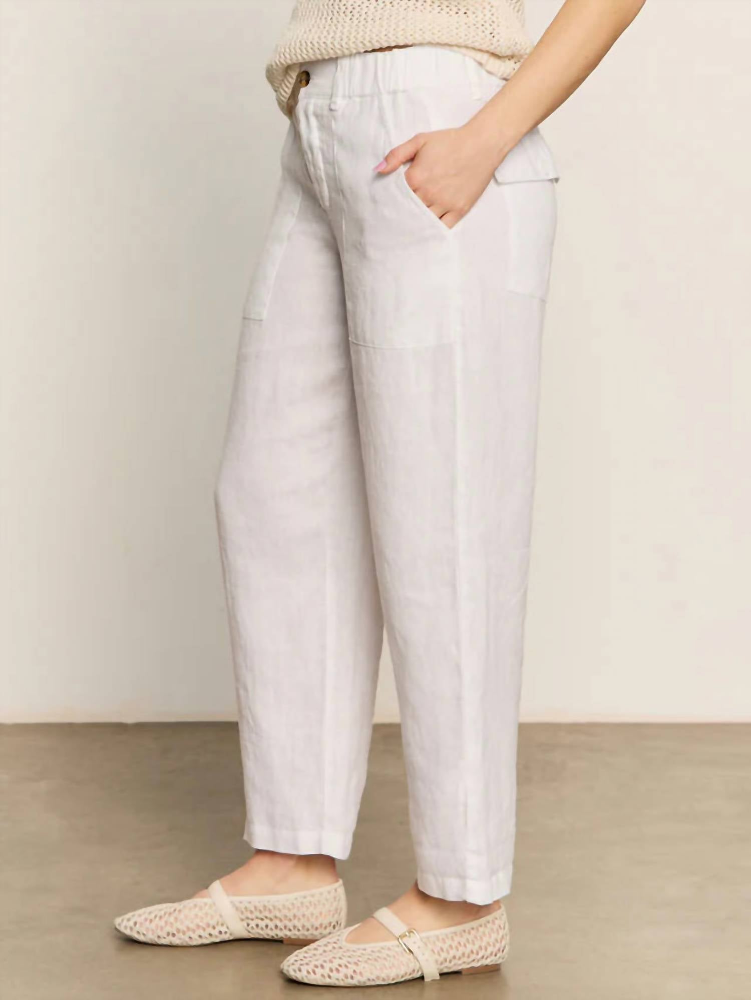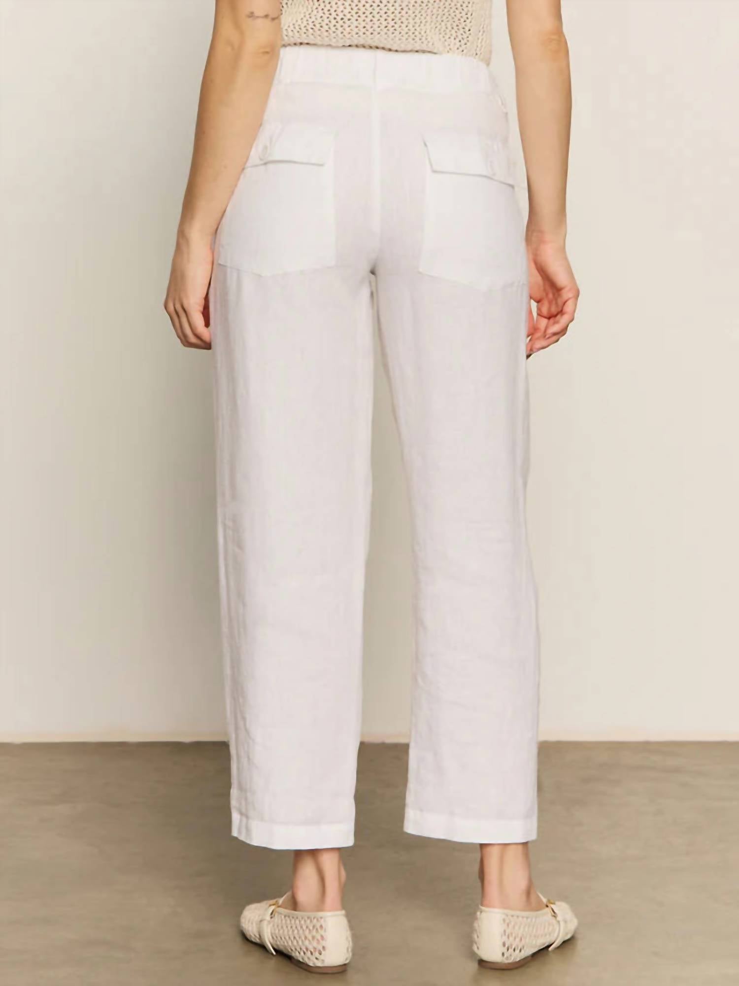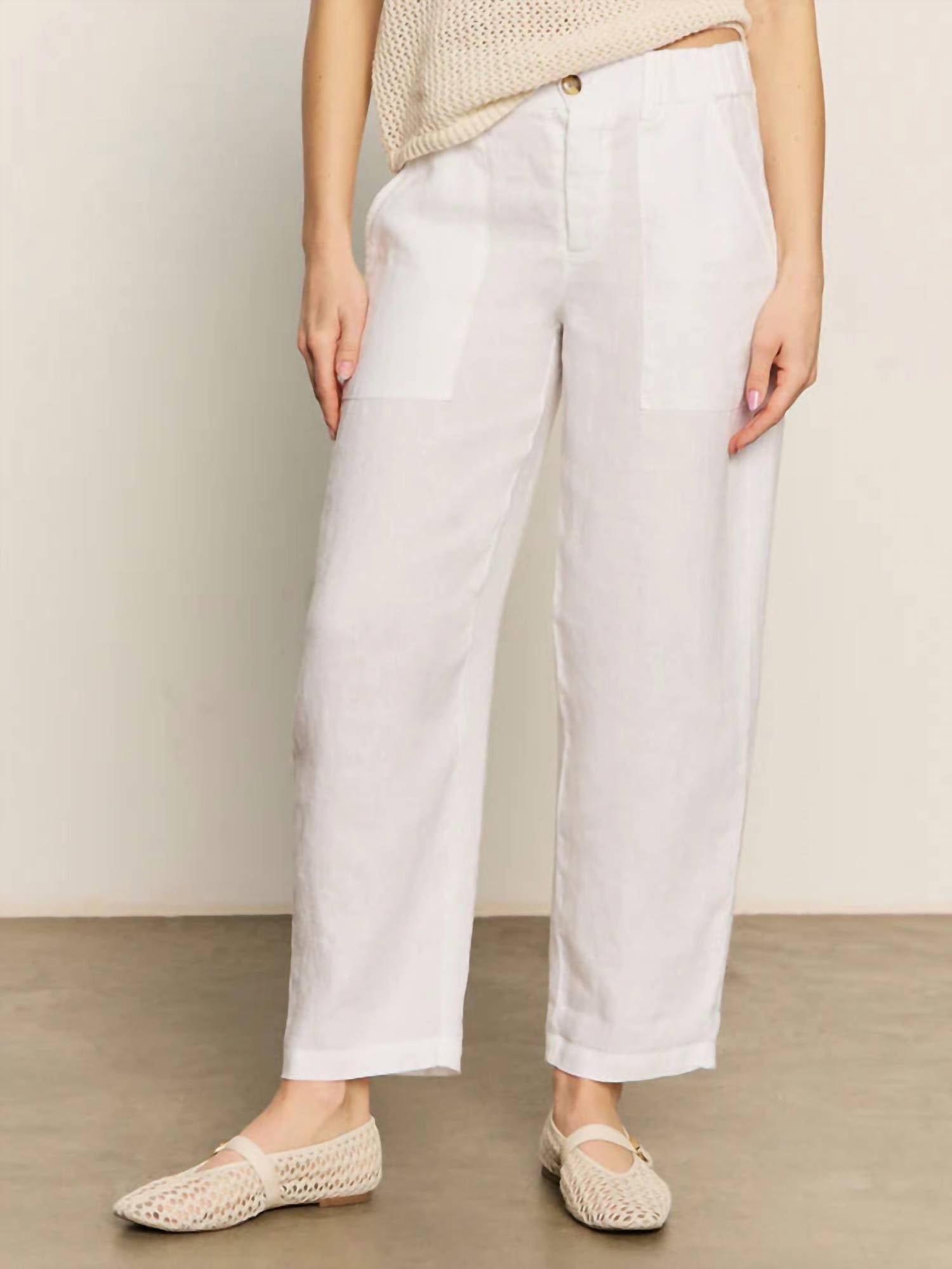 Stay on-trend and showcase your impeccable taste with these adaptable and stylish cropped pants. The perfect length to wear with your favorite mules. You'll love the fit! Experience the ultimate blend of comfort and style with the Relaxed Linen Cruiser Pant by Sanctuary. These wide-leg, mid-rise pants are crafted from 100% linen in a striking bleached white, perfect for any casual summer occasion. Featuring a convenient zip closure, they're made for versatility with functional pockets and a relaxed fit that rolls up to a 26" inseam. Care for them easily with machine wash and tumble dry low instructions. Model is 5'9" and wearing a size 27 with a waist measurement of 28 1/2" and a front rise of 11".