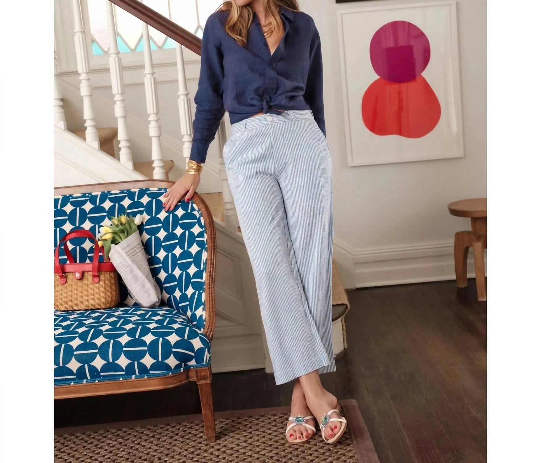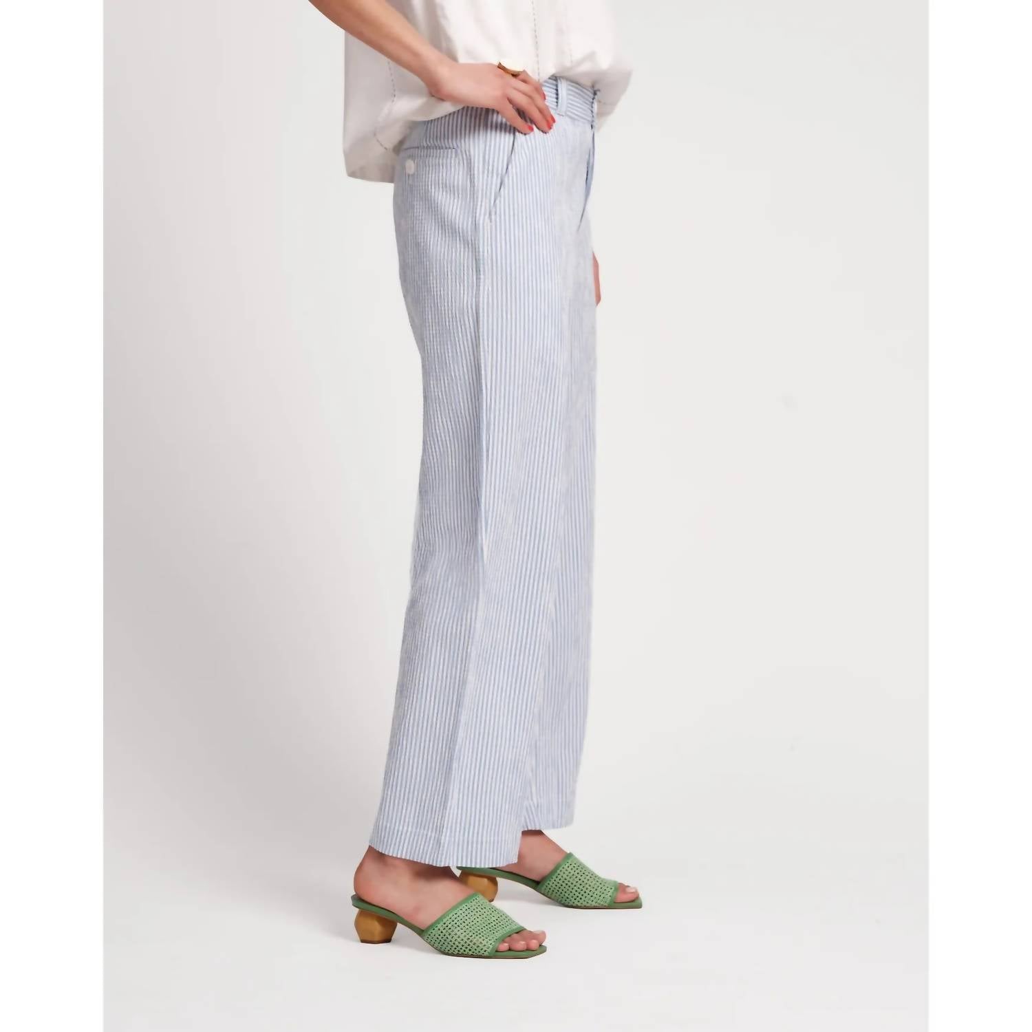 Upgrade your wardrobe with these cropped pants, designed to merge sophistication and wearability. The tailored fit ensures ultimate comfort during long days or nights out. Meet the Coleman Pant by FRANCES VALENTINE, a stylish addition to any spring wardrobe. Featuring a relaxed fit with a button closure at the ankle, these pants are crafted in a light blue and white striped seersucker. The tapered leg is made from a premium blend of 56% Viscose, 42% Cotton, and 2% Elastane, offering comfort and a touch of stretch. Originating from Turkey, these pants are perfect for both casual afternoons and refined evenings. Care for them with a machine wash on a cold delicate cycle and lay flat to dry or opt for a professional dry clean.
