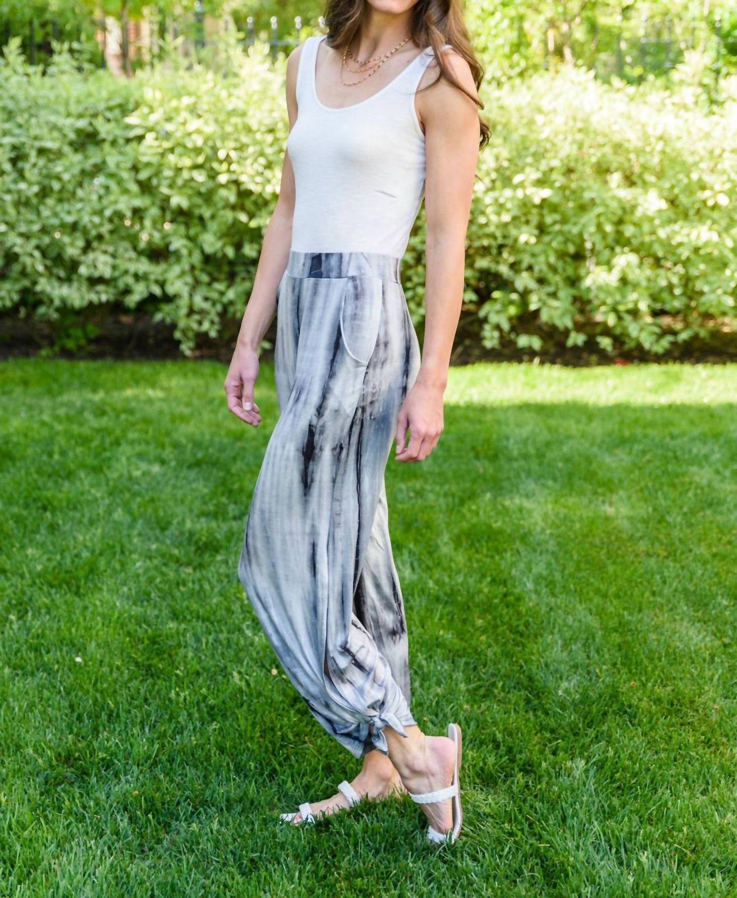 Stretchy. Lightweight. Encased soft elastic waistband . Side slits with adjustable tie option. 95% Rayon, 5% Spandex. Made In USA. Wash cold, hang dry. True to size, fowy, loose fit throughout.