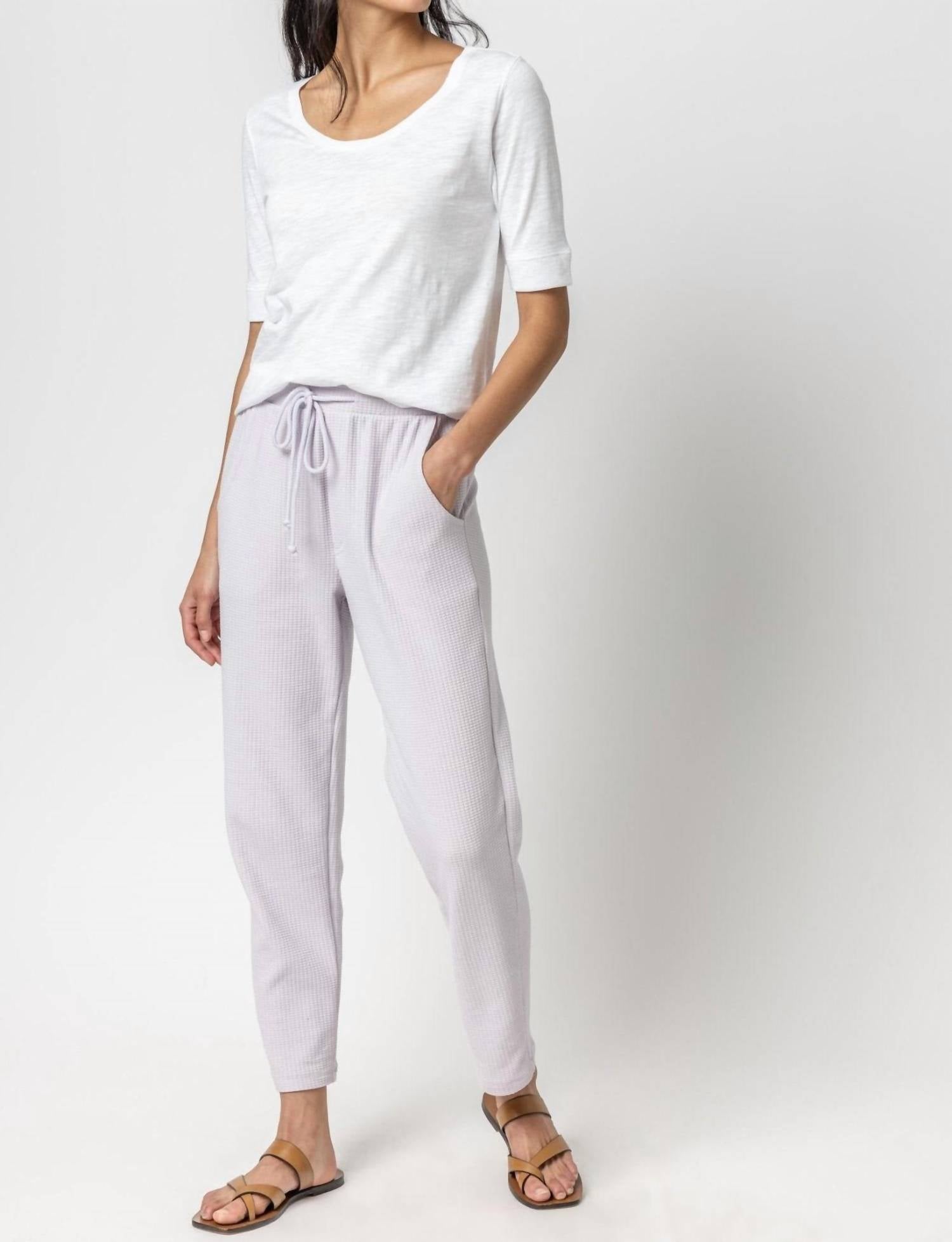 Stay on-trend and showcase your impeccable taste with these adaptable and stylish cropped pants. The perfect length to wear with your favorite mules. You'll love the fit! Discover the perfect blend of comfort and sophistication with the Lilla P Straight Leg Waffle Knit Pant in Thistle. These women's pants showcase a textured, lightweight waffle-knit fabric with a relaxed ankle-length silhouette and high-rise fit. With functional pockets and a pull-on style featuring an elasticized drawstring waist, they promise ease and versatility. Perfect for off-duty activities, these pants are an effortless addition to your wardrobe.