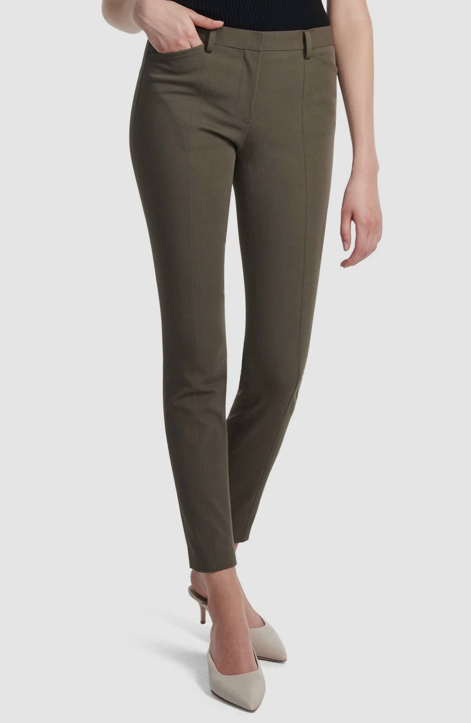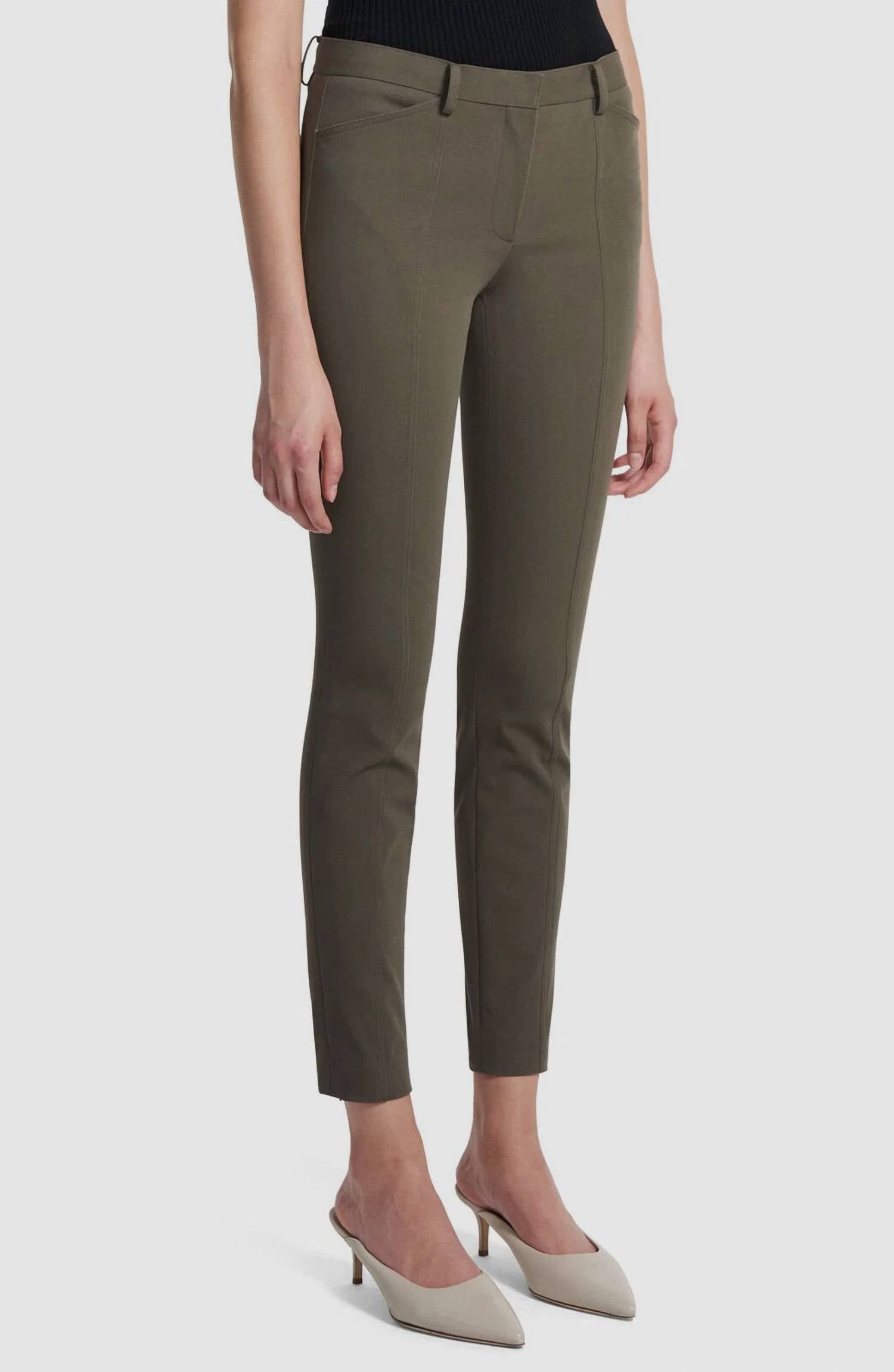 Upgrade your wardrobe with these cropped pants, designed to merge sophistication and wearability. The tailored fit ensures ultimate comfort during long days or nights out. Introducing the Bi-stretch Seam Skinny Trouser Pants by Theory, tailored for the modern woman in versatile Teak Green. These trousers feature a high-rise design with a tapered leg and a sleek hook and eye closure. Crafted from a cotton blend with 93% Cotton and 7% Elastane, they offer a comfort fit and are detailed with trouser elements and flat-felled seams. Highlighted by western front pockets and invisible back zip vents, these trousers showcase Italian craftsmanship with an inseam of 28" and a rise of 10".