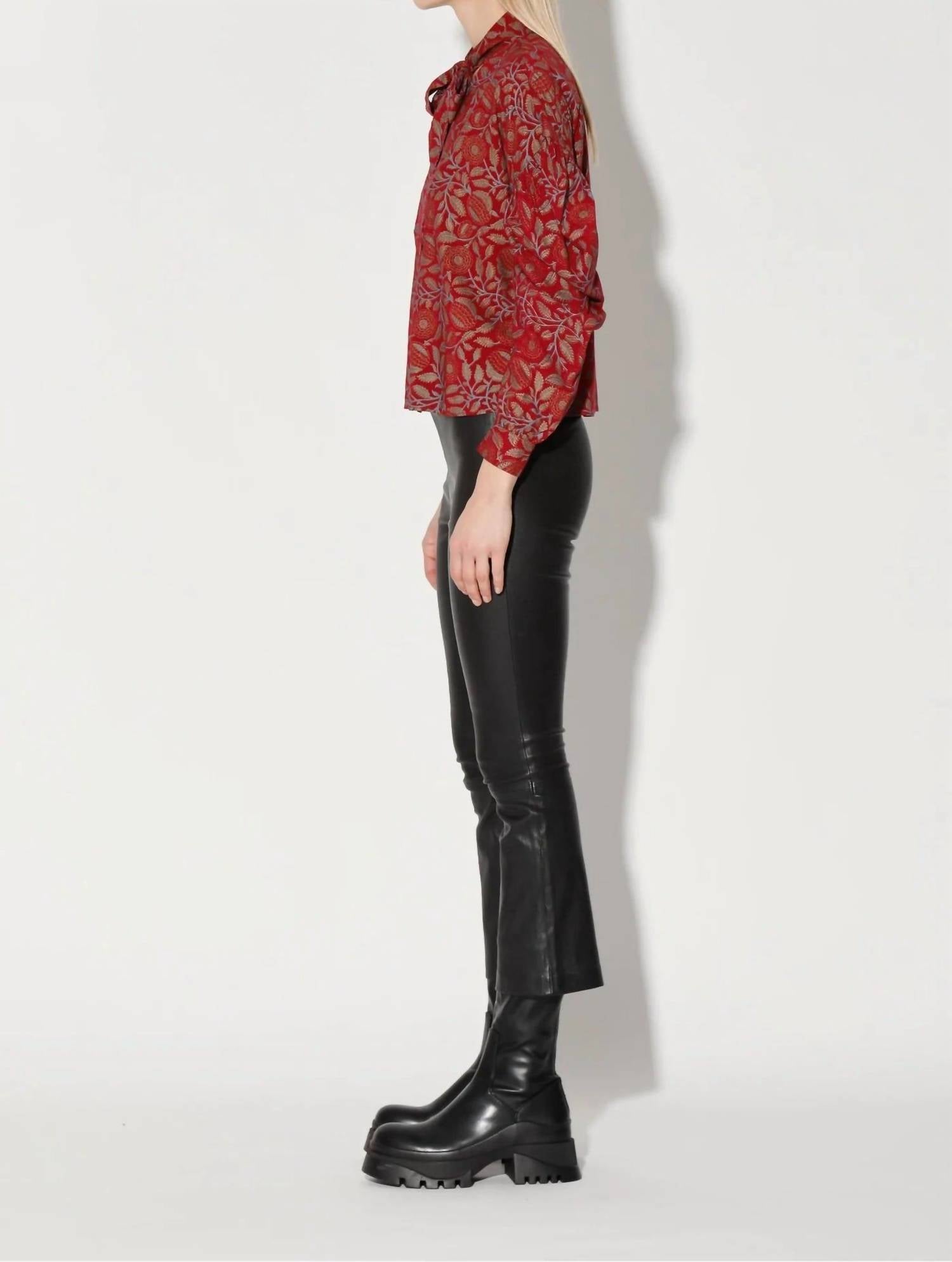 Stay on-trend and showcase your impeccable taste with these adaptable and stylish cropped pants. The perfect length to wear with your favorite mules. You'll love the fit! Introducing the Lori Pants by Walter Baker, crafted for elegance in classic black with a minimalist flare. These women's pants feature a mid-rise waist and flared leg, enhancing their modern cropped style. Composed entirely of 100% stretch leather, they offer a comfortable pull-on closure for easy wear. Perfect for fall, these pants are a sophisticated choice for Thanksgiving gatherings and holiday parties.