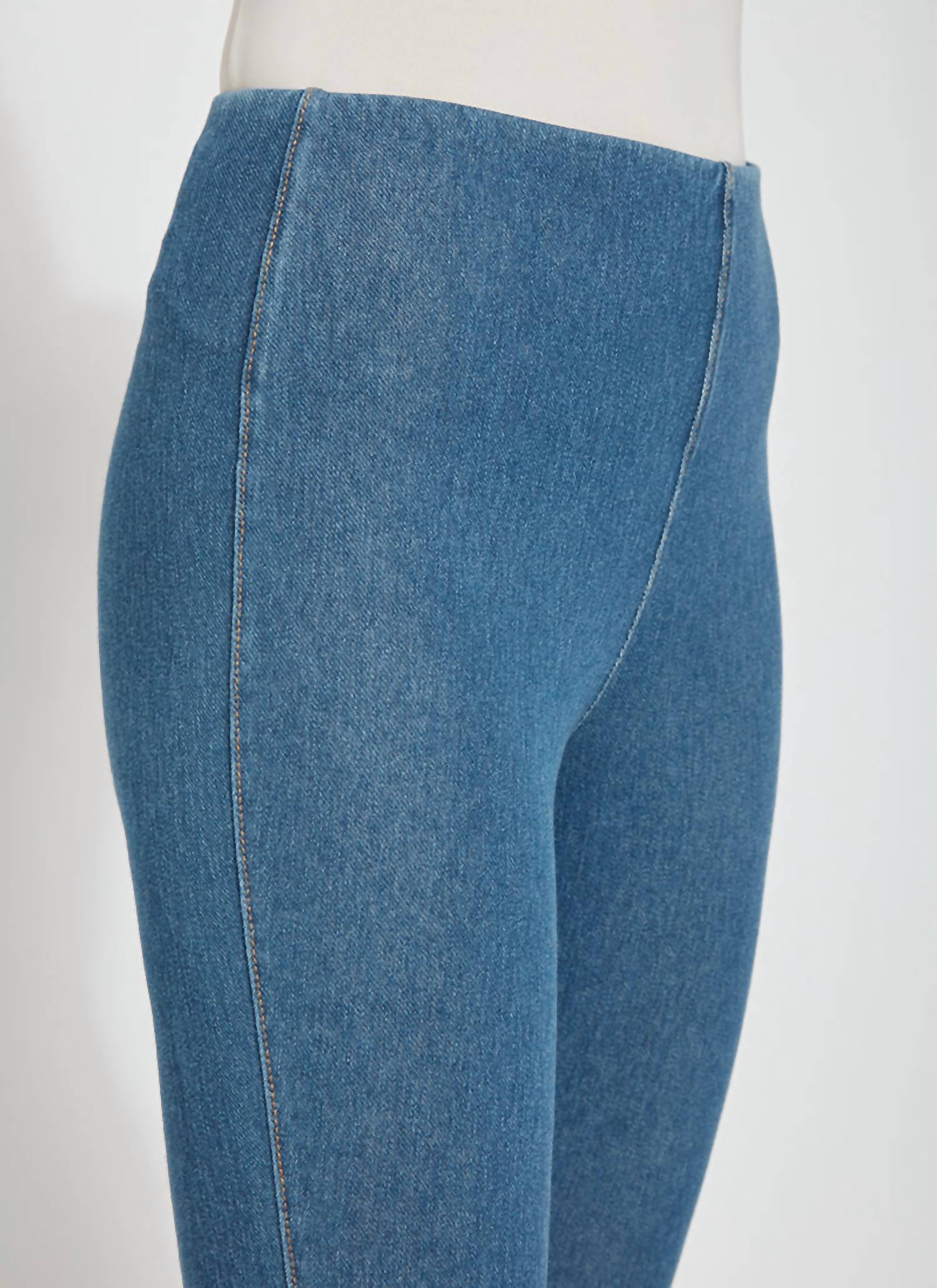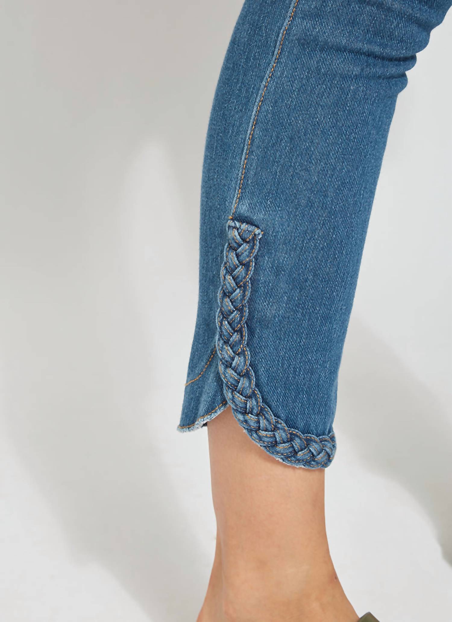 Upgrade your wardrobe with these cropped pants, designed to merge sophistication and wearability. The tailored fit ensures ultimate comfort during long days or nights out. Discover the Happy Hour Braided Crop Pants by Lyssé, crafted in a 4-way stretch Knit Denim composition of 95% Cotton and 5% Spandex. These mid-rise, pull-on pants are cut to a cropped length with a 26" inseam and a tailored fit through the waist, hips, and thighs. Highlighted by a concealed patented waistband and a distinctive raw-edge, scalloped hem with hand-braided detailing, they offer a contemporary appeal in a solid Mid Wash. Conveniently machine washable and dryer safe, these pants ensure easy care and enduring style. Model is 5’10” wearing a size Small.