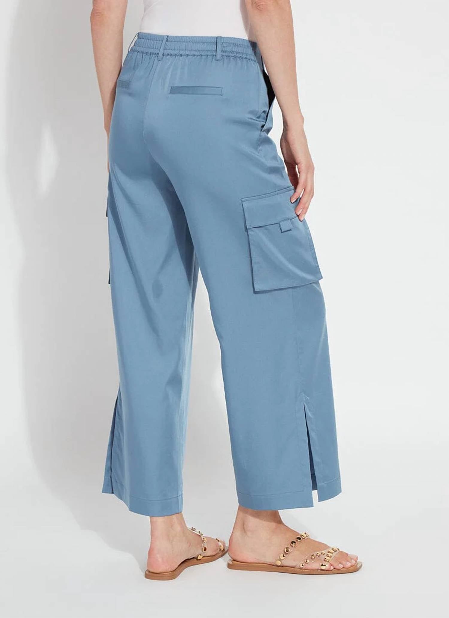 Stay on-trend and showcase your impeccable taste with these adaptable and stylish cropped pants. The perfect length to wear with your favorite mules. You'll love the fit! Discover the Calypso Ankle Cargo Pant by Lysse, a sophisticated yet casual addition to your wardrobe crafted from Fluid Stretch Satin for ultimate comfort and style. These Solid Bleached, high-rise cargos boast a comfortable pull-on closure and multiple pockets, including front cargo, side, and faux welt back pockets. Made from 54% Tencel, 43% Polyester, and 3% Spandex, they feature a cropped length with a 27" inseam, wide leg style, and side seam slits for added flair. Easy to care for, simply machine wash and line dry. The model is 5'10" and wears a size S.