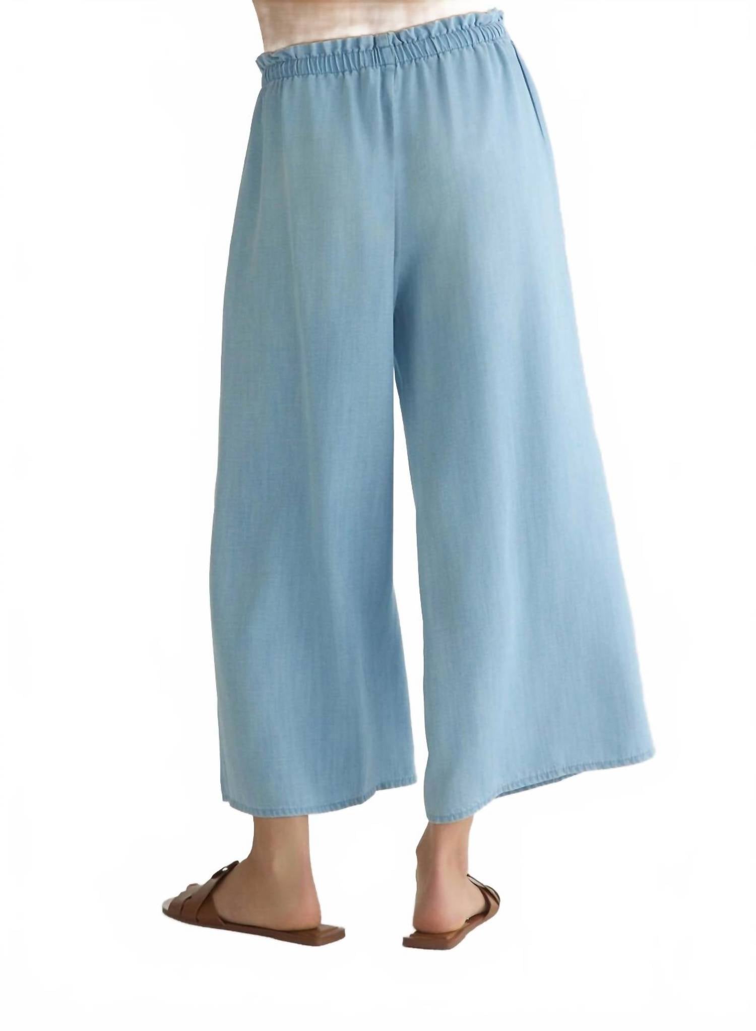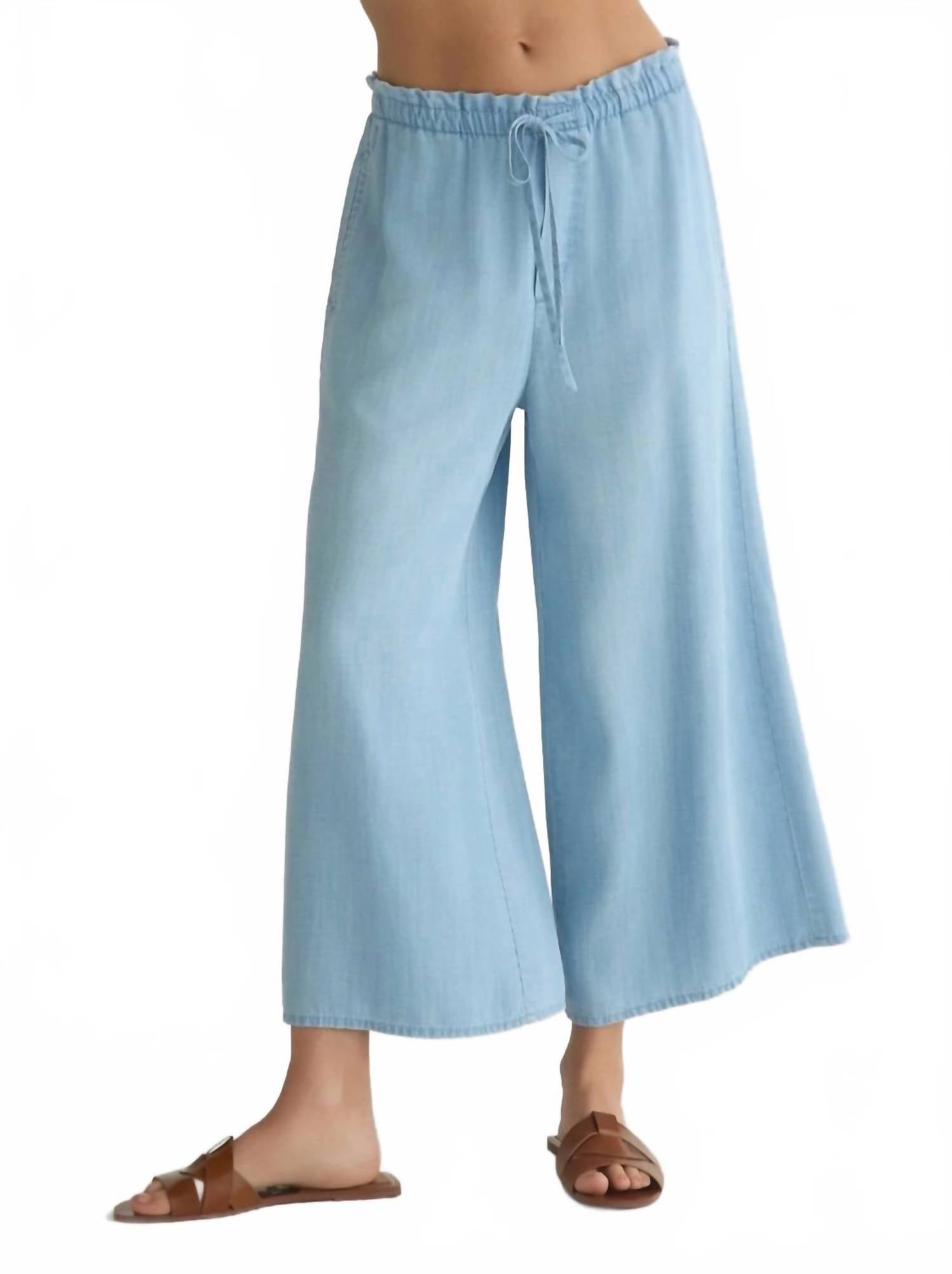 Enhance your wardrobe with this trendy cropped number, designed to blend style and practicality. The comfortable fit allows for easy all-day wear. The perfect length to pair with your favorite mules. Elevate your summer wardrobe with the Ruffle Waist Wide Leg Crop Pants from Bella Dahl, designed in a fresh Light Riviera Wash for a streetwear edge. These women's pants feature a regular fit with a straight leg style, crafted entirely from 100% TENCEL Lyocell for lightweight comfort. The pull-on closure adds ease to your dressing routine, while functional pockets enhance utility. Measuring 47.5 in length, these versatile pants are easy to care for with hand wash and line dry instructions, perfect for travel occasions and holiday attire.