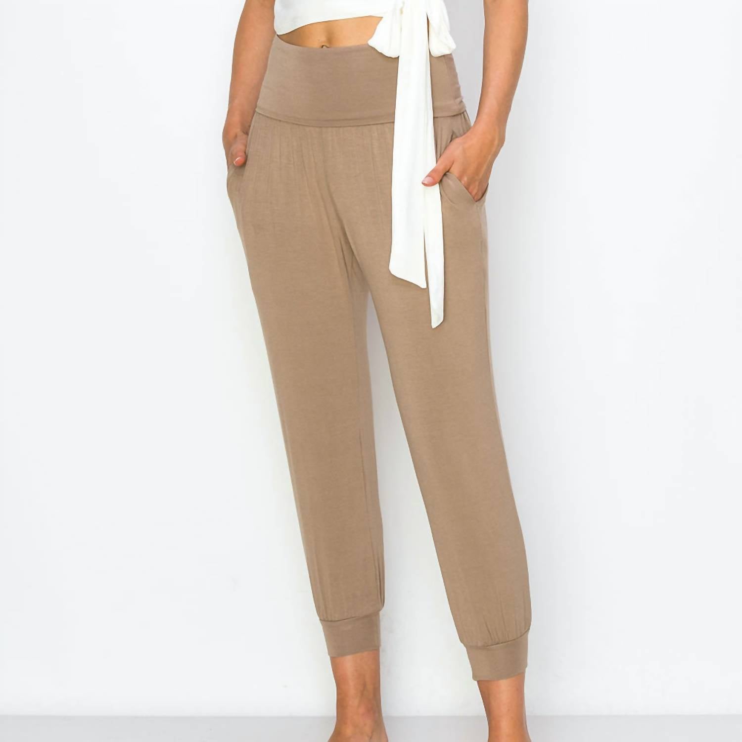 Enhance your wardrobe with this trendy cropped number, designed to blend style and practicality. The comfortable fit allows for easy all-day wear. The perfect length to pair with your favorite mules. Discover the Bamboo Yoga Pant by BijouRocks, a must-have for every active wardrobe in elegant taupe. With a relaxed fit and high-rise waist, these ankle-length pants feature a tapered leg and convenient pockets for practicality. Composition includes 96% bamboo viscose and 4% spandex, offering a super-soft, eco-friendly experience, proudly made in the USA. Closure: Pull-on, making them perfect for athleisure, spring activities, and travel.