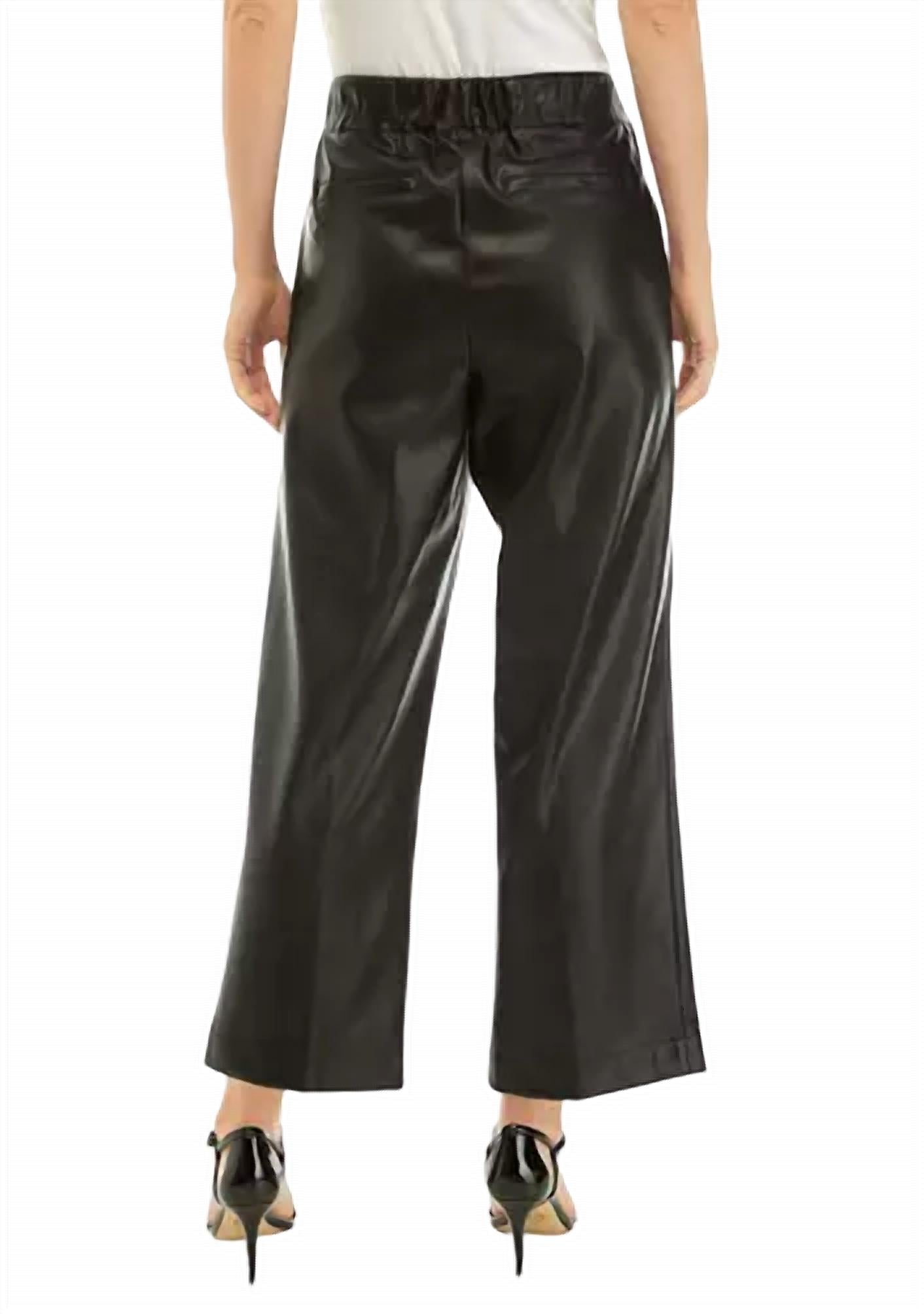 Faux leather wide-leg pants. Elastic back, fly front. Regular fit. Unlined. 28" Inseam. True to size. Machine wash cold. 100% Polyester.