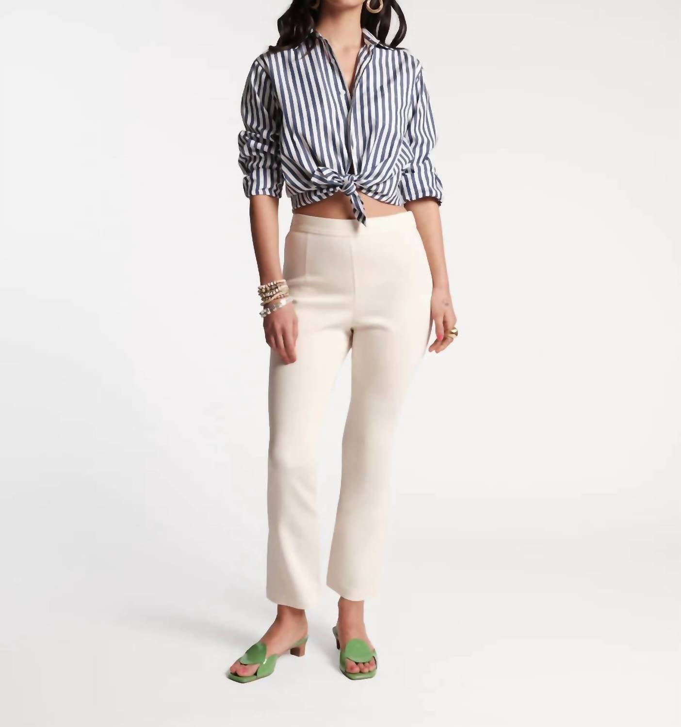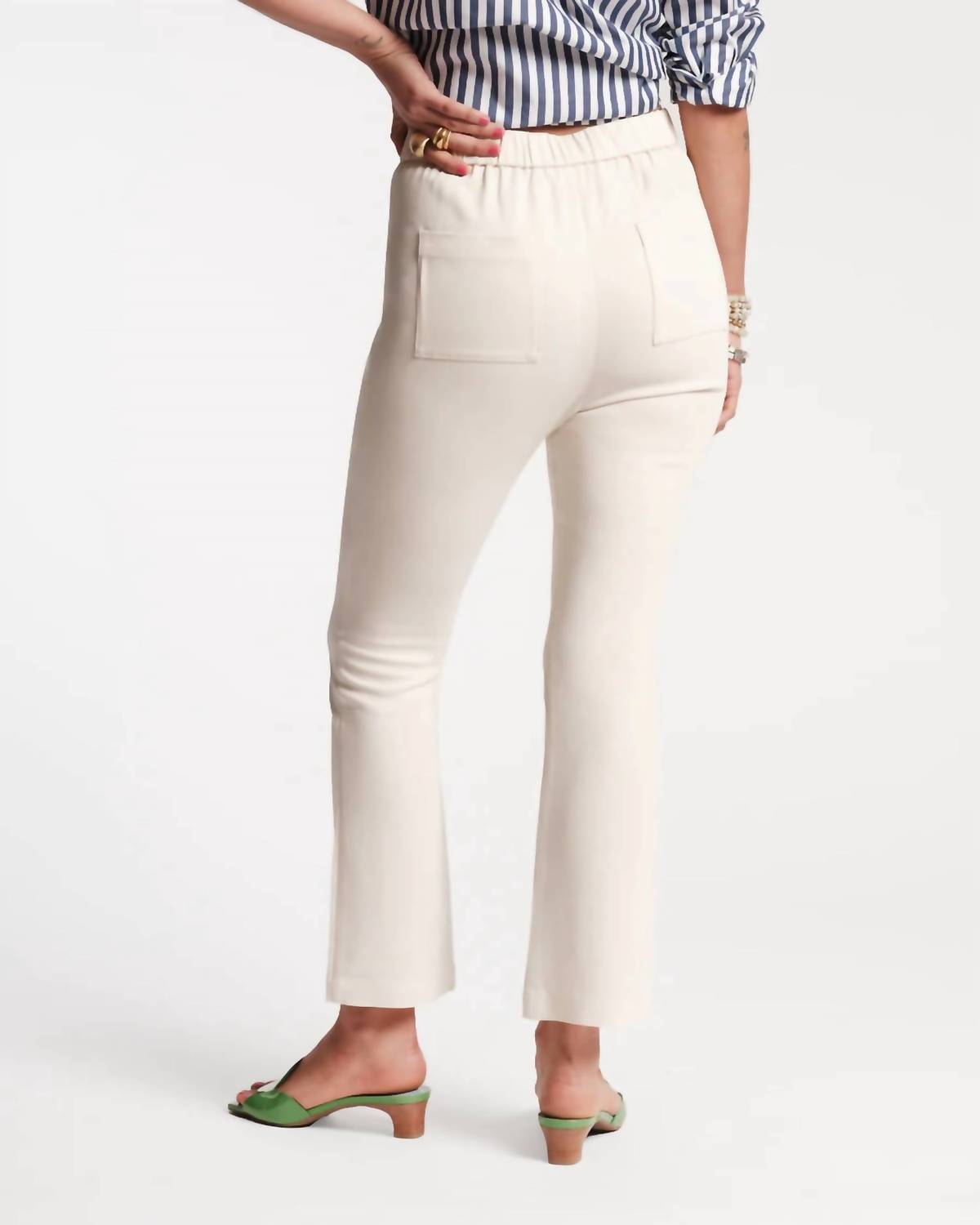 Upgrade your wardrobe with these cropped pants, designed to merge sophistication and wearability. The tailored fit ensures ultimate comfort during long days or nights out. Elevate your wardrobe with the High Rise Quincy Pants by Frances Valentine, designed for the modern professional. These women's pants feature a high-rise fit and a slightly boot-cut cropped silhouette with two back pockets. Crafted from a comfortable Viscose Blend, they offer a flattering fit and effortless movement. Closure: Pull-on design. Perfect for spring workwear in solid white.