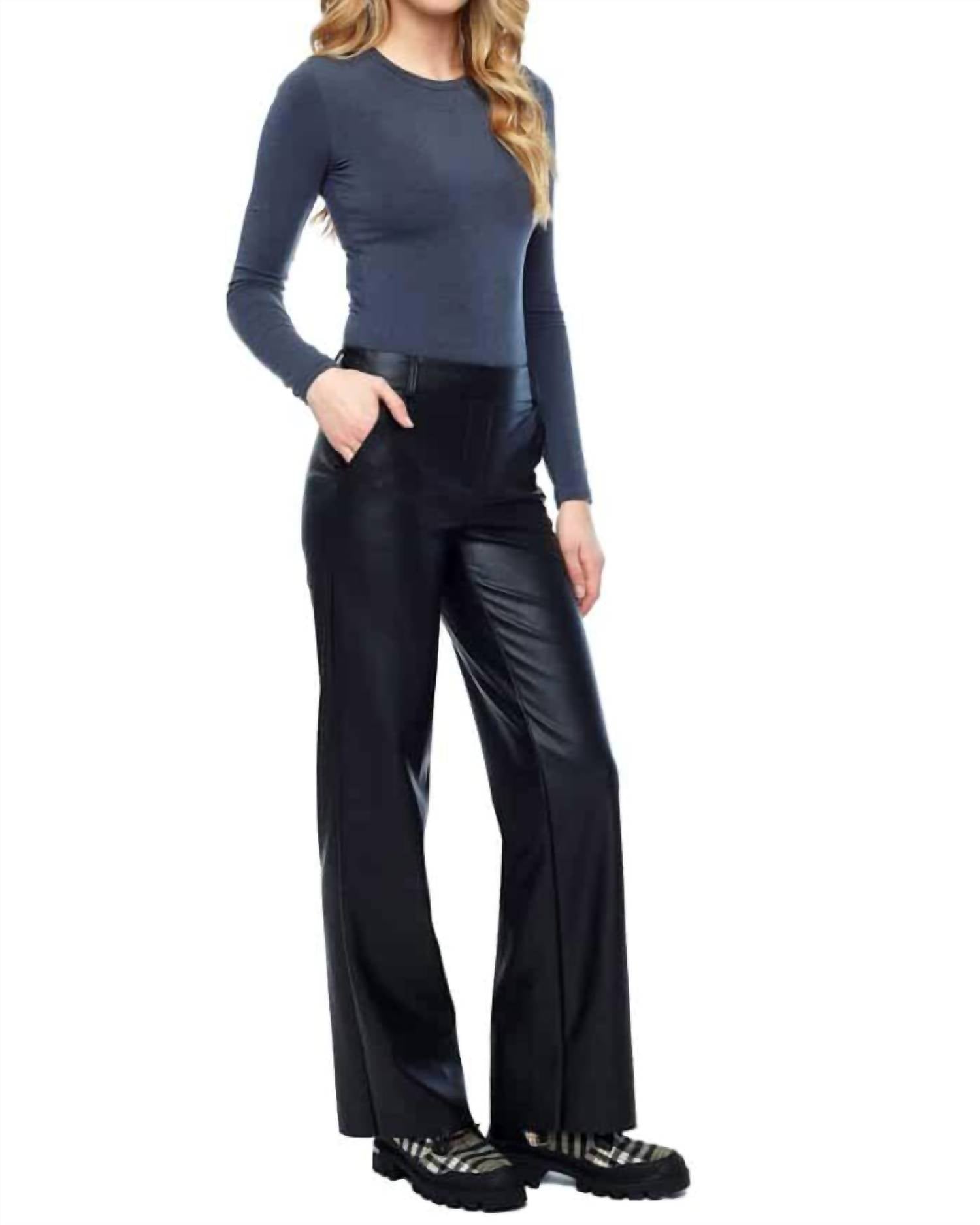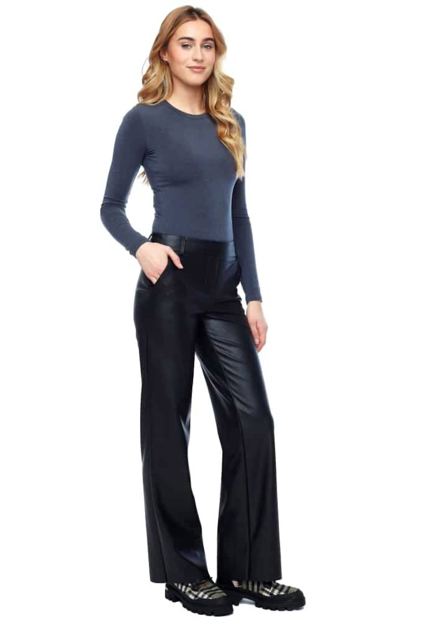 Women’s faux leather ankle pant. Relaxed fit, straight leg. Inseam: 32″. Front rise: 9 3/4″. Pull-on elastic waistband. Belt loops. Angled side pockets. Faux fly. Vegan Soft Pleather: 100% Polyester. Turn inside out, machine wash cold, gentle cycle, do not bleach, lay flat to dry, iron low on reverse if needed. Made in Canada. Style #: 226012.