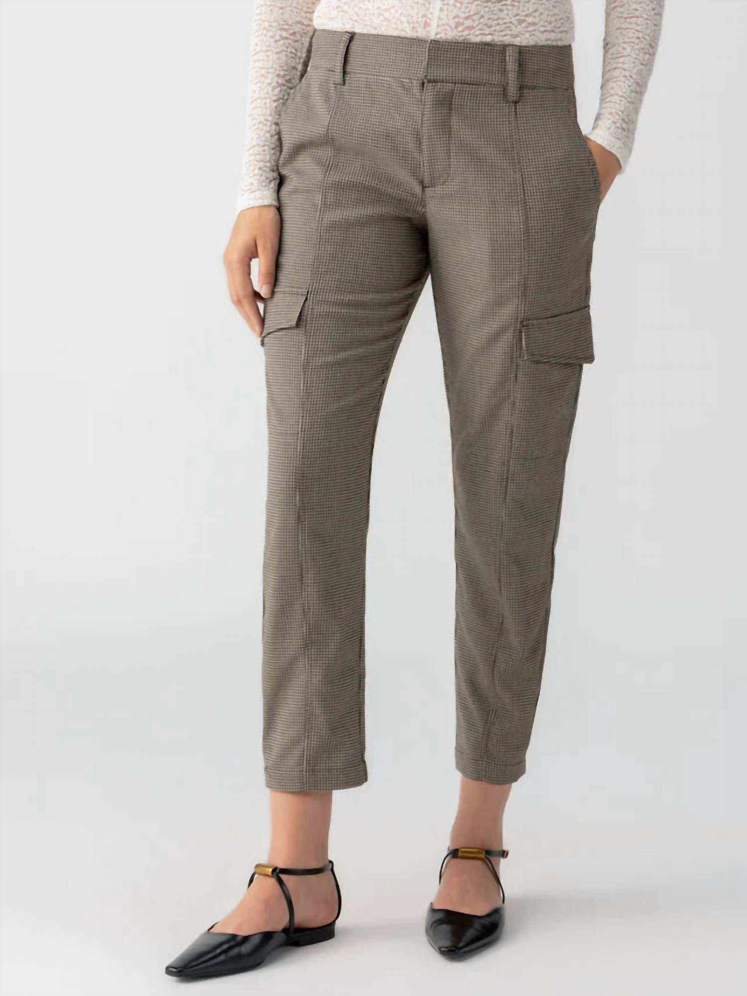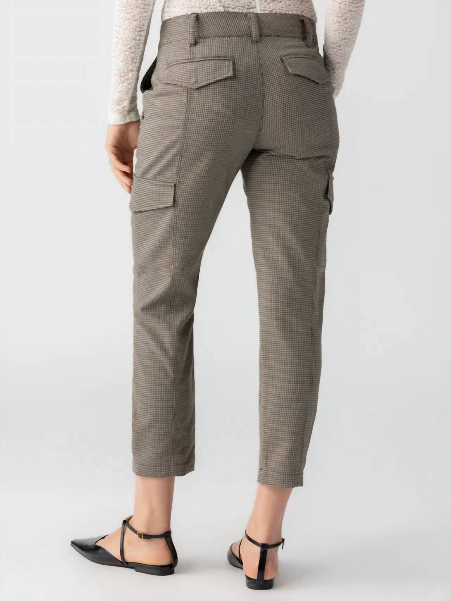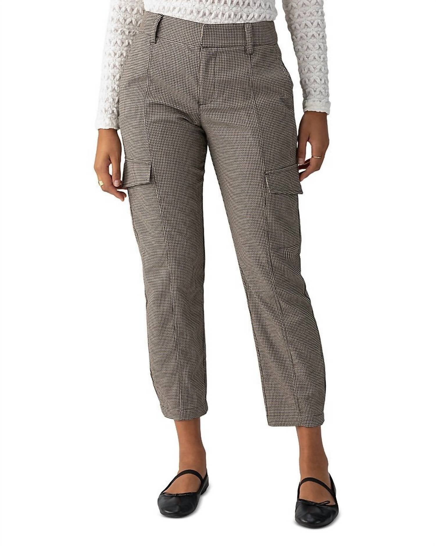 Upgrade your wardrobe with these cropped pants, designed to merge sophistication and wearability. The tailored fit ensures ultimate comfort during long days or nights out. Introducing the Polished Cargo Ankle Pant by Sanctuary, a must-have for the modern woman's spring wardrobe. These pants, adorned in a compact houndstooth pattern, feature a relaxed fit with a straight leg for effortless style. Designed with practicality in mind, they include belt loops, a zip and hook and bar closure, and multiple pockets: 2 front, 2 side cargo, and 2 back pockets. Crafted for ease of care, simply machine wash and tumble dry these versatile pants, ideal for travel or Thanksgiving gatherings.