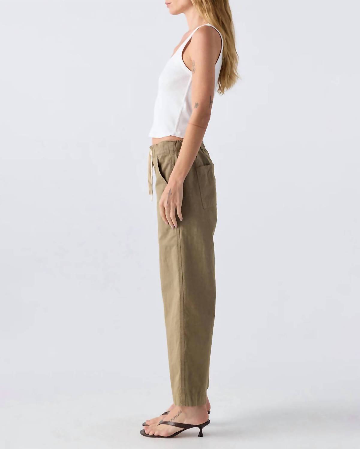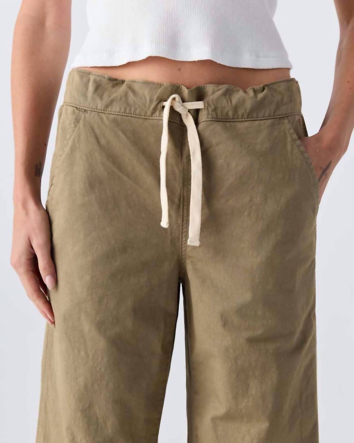 Stay on-trend and showcase your impeccable taste with these adaptable and stylish cropped pants. The perfect length to wear with your favorite mules. You'll love the fit! Experience the effortless style of the AMO Marian Pant in Thyme, a must-have for your summer travel wardrobe. These mid-rise, relaxed-fit pants feature a comfortable drawstring waist and a straight-leg design with an ankle length for versatile wear. Crafted in the USA from a soft cotton blend of 70% Cotton, 27% Linen, and 3% Lycra, they offer a garment-dyed finish that adds a vintage-inspired charm. Inseam measures 27", with a front rise of 11.25", and they are designed with functional pockets and a convenient pull-on closure. Care instructions are simple, allowing you to machine wash cold and tumble dry.